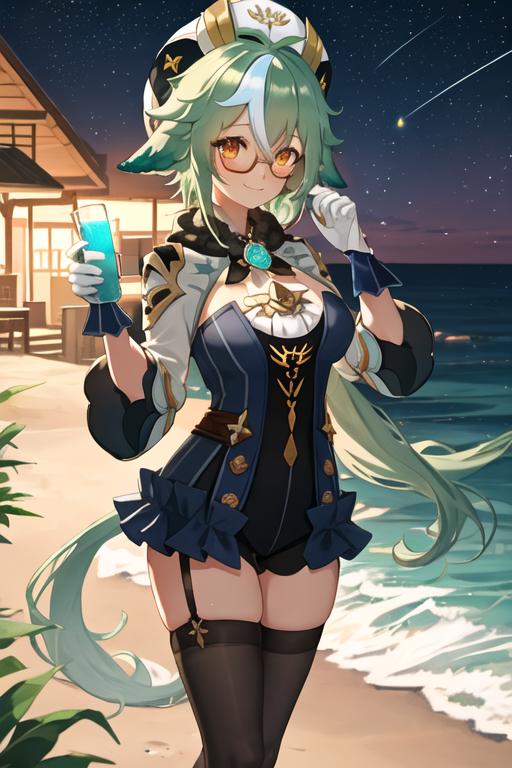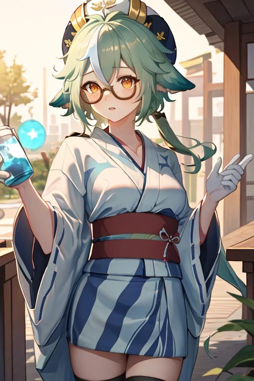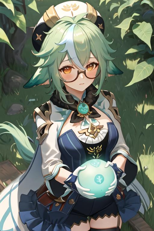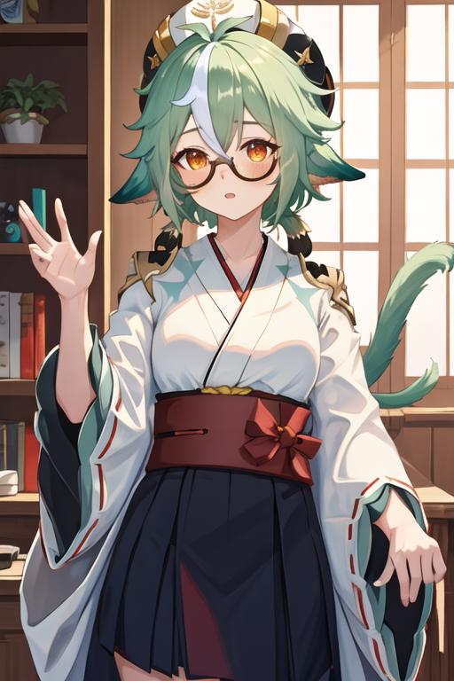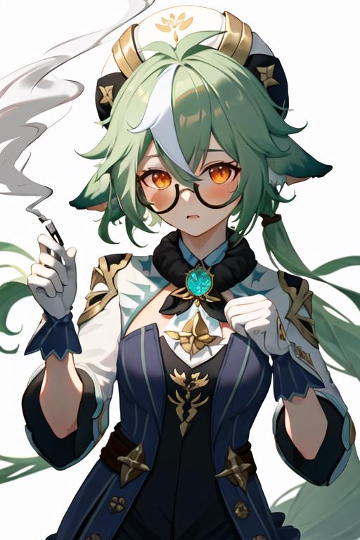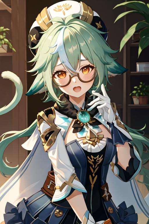 The trigger word is sucrose_genshin, and the recommended tags are best quality, masterpiece, highres, solo, {sucrose_genshin:1.15}, green_hair, animal_ears, glasses, semi-rimless_eyewear, hat, bangs, vision_\(genshin_impact\), blush, multicolored_hair, long_hair, hair_between_eyes, cat_ears, orange_eyes, breasts, yellow_eyes.