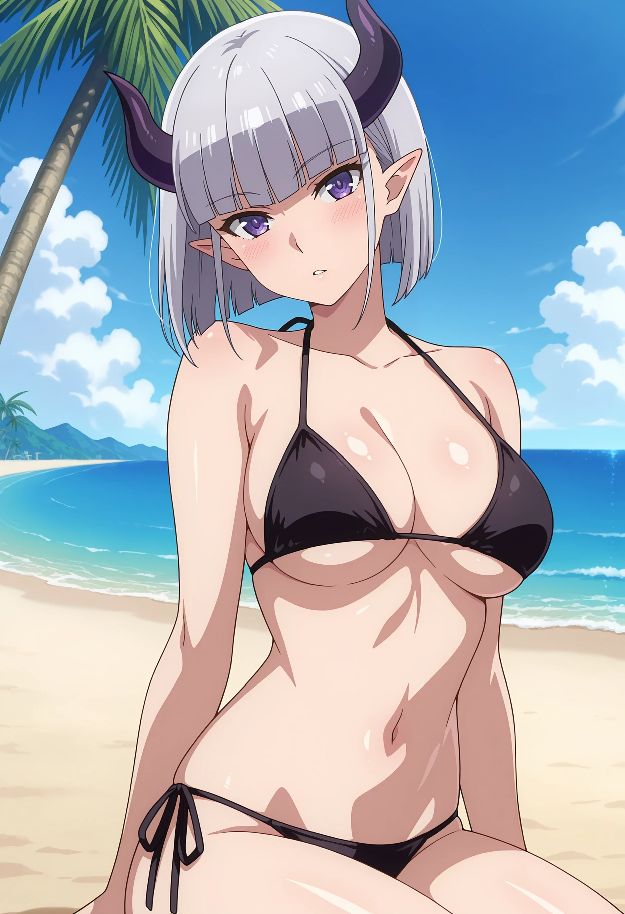 blunt bangs, short hair, grey hair, purple eyes, demon horns, pointy ears