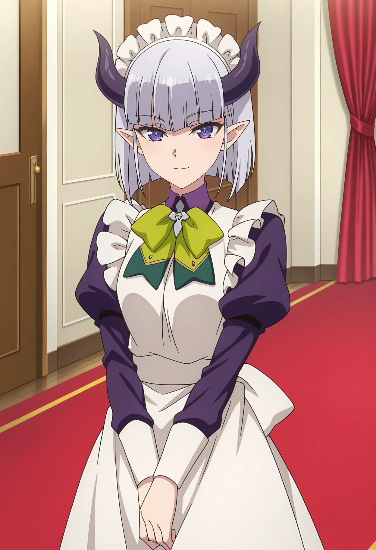 maid headdress, purple dress, frilled apron, white apron, green bowtie, juliet sleeves
