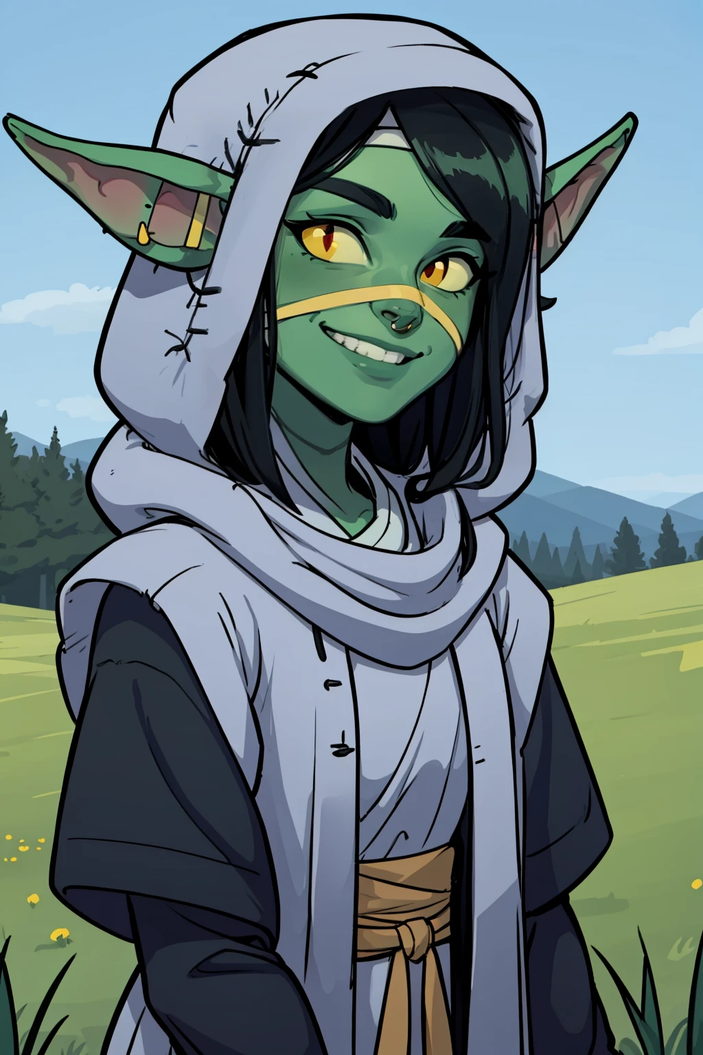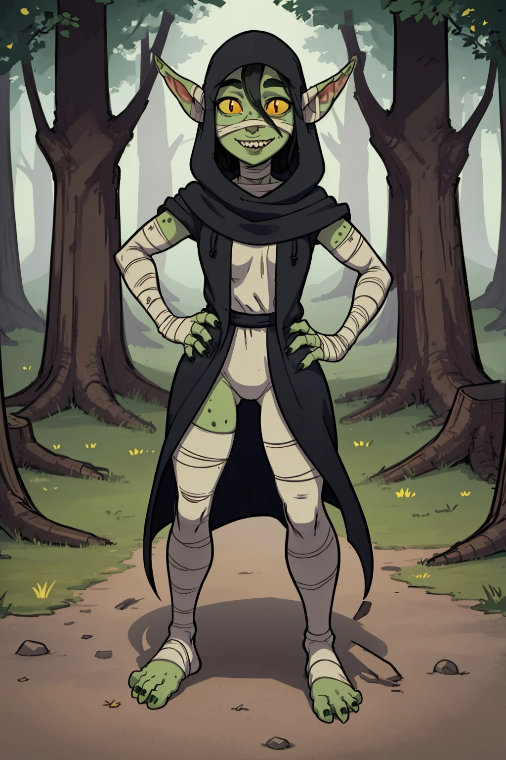 Basic prompts : 1girl, black hair, long hair, yellow eyes, colored sclera, pointy ears, colored skin, green skin, shortstack, hood, sharp teeth, bandages, cloak, toeless legwear