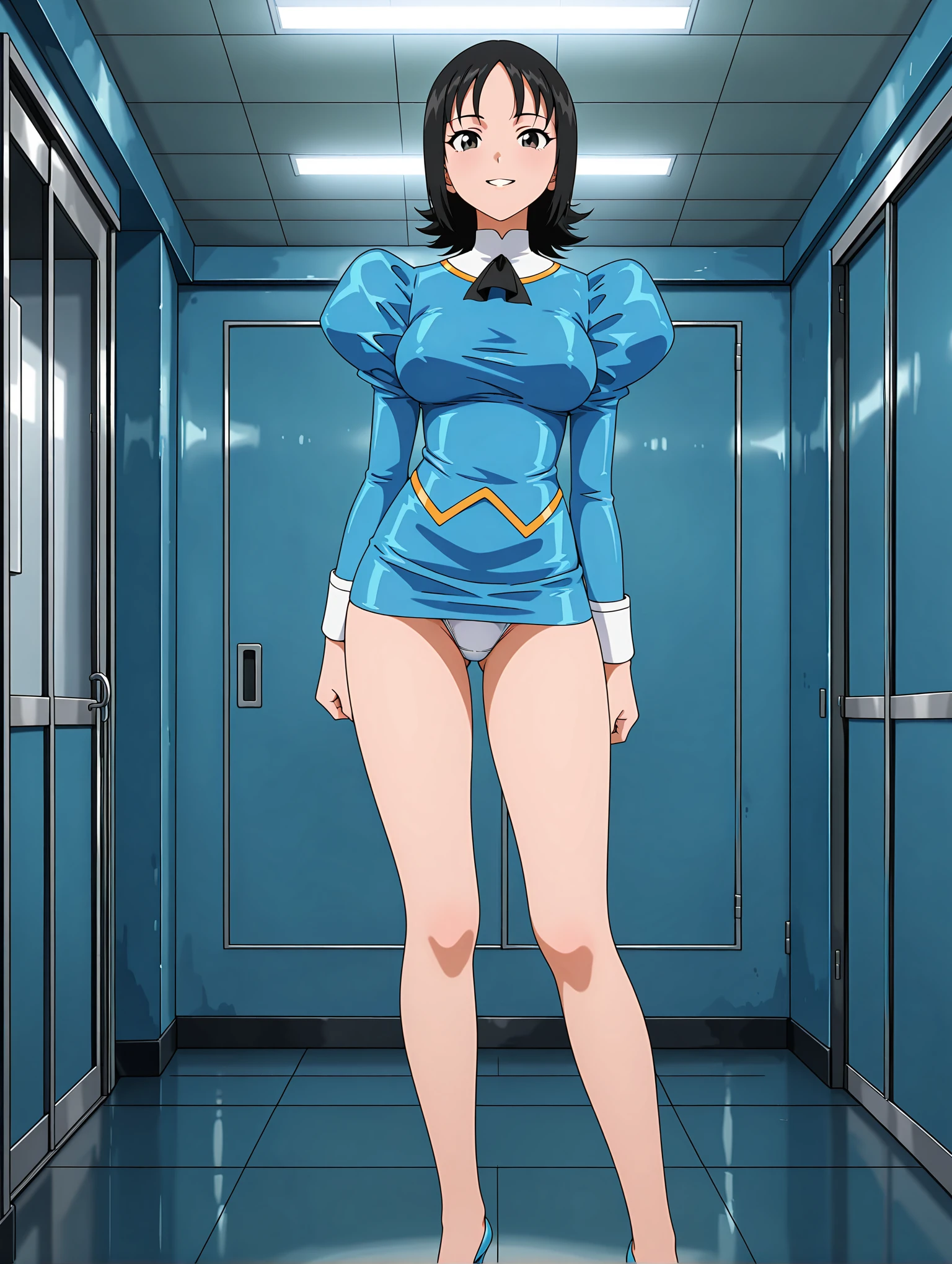 b_clothes,black ascot,blue dress,juliet sleeves,long sleeves,blue pencil_skirt,white panties,no socks,blue high heels,