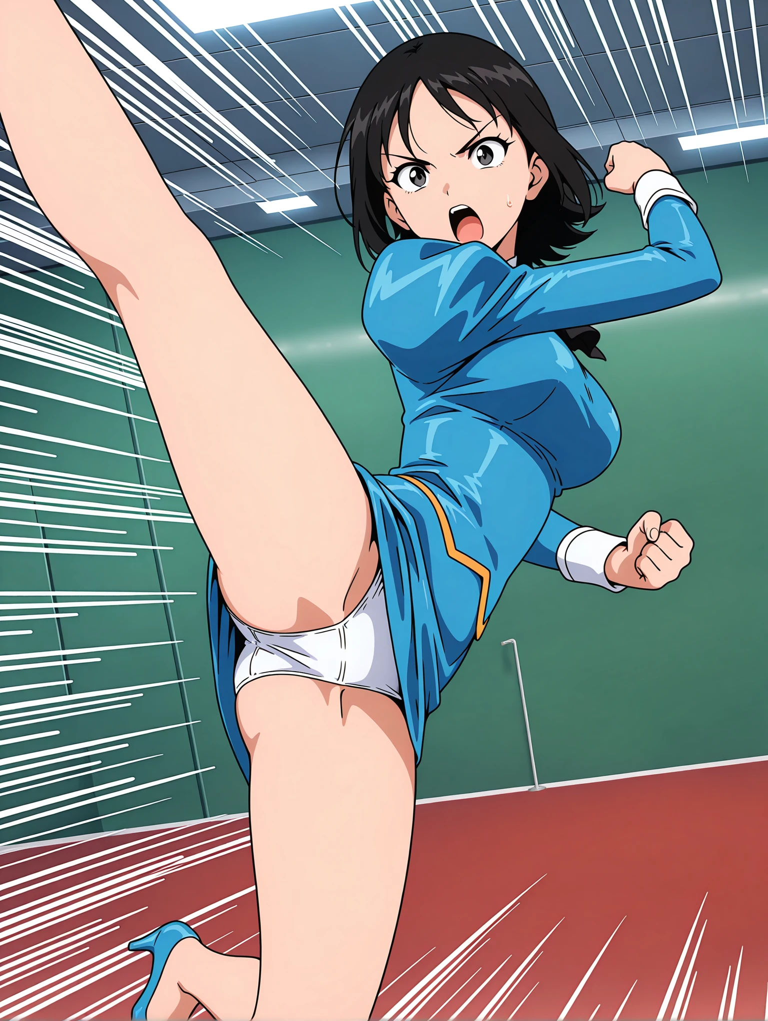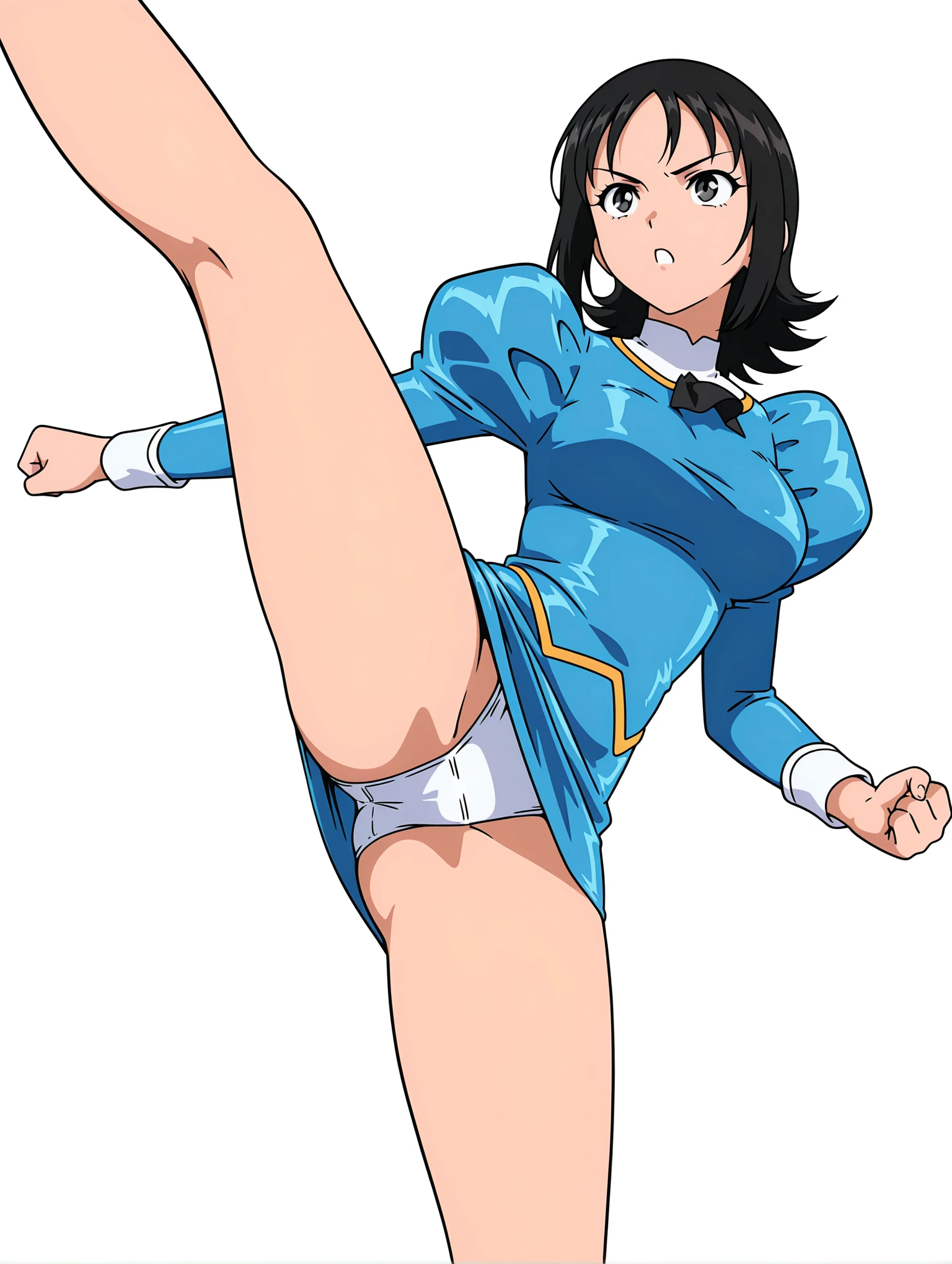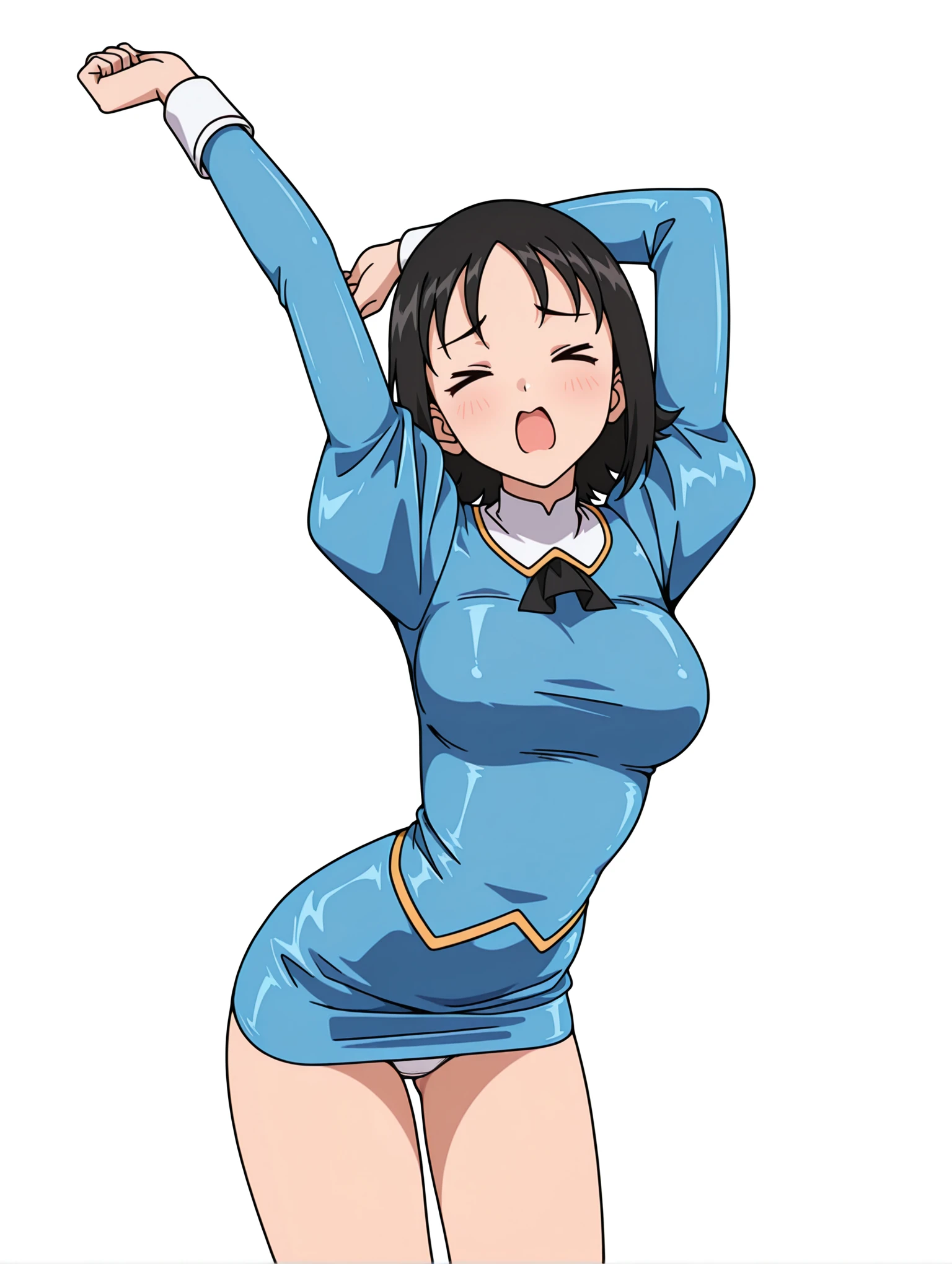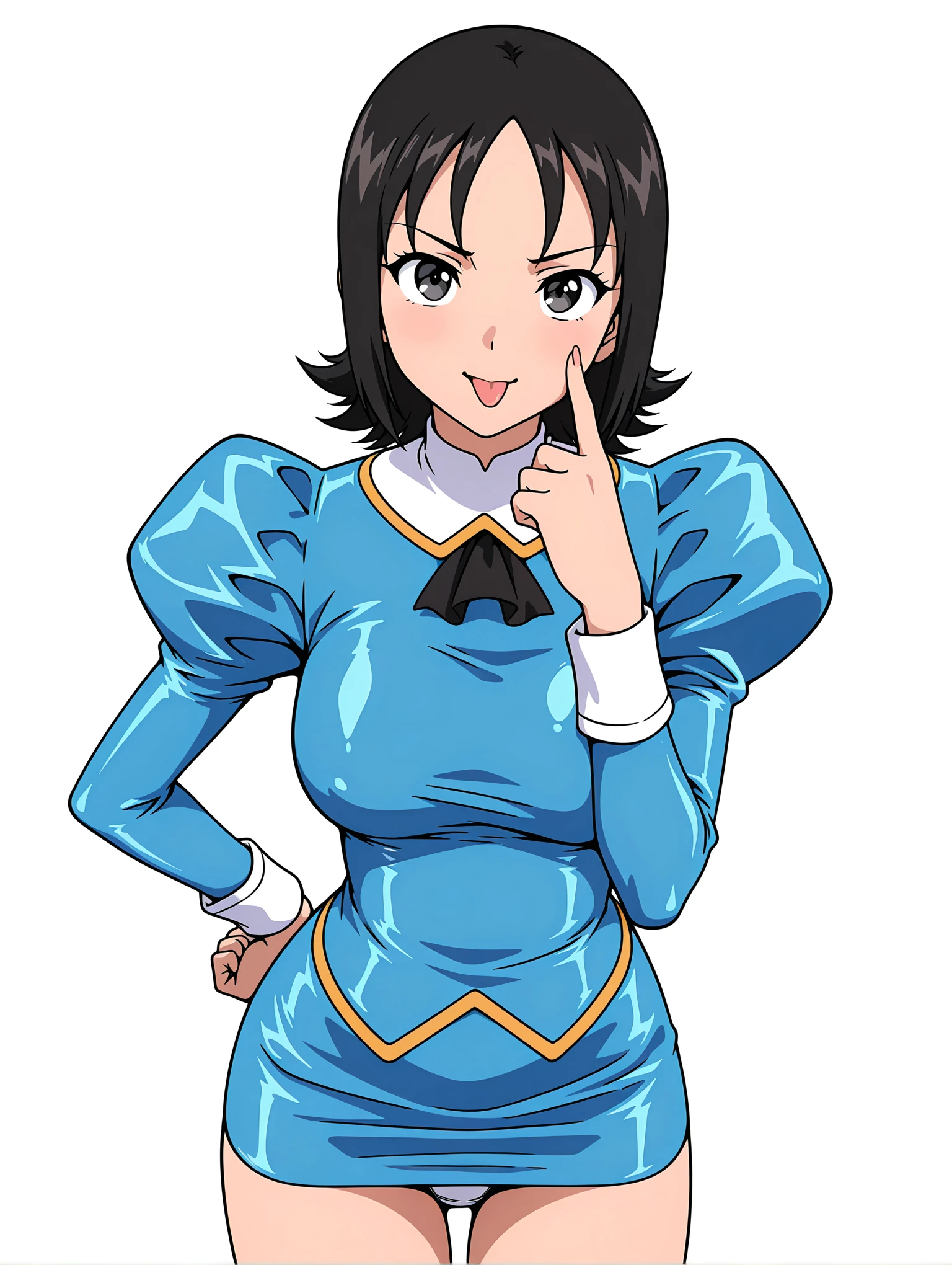 衣装ワード ・b_clothes,black ascot,blue dress,juliet sleeves,long sleeves,blue pencil_skirt,white panties,no socks,blue high heels,