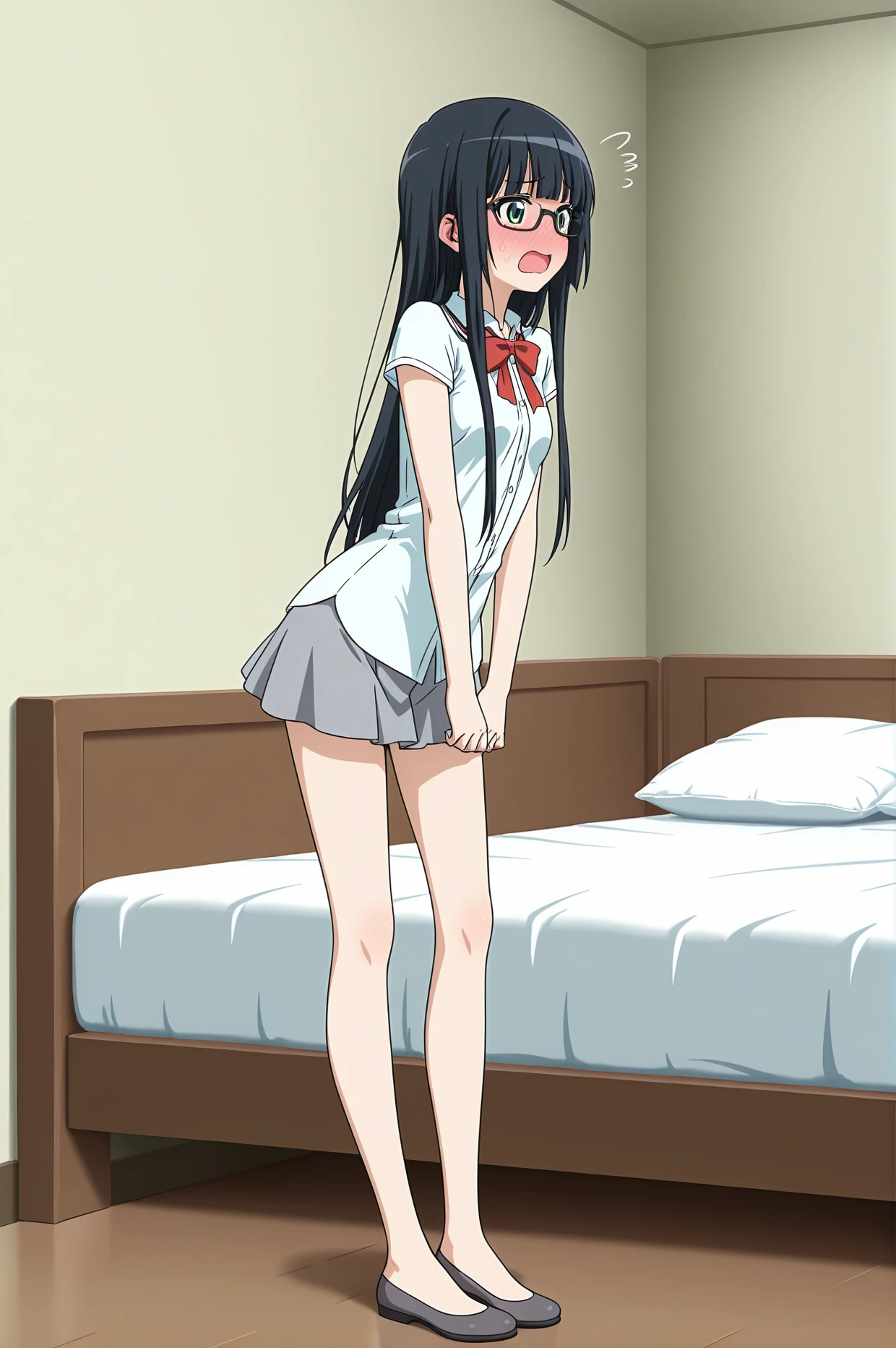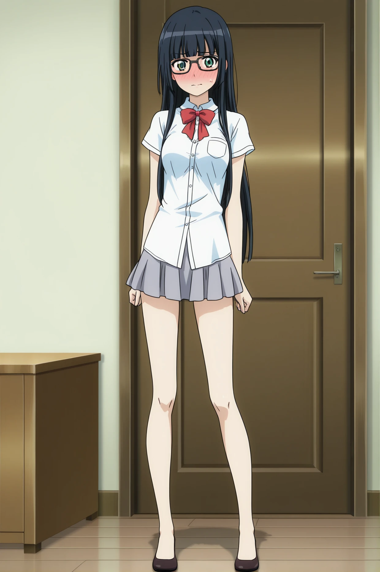 white shirt short sleeves red bowtie grey mini skirt