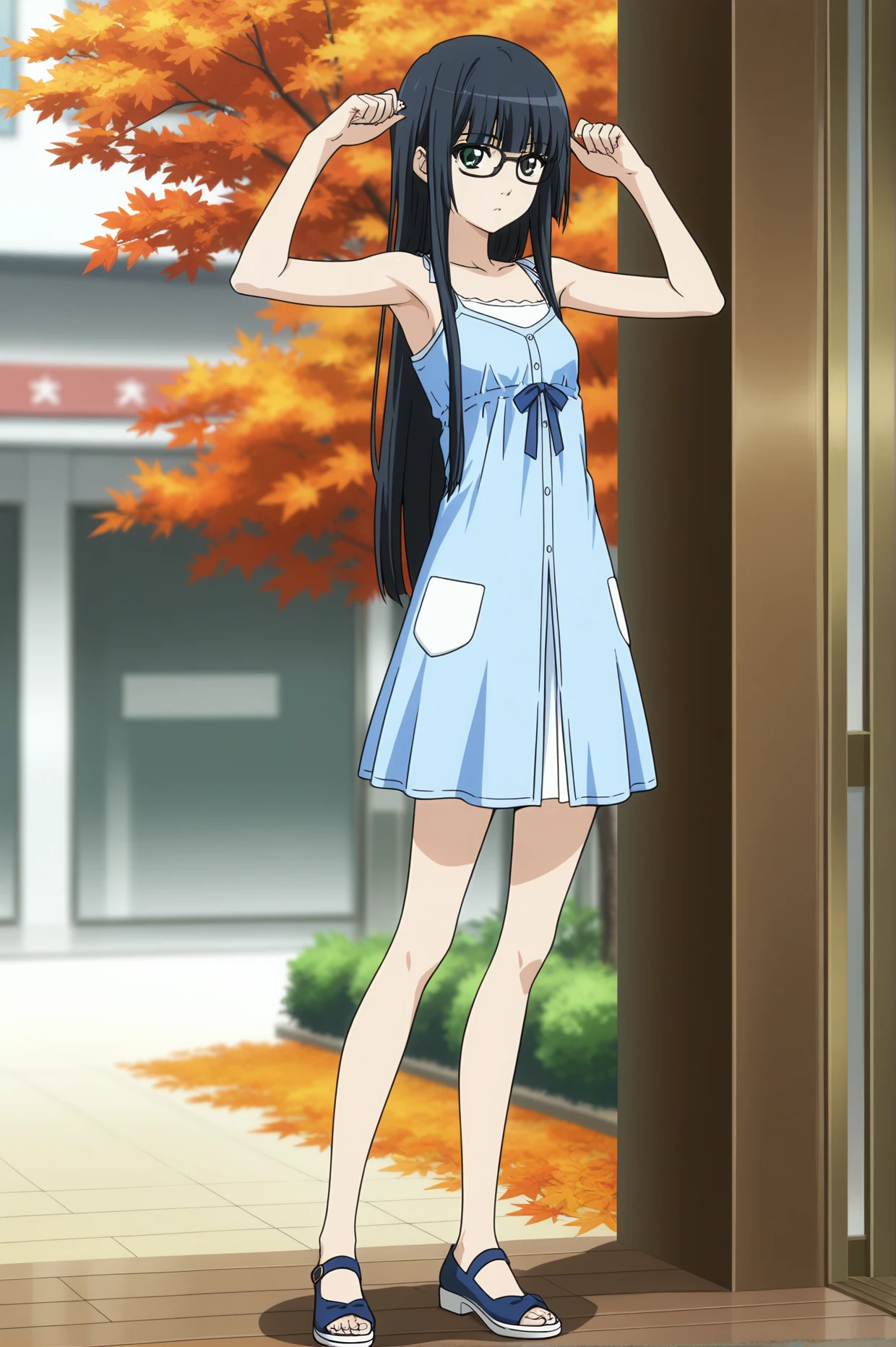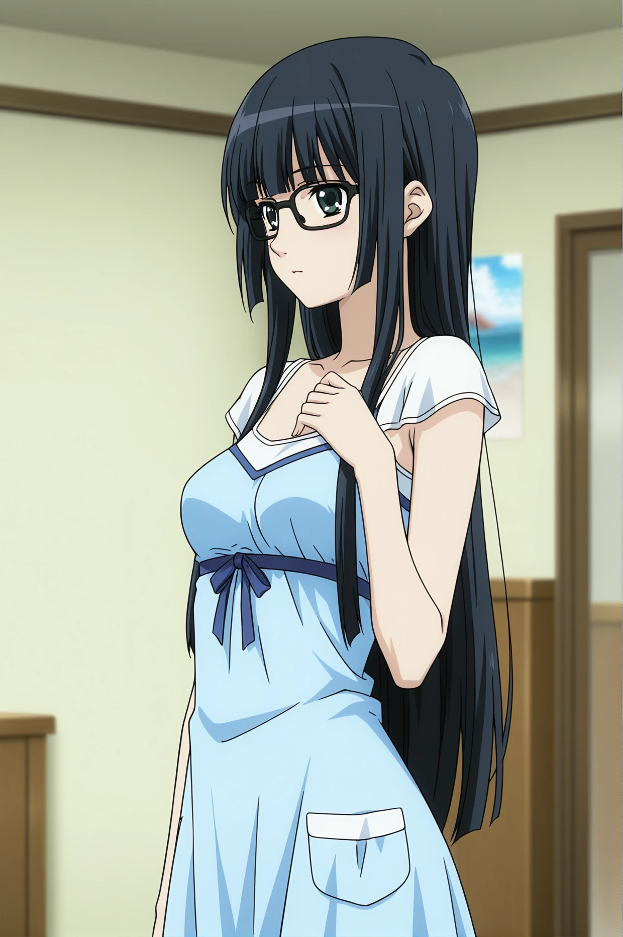 cpc-aoi, black hair, blunt bangs, long hair, green eyes, black glasses,