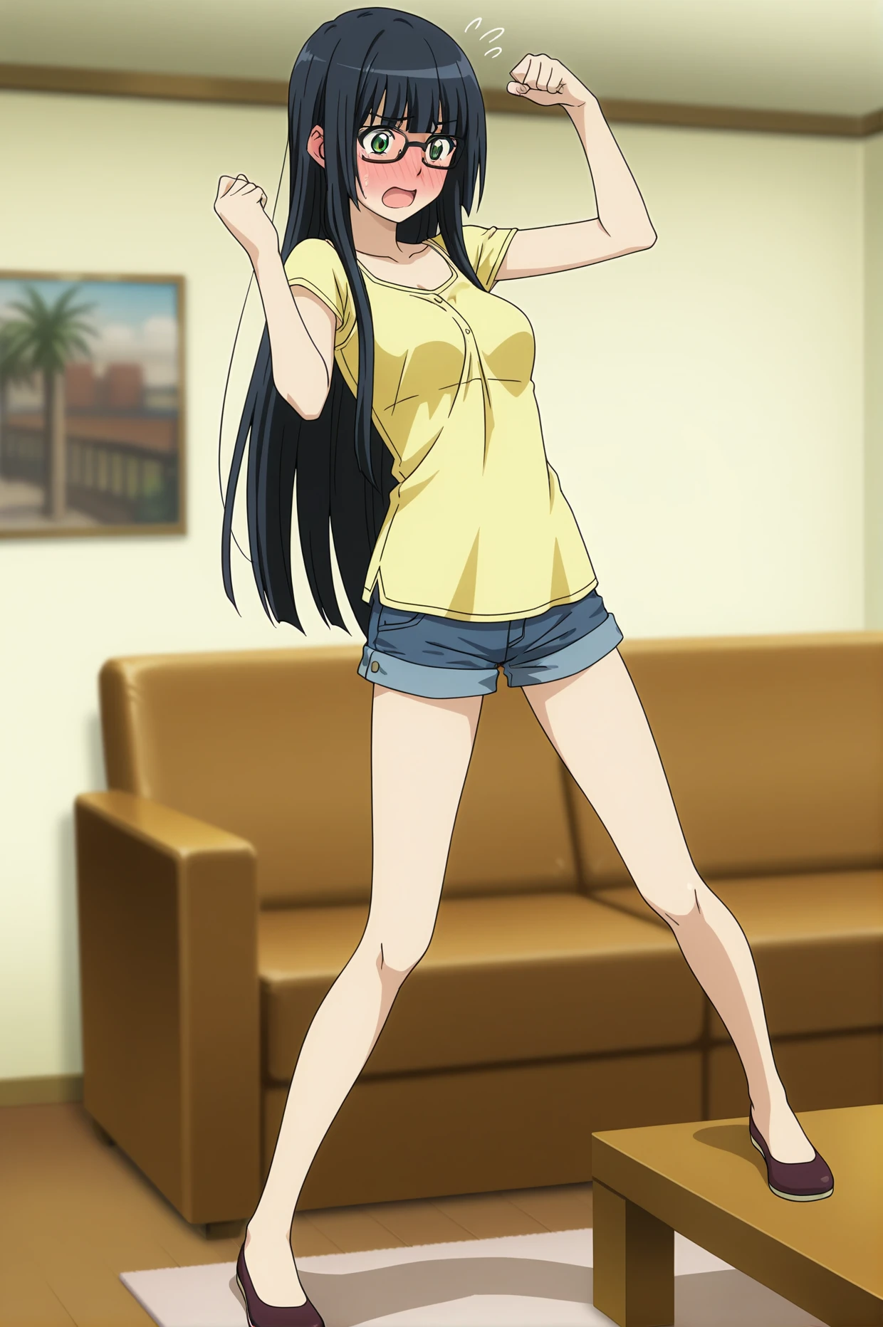 denim shorts yellow shirt