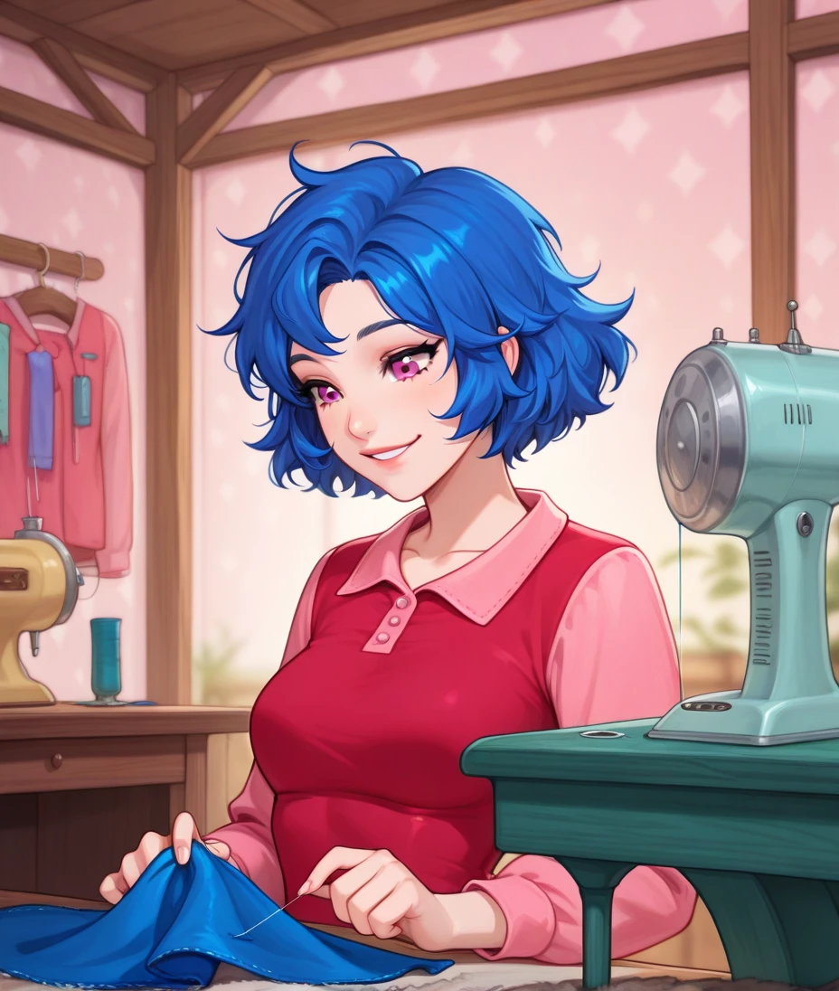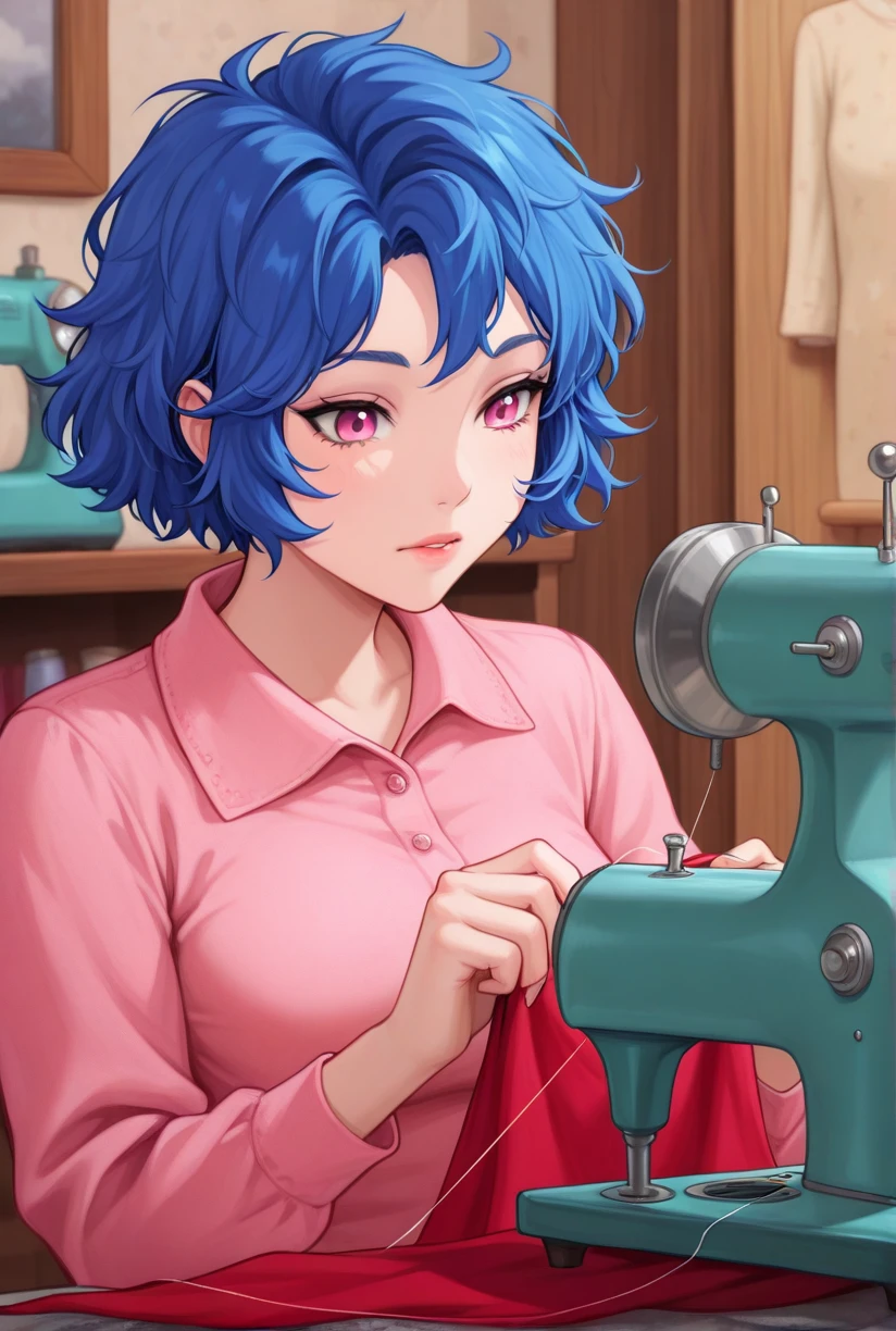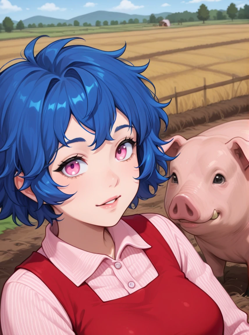 Optional words that may help: blue hair, messy hair, short hair, pink eyes, parrot