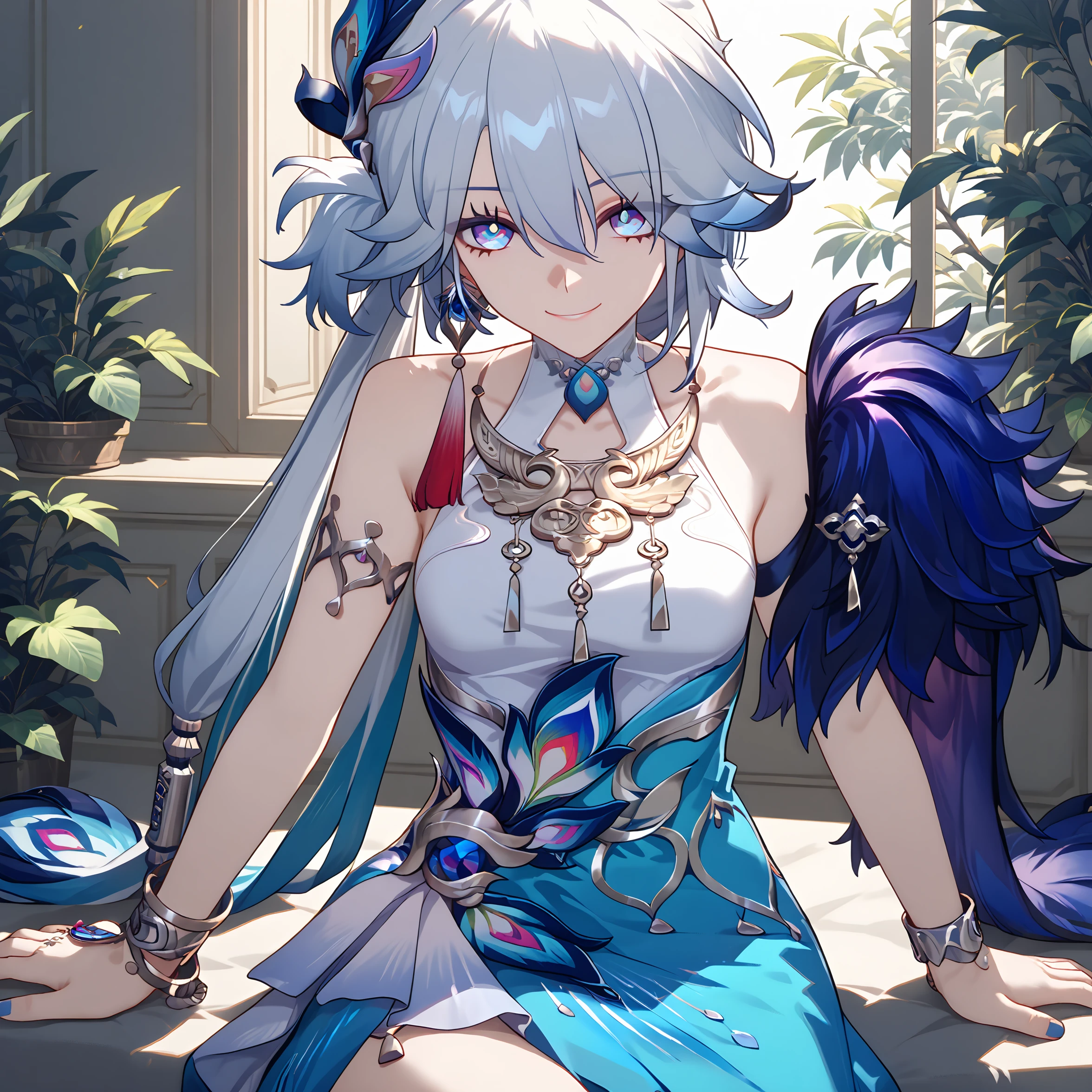 score_9, score_8_up, score_7_up, source_anime, masterpiece, best quality, newest, absurdres, highres, Yaoguang, 1girl, (solo:1.3), adult, mature, tall, hair ornament, long hair, bracelet, dress, bare shoulders, feather, smile, looking at viewer, blue nail polish, elegant, ladylike,For full-body shots, you can try adding full body and high heels.