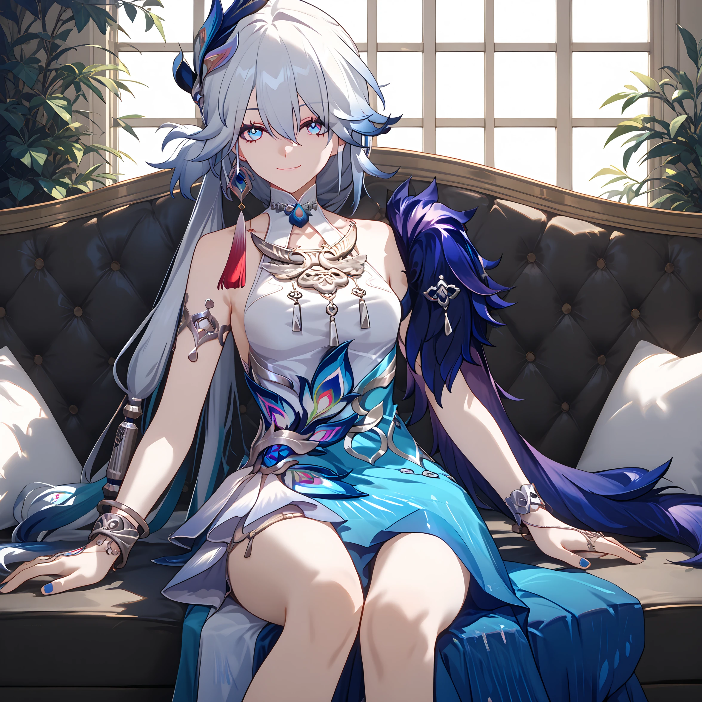 score_9, score_8_up, score_7_up, source_anime, masterpiece, best quality, newest, absurdres, highres, Yaoguang, 1girl, (solo:1.3), adult, mature, tall, hair ornament, long hair, bracelet, dress, bare shoulders, feather, smile, looking at viewer, blue nail polish, elegant, ladylike,全身可尝试添加full body, high heels 等。