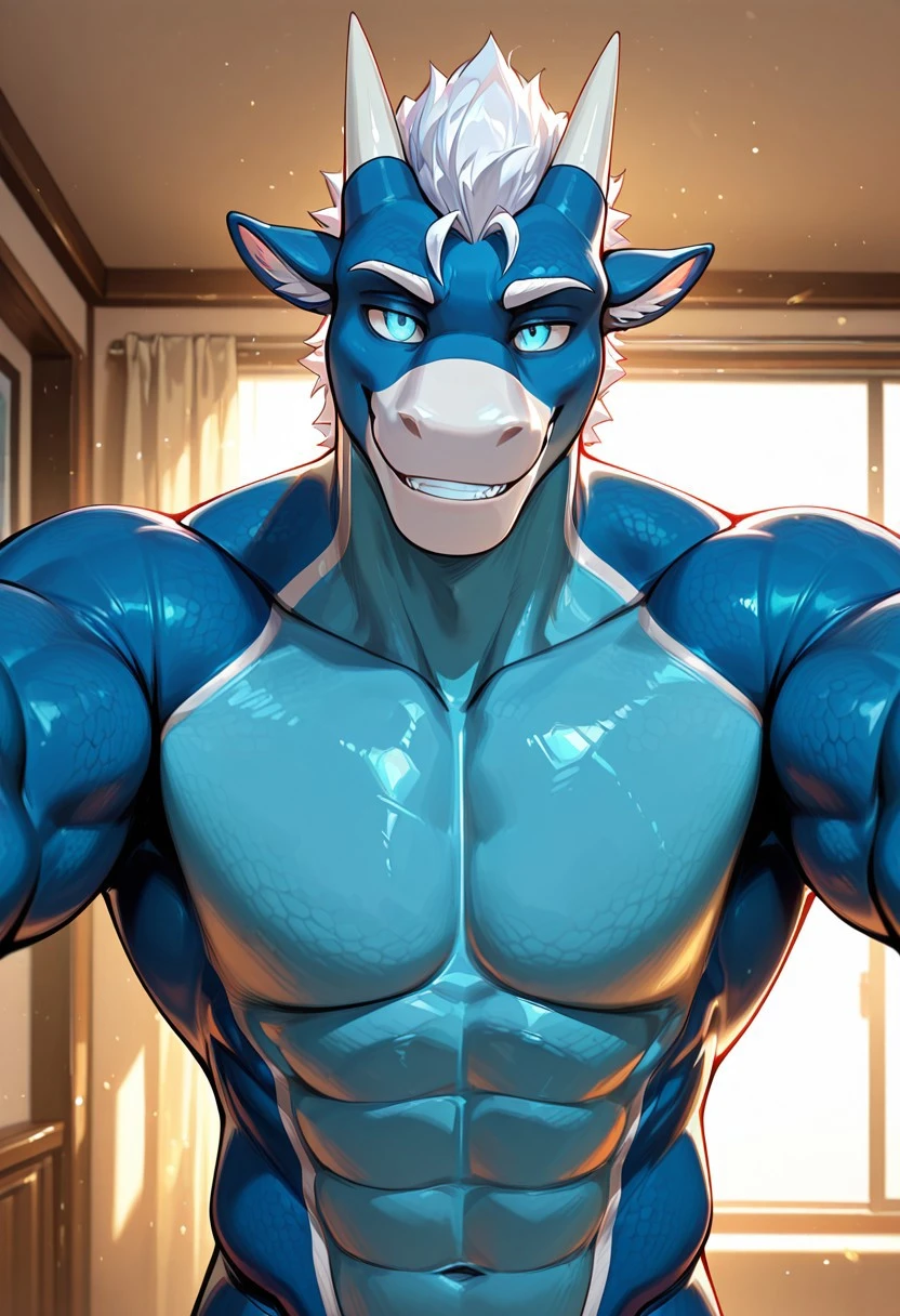N1ghdruth, 1boy, broad shoulders, mature male, light blue eyes, anthro, animal ears, horns, dragon, blue body, light underbelly, white hair, athletic build, muscular