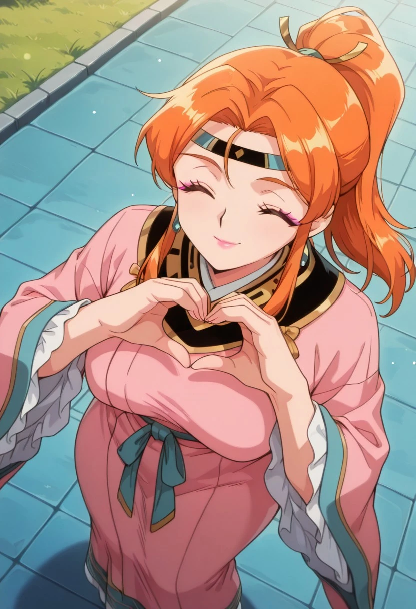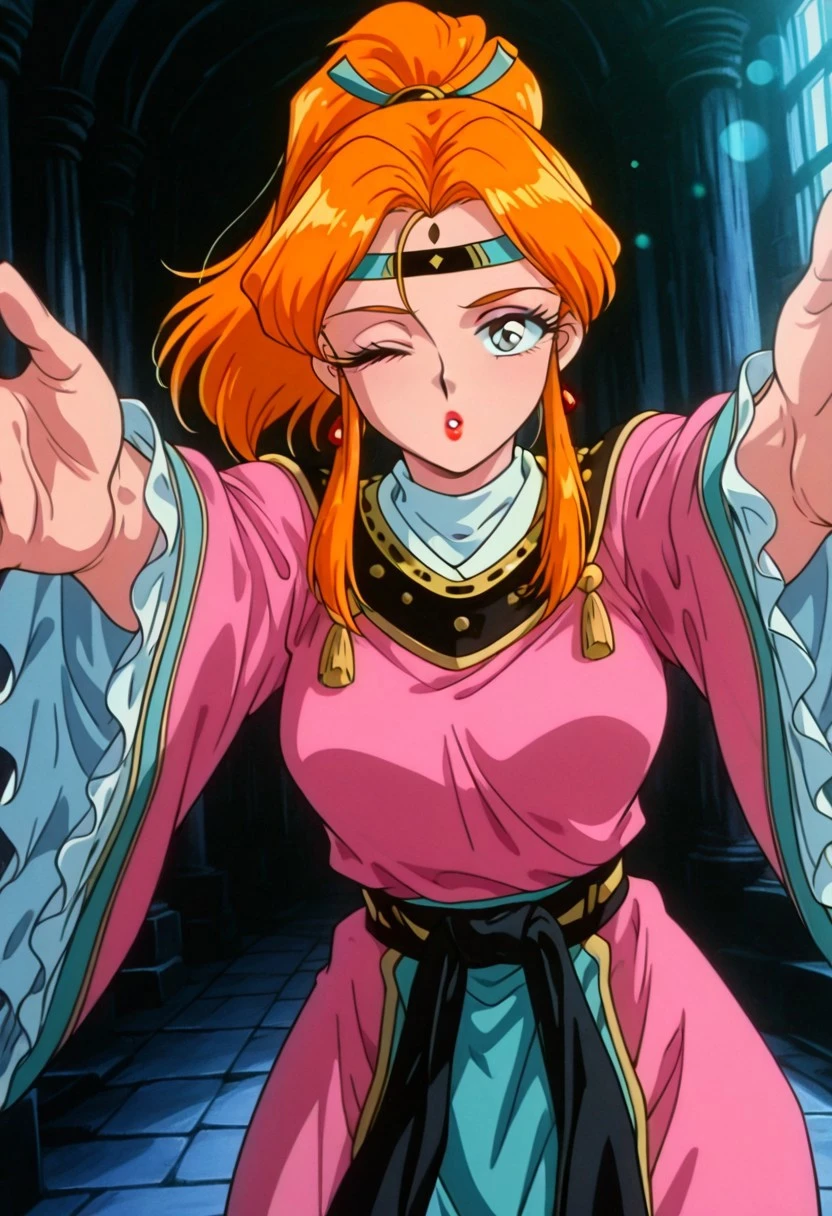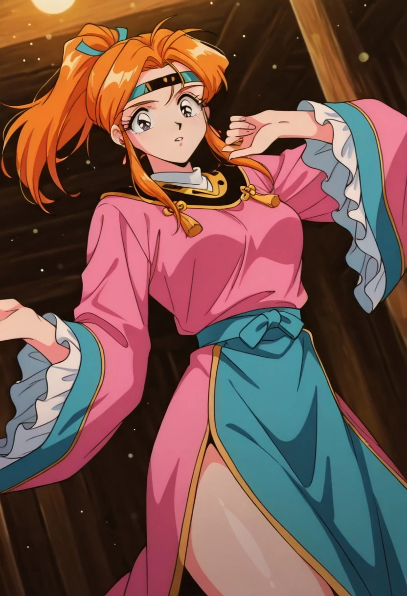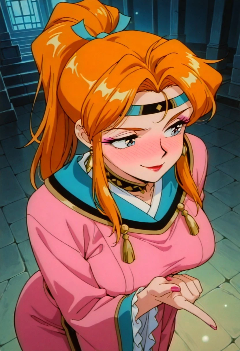ShimonGSGR, 1girl, solo, orange hair, long hair, ponytail, sidelocks, hair ornament, headband, large eyes, grey shiny pupils, lips, earrings, pink dress, large breasts, long wide sleeves, japanese clothes, thick thighs, wide skirt, frills, dress ornament, collar,