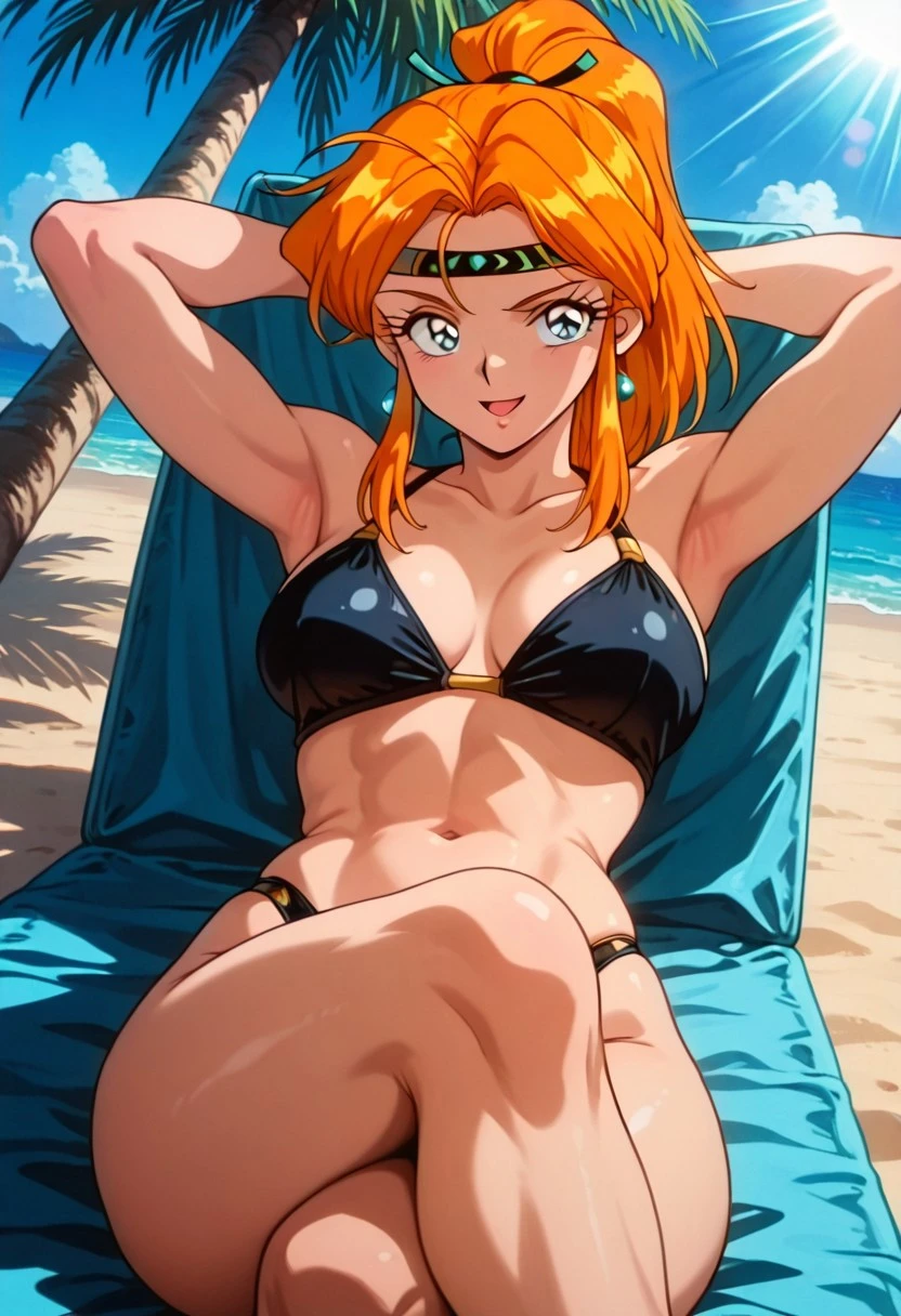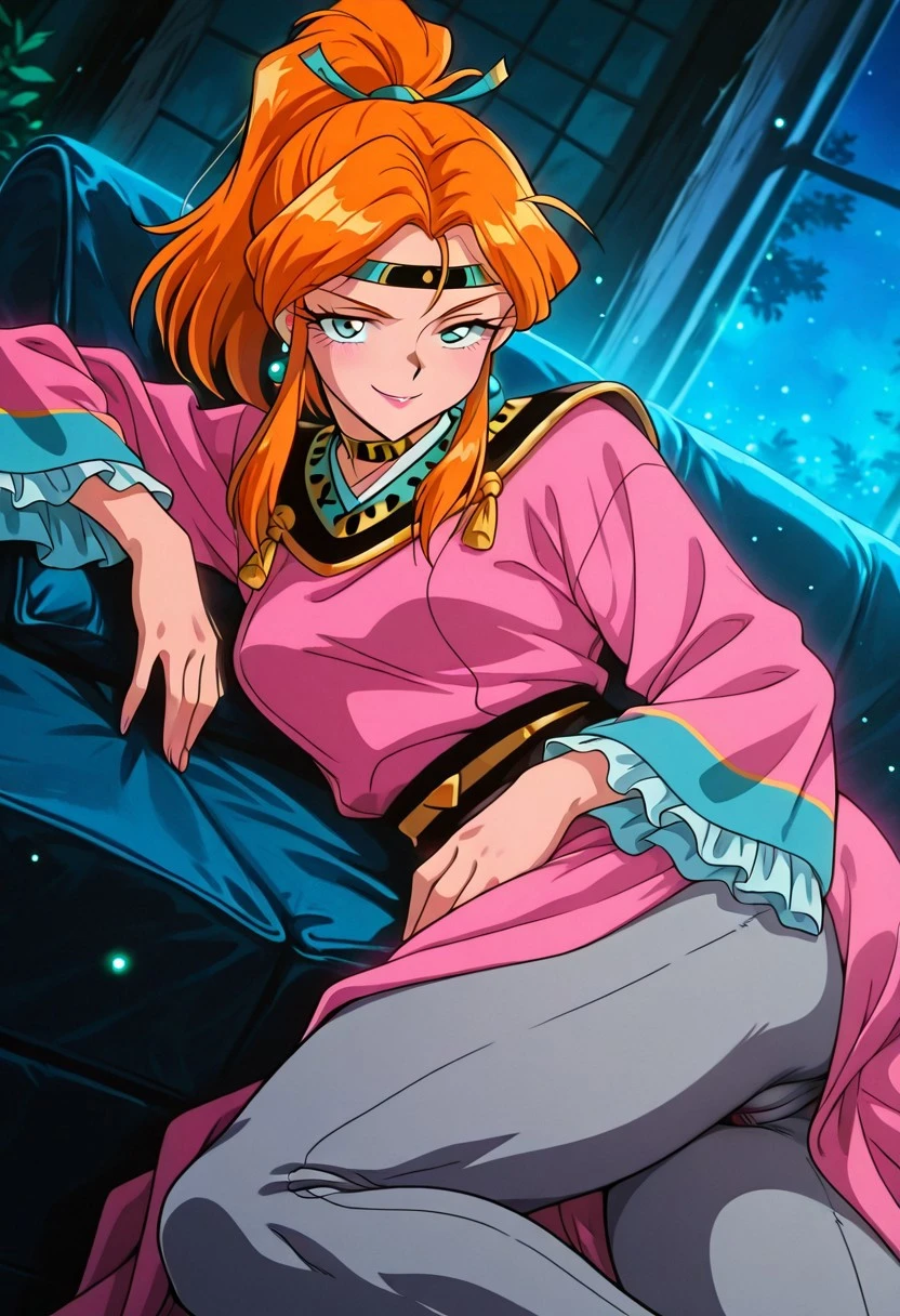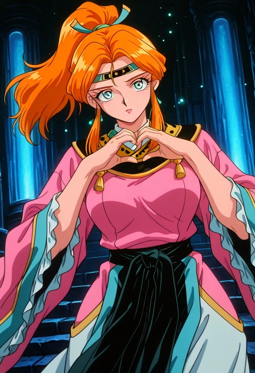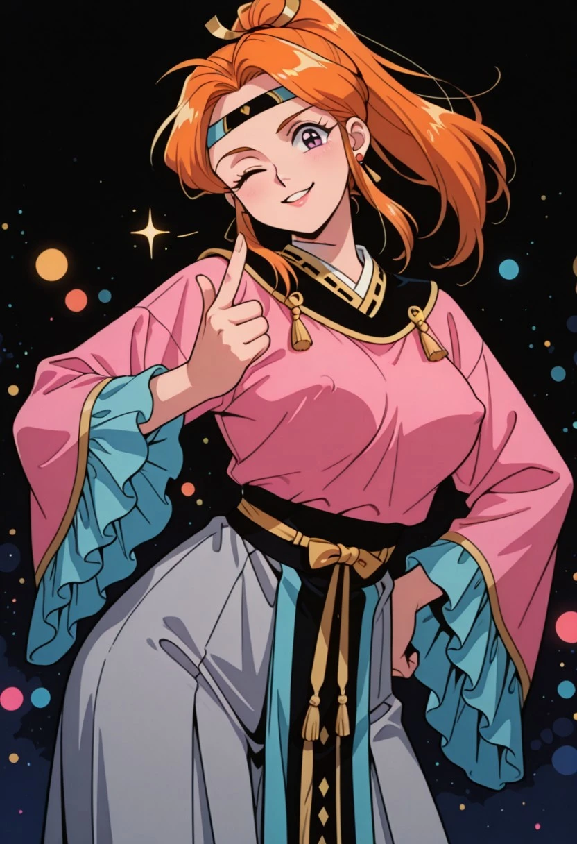 ShimonGSGR, 1girl, solo, orange hair, long hair, ponytail, sidelocks, hair ornament, headband, large eyes, grey shiny pupils, lips, earrings, pink dress, large breasts, long wide sleeves, japanese clothes, thick thighs, wide skirt, frills, dress ornament, collar,