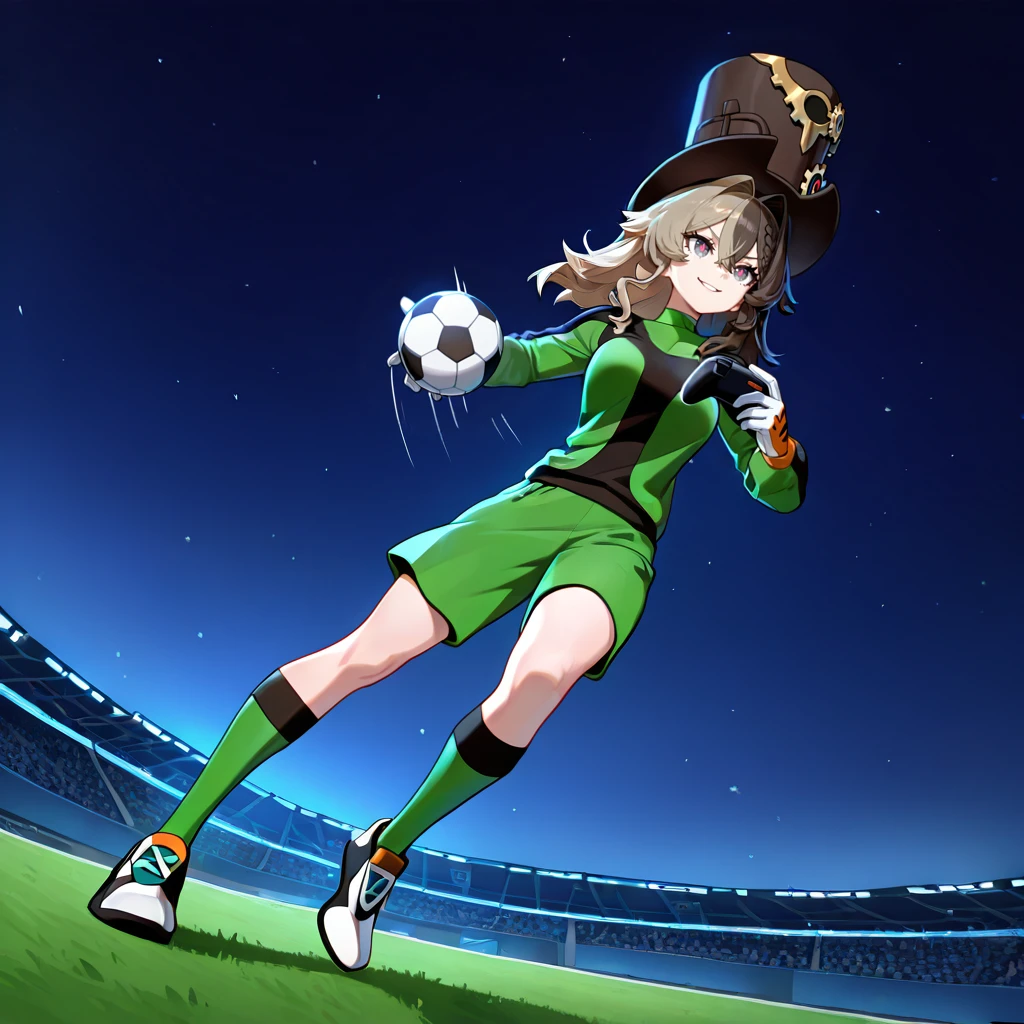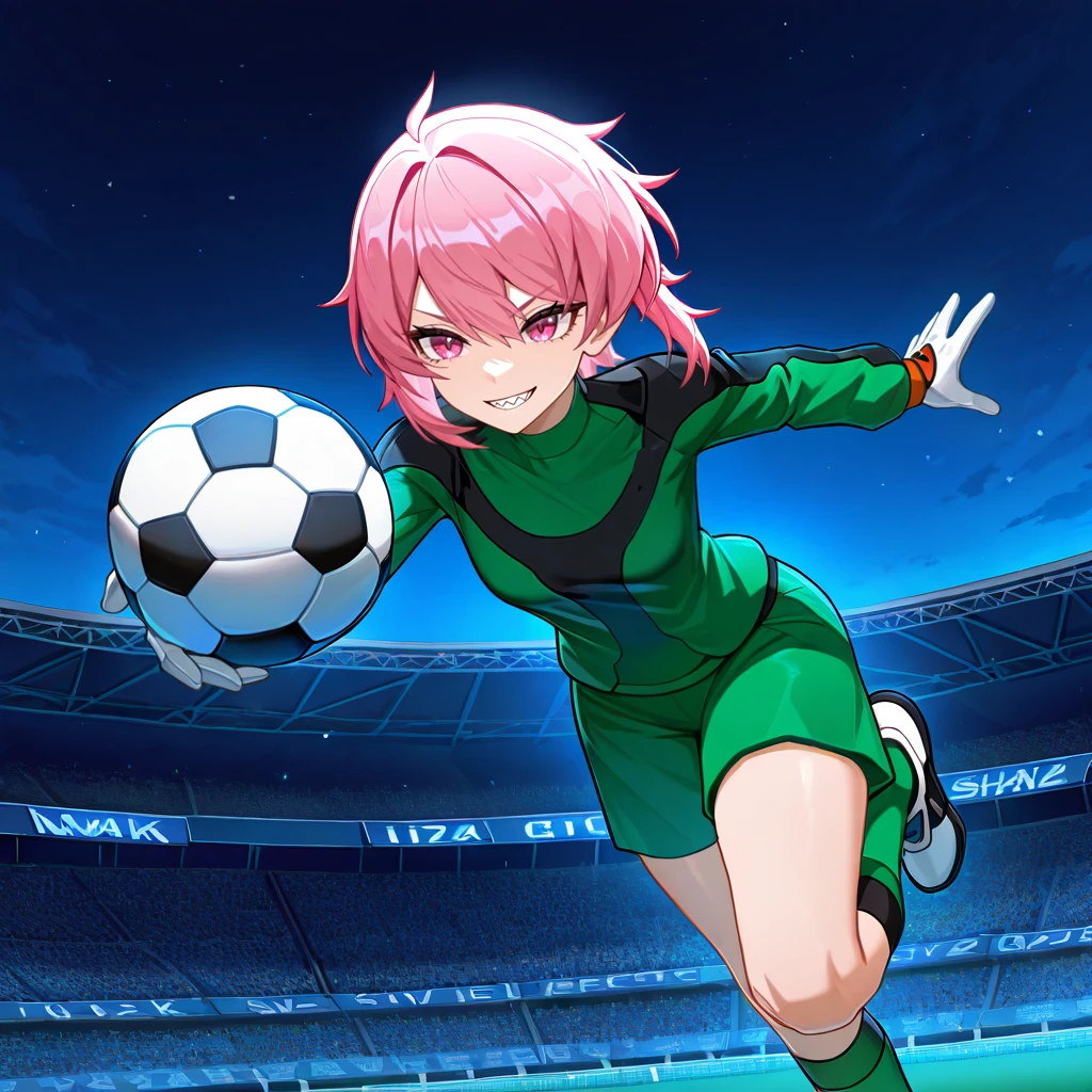 GKBT, sportswear, soccer uniform, green shirt, black trim, green shorts, gloves, soccer uniform, sneakers, socks, Optional: Add "lightning bolt symbol" for the uniform's mark.