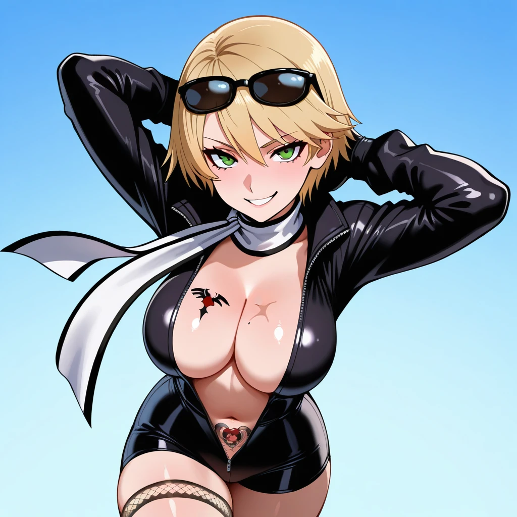 RRXX_Rowdy_Reiko, 1girl, solo, large breasts, (scar), (scar across eye), scar on face, green eyes, short hair, blonde hair, sunglasses, eyewear on head, cleavage, tattoo, mole on breast, white scarf, navel, gloves, open clothes, black bodysuit, no bra, unzipped, bare thighs, knee pads, knee boots