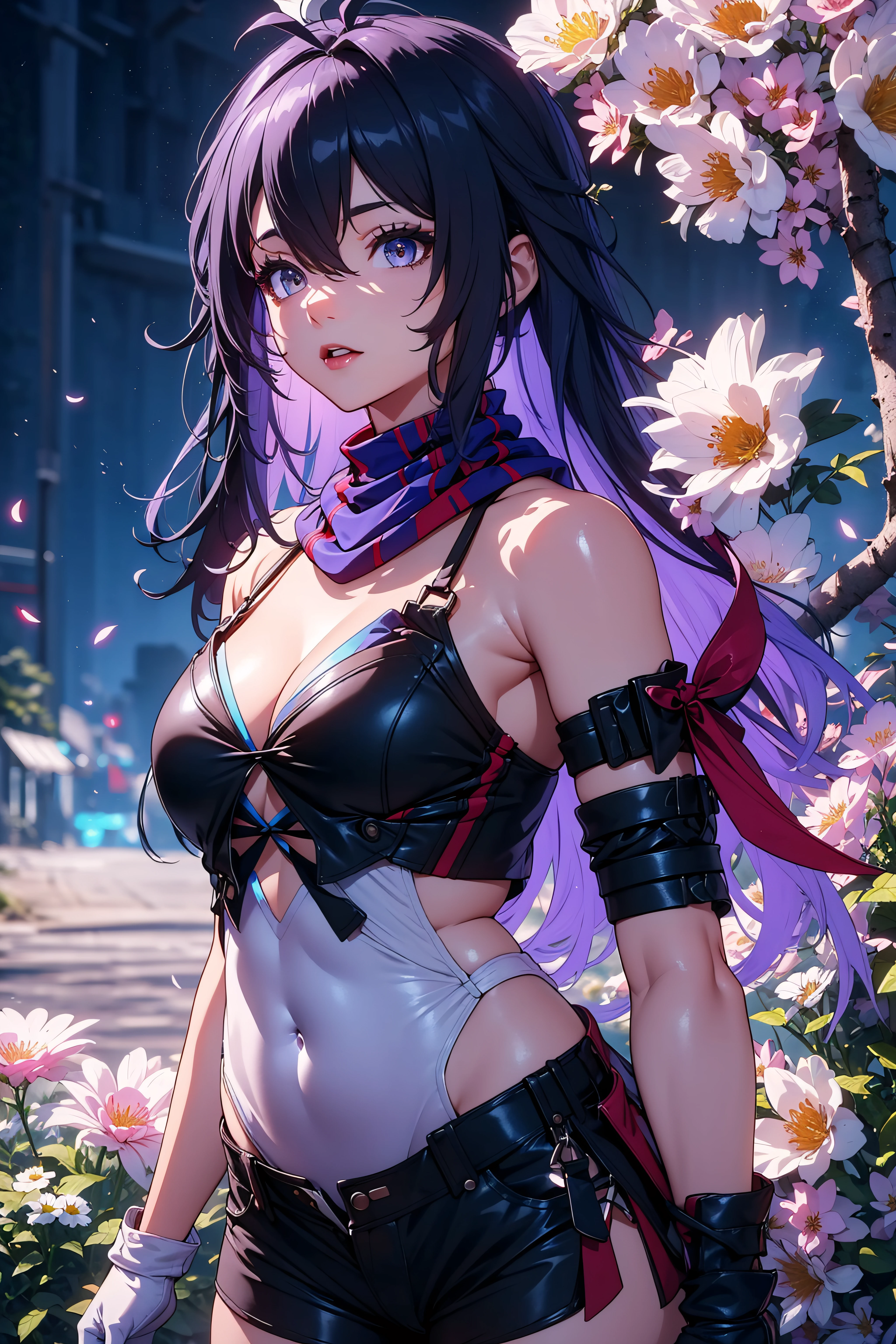 gloves,bare shoulders, shorts, black gloves, black footwear, black shorts, single glove, white leotard,scarf,