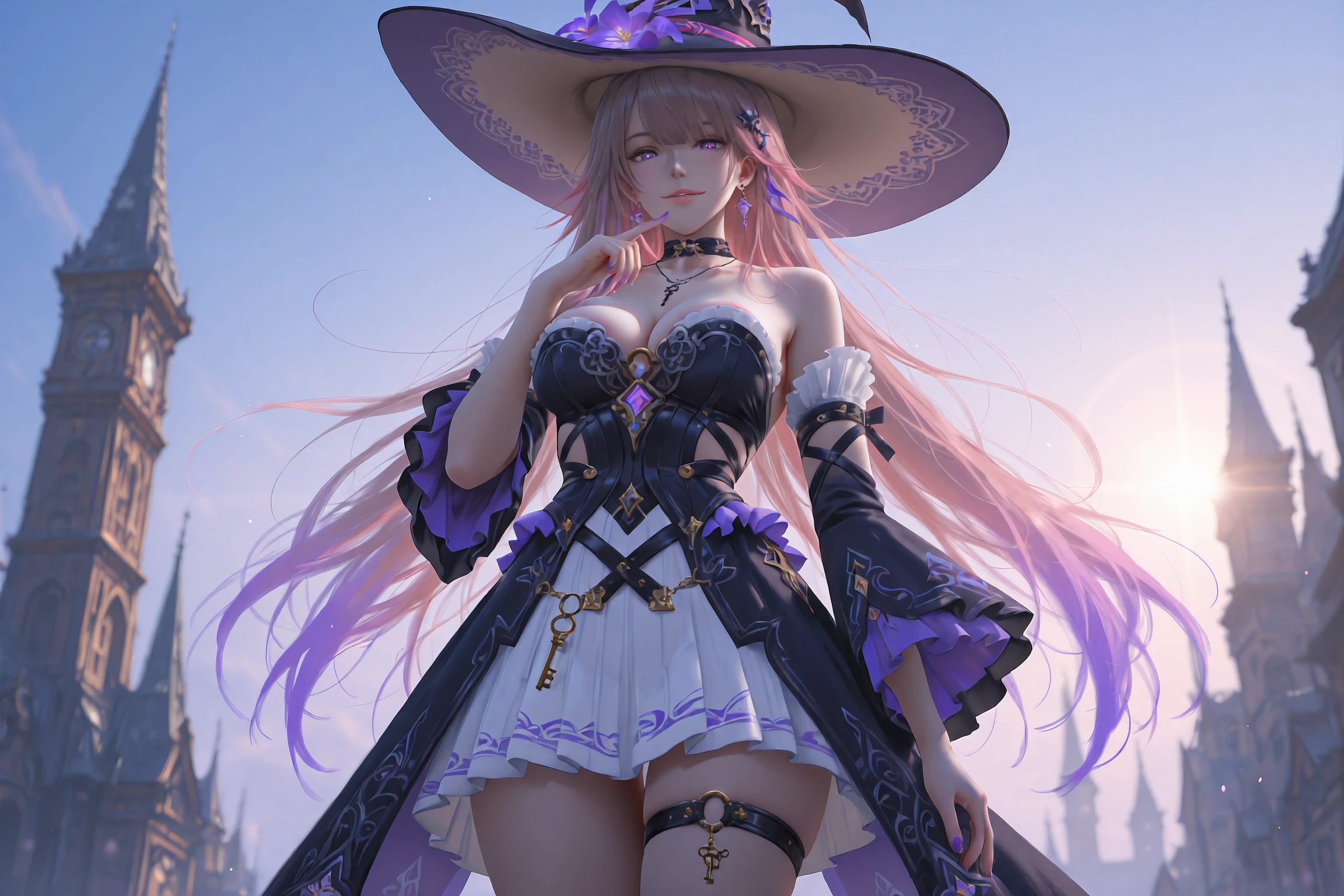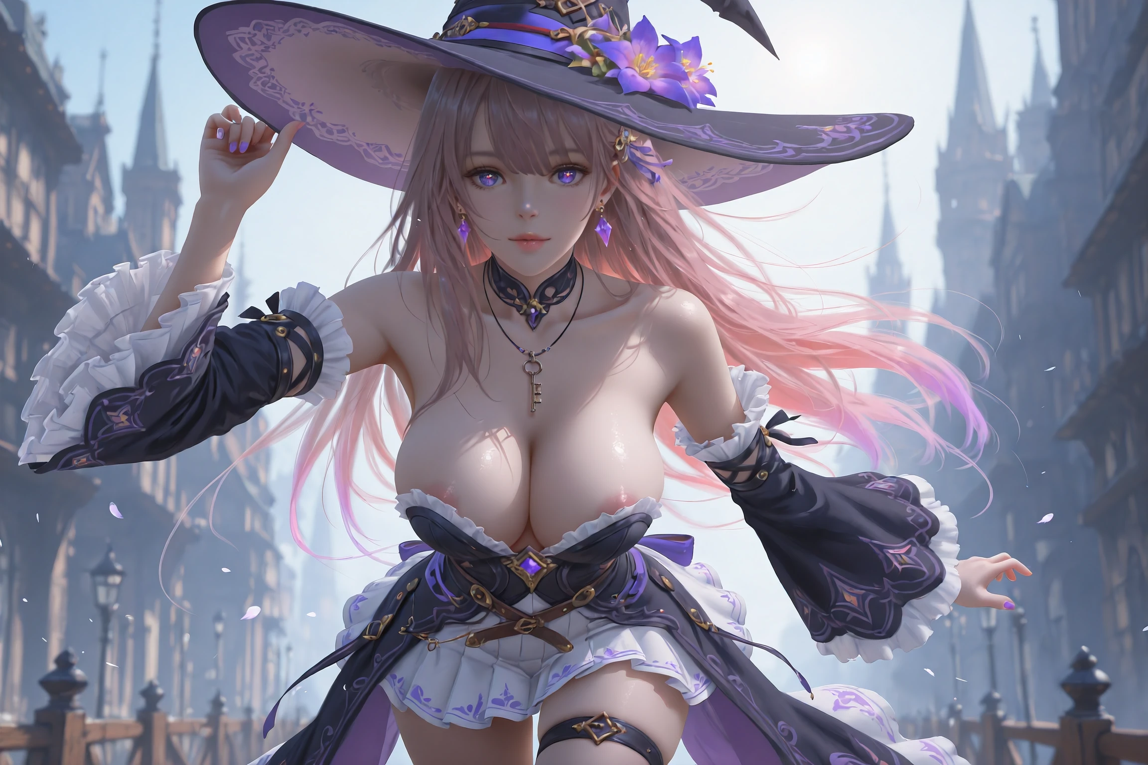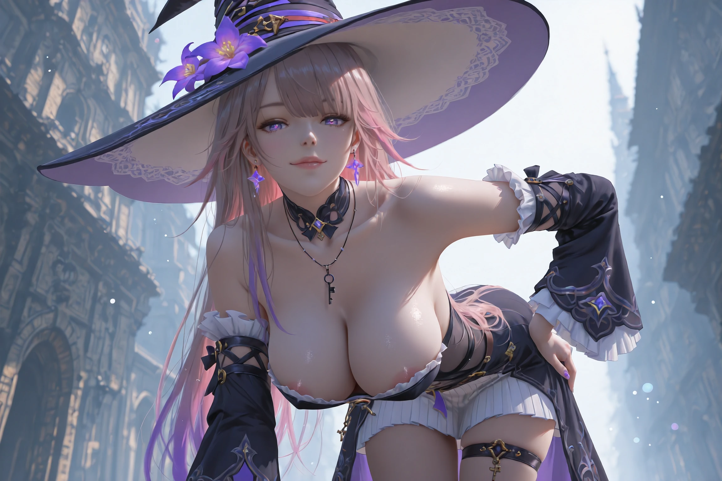 HertaBlender,1girl,witch hat,hat,solo,long hair,detached sleeves,earrings,boots,witch,jewelry,purple eyes,dress,black footwear,purple flower,hat flower,knee boots,thigh strap,gradient hair,virtual youtuber,necklace,earring,skirt,very long hair,tachi-e,frills,multicolored hair,grey hair,black dress,frilled sleeves