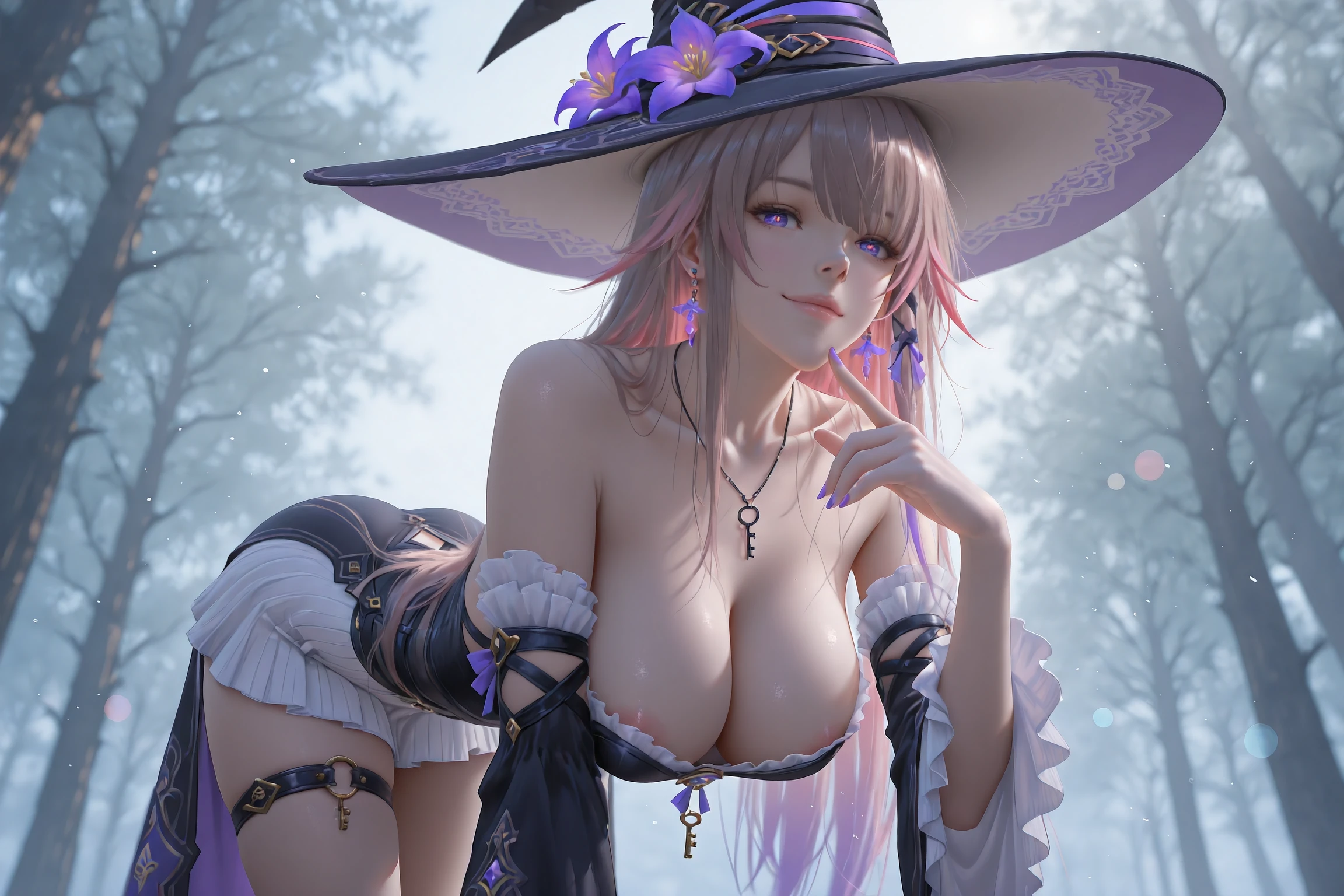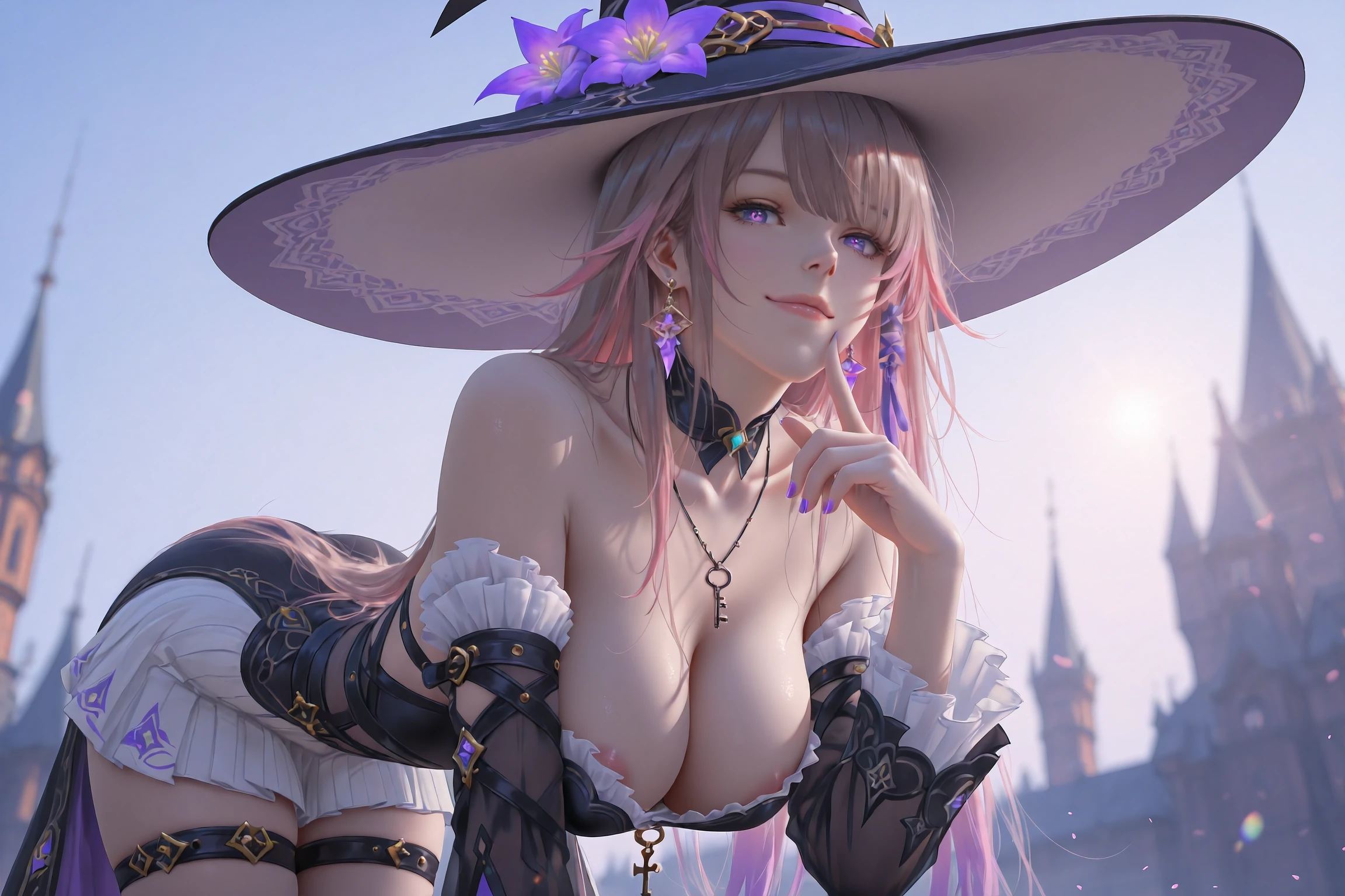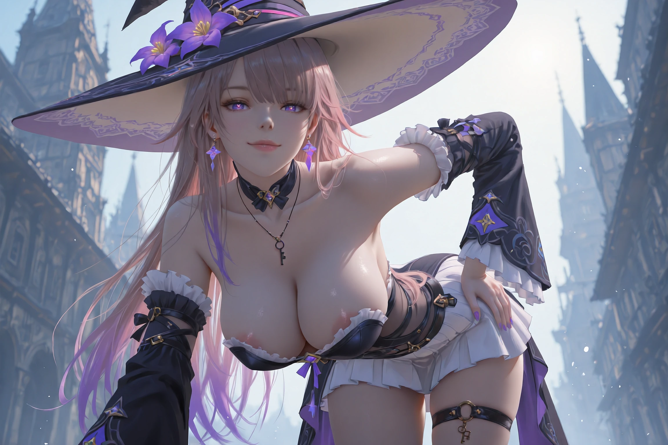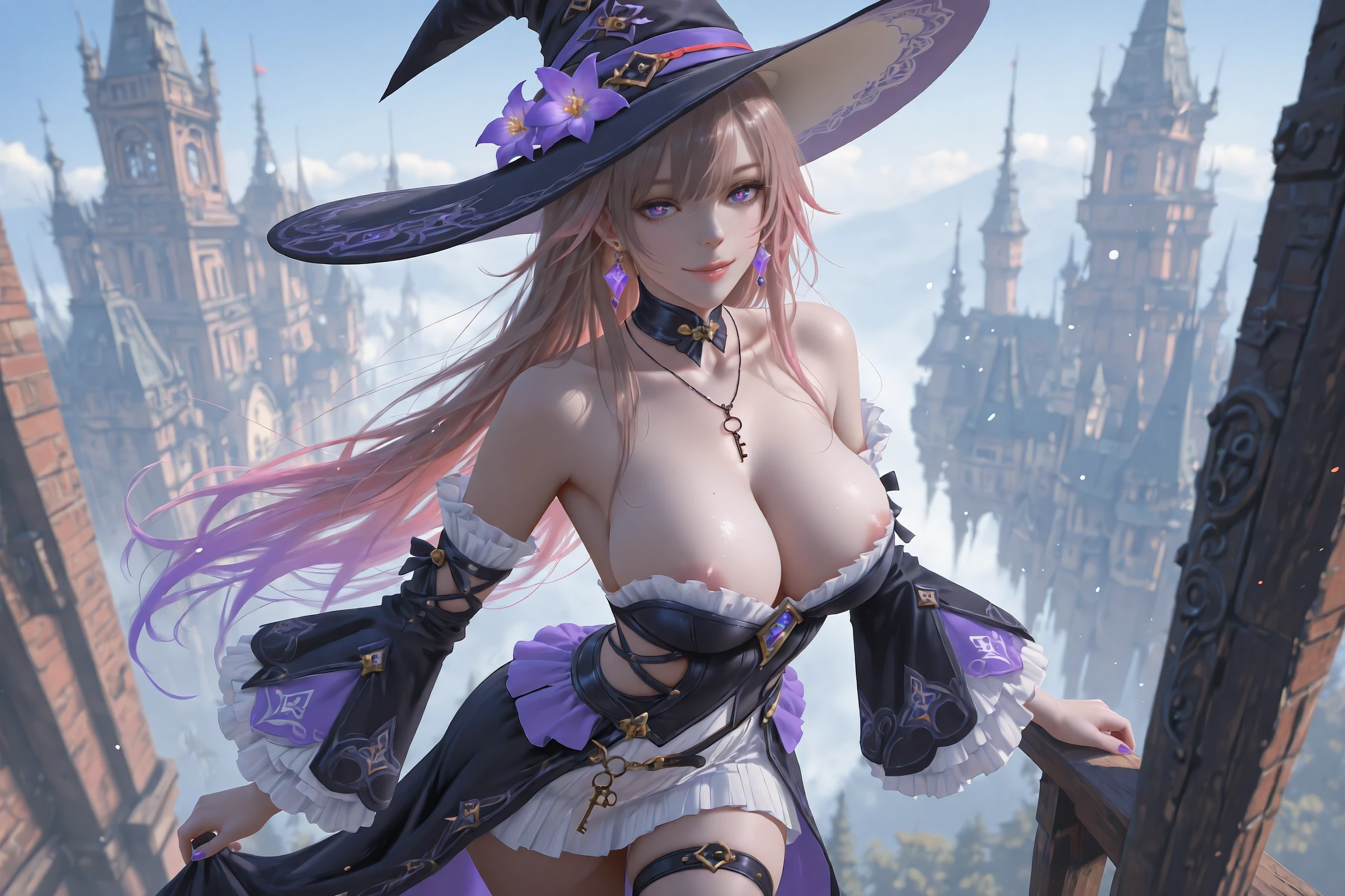 HertaBlender,1girl,witch hat,hat,solo,long hair,detached sleeves,earrings,boots,witch,jewelry,purple eyes,dress,black footwear,purple flower,hat flower,knee boots,thigh strap,gradient hair,virtual youtuber,necklace,earring,skirt,very long hair,tachi-e,frills,multicolored hair,grey hair,black dress,frilled sleeves