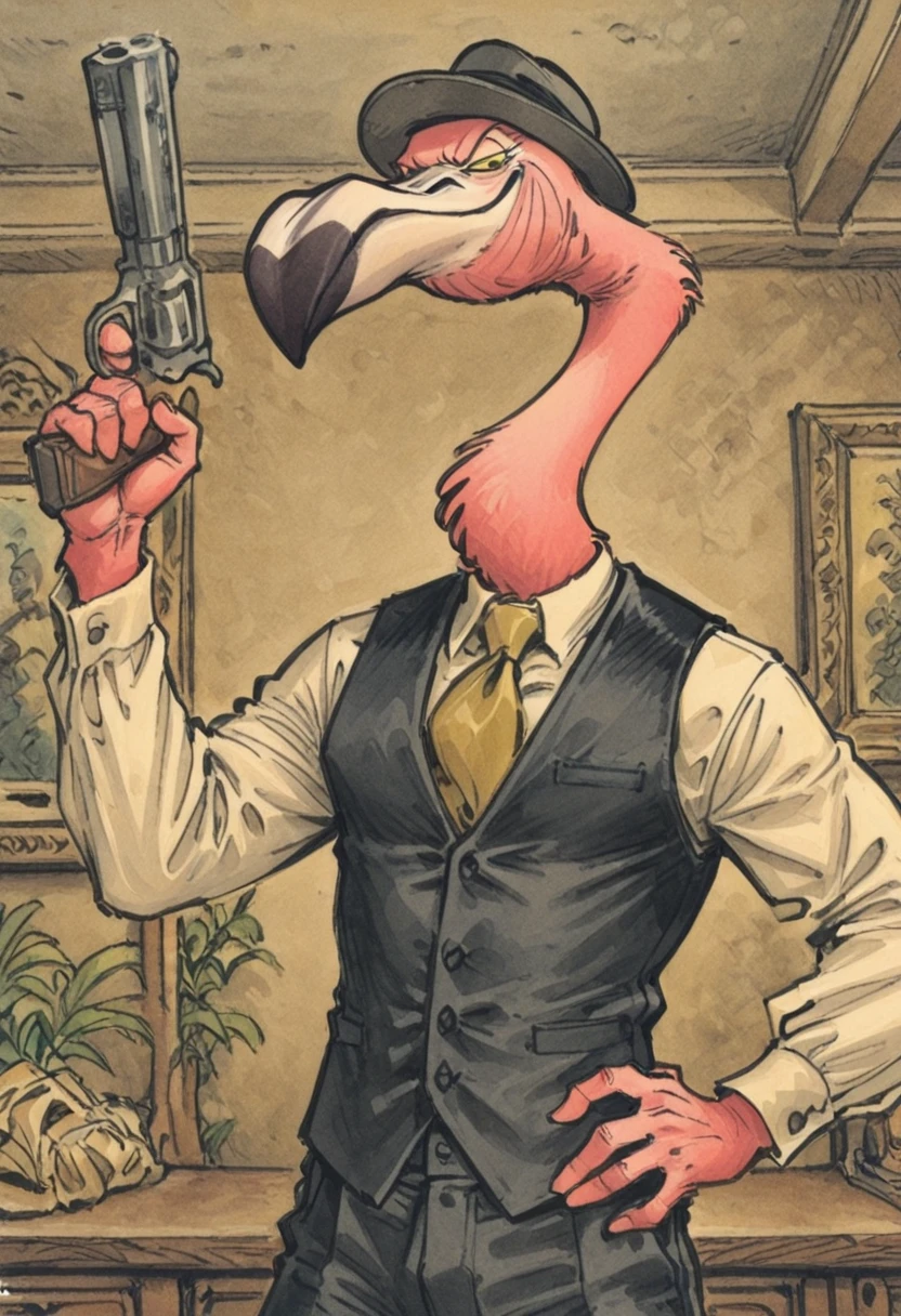 BSorrows, furry, flamingo, pink body, beak, long neck, yellow sclera, black eyes