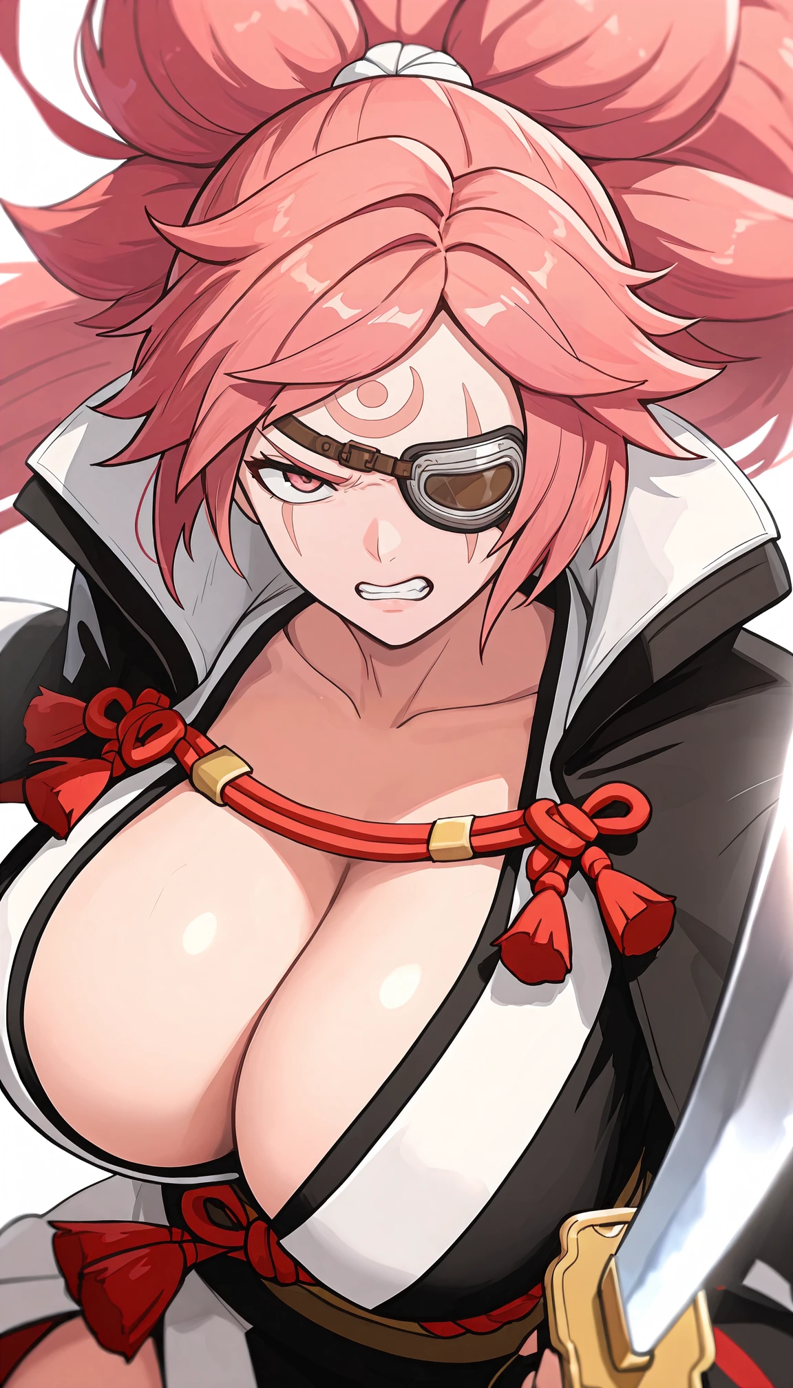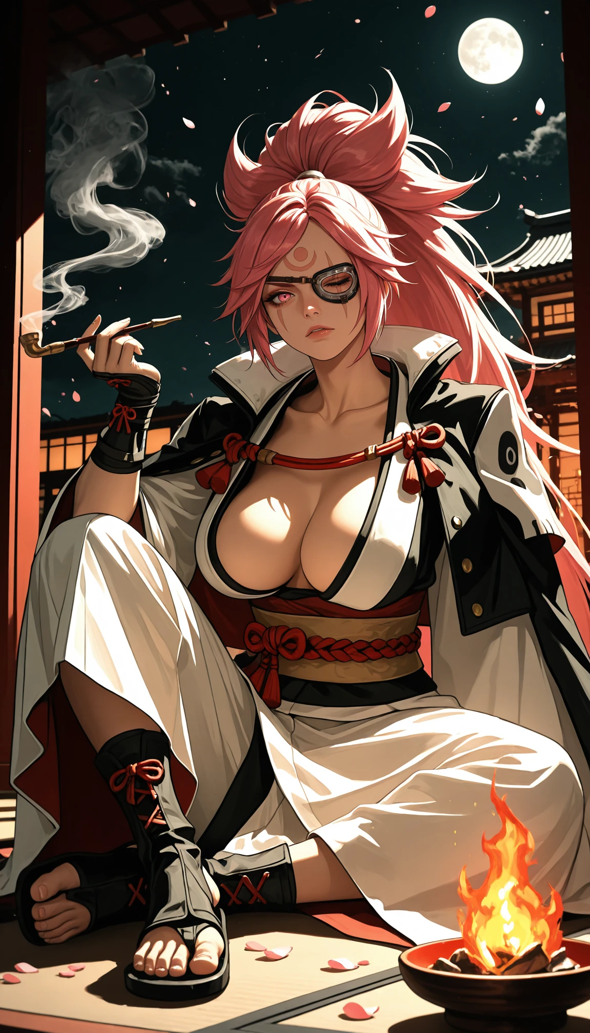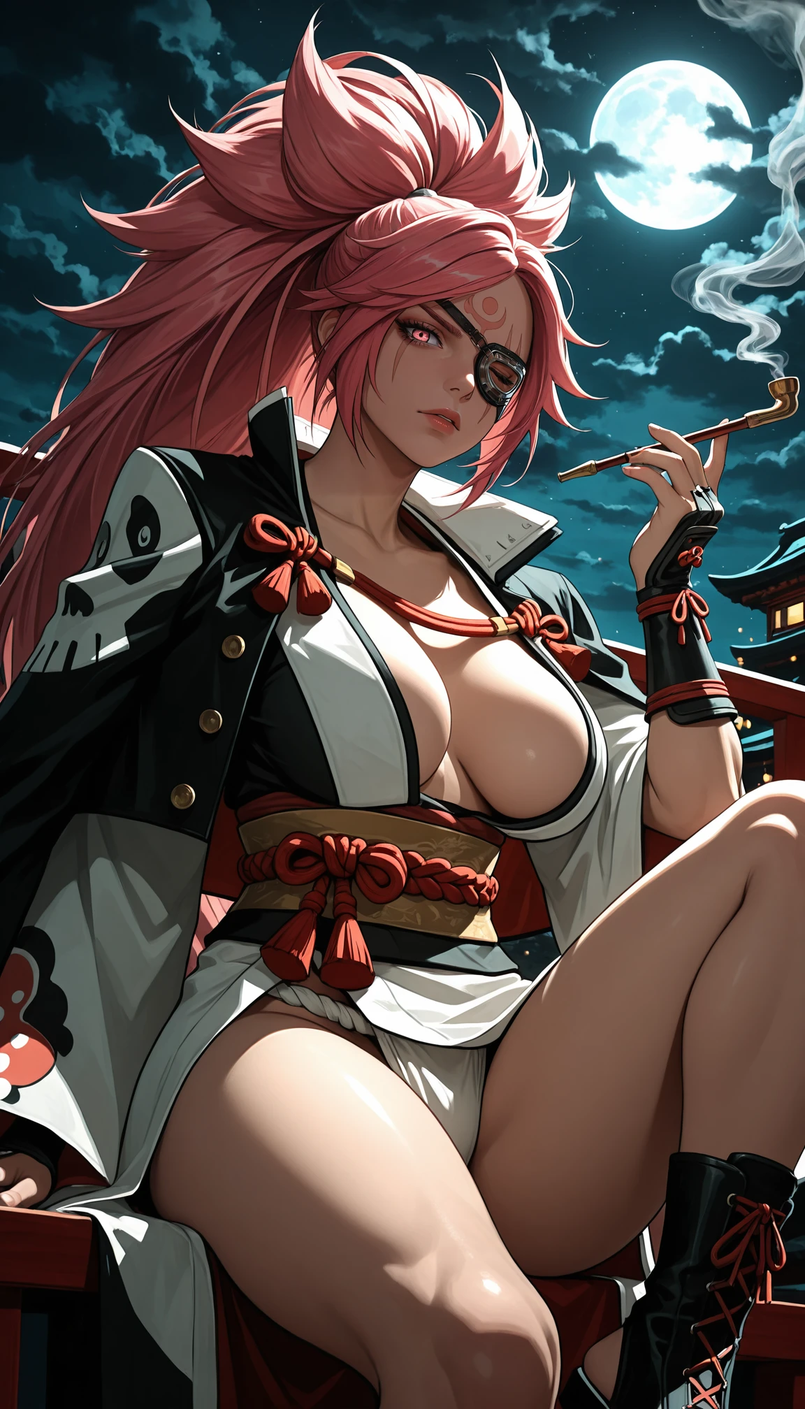 b41k3n, pink eyes, scar across eye, eyepatch, one-eyed, one eye closed, facial mark, forehead mark, pink hair, big hair, long hair, high ponytail, parted bangs, red rope, two-tone kimono, black kimono, white kimono, open kimono, innerboob, center opening, , , obi, sash, long sleeves, torn sleeve, wide sleeves, black jacket, jacket on shoulders, kataginu, amputee, single arm guard, stirrup footwear, black footwear, open-toe boots, lace-up boots, cross-laced footwear,