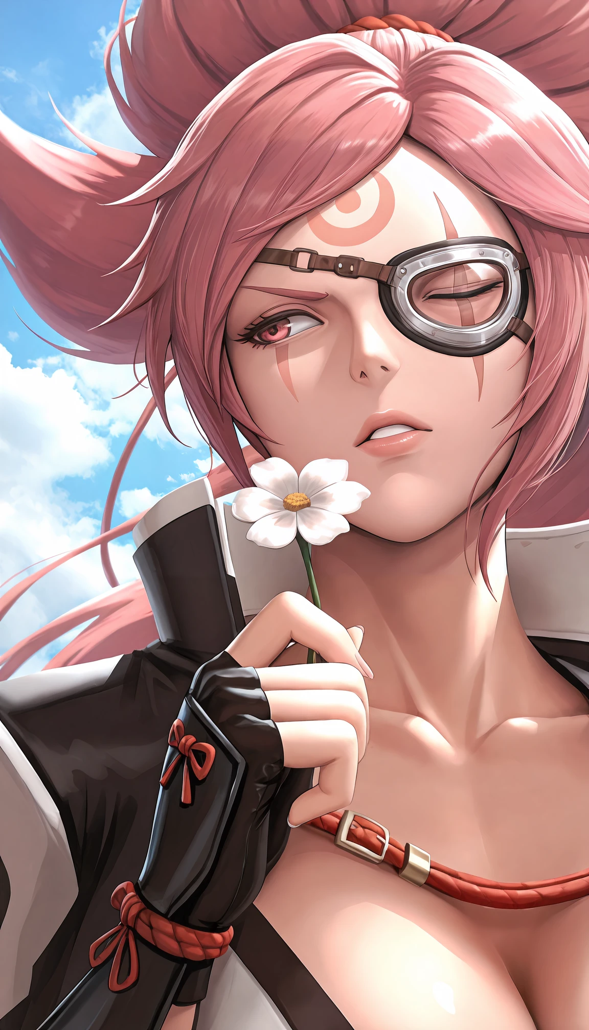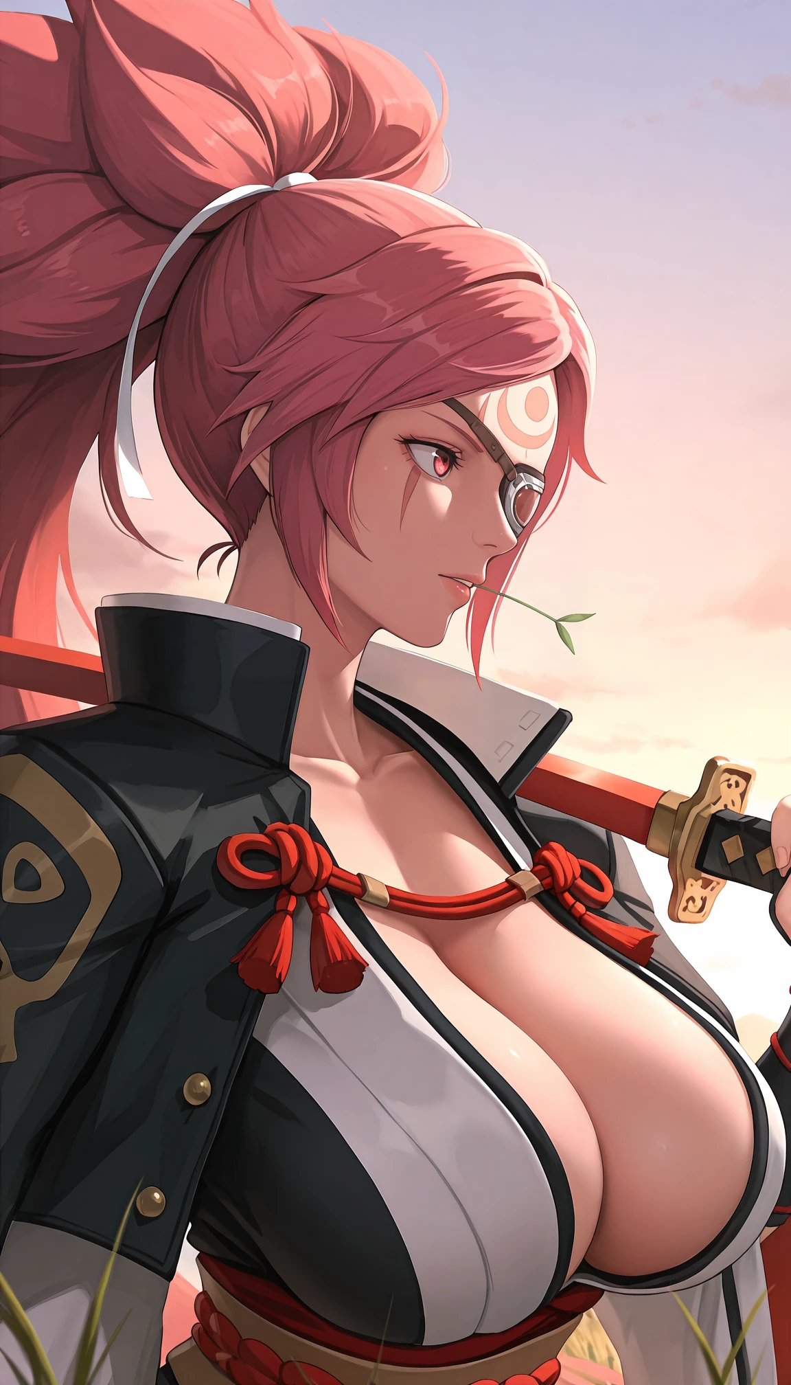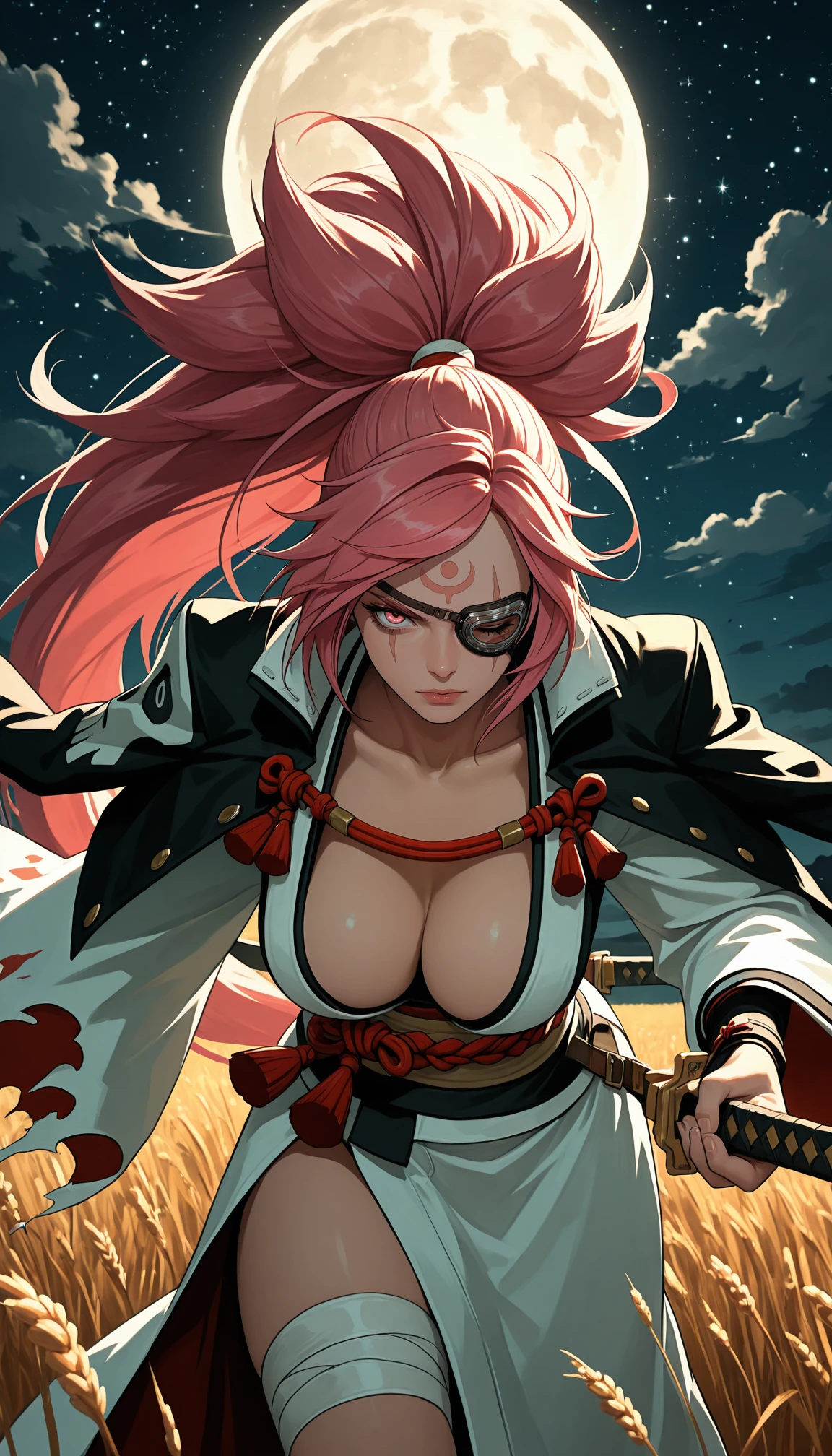 b41k3n, pink eyes, scar across eye, eyepatch, one-eyed, one eye closed, facial mark, forehead mark, pink hair, big hair, long hair, high ponytail, parted bangs, red rope, two-tone kimono, black kimono, white kimono, open kimono, innerboob, center opening, , , obi, sash, long sleeves, torn sleeve, wide sleeves, black jacket, jacket on shoulders, kataginu, amputee, single arm guard, stirrup footwear, black footwear, open-toe boots, lace-up boots, cross-laced footwear,