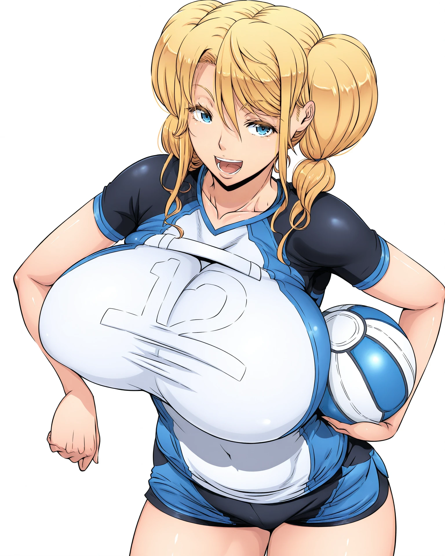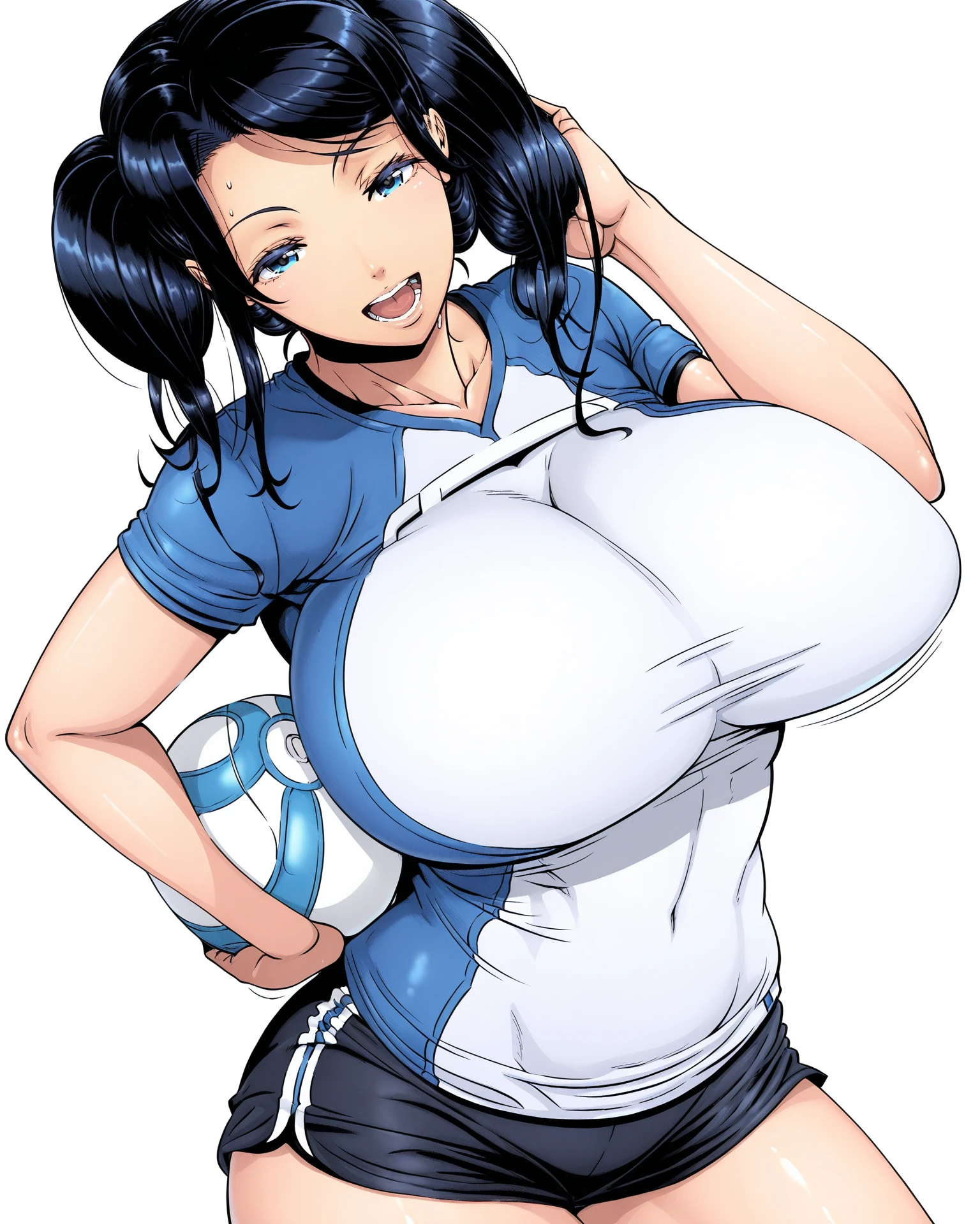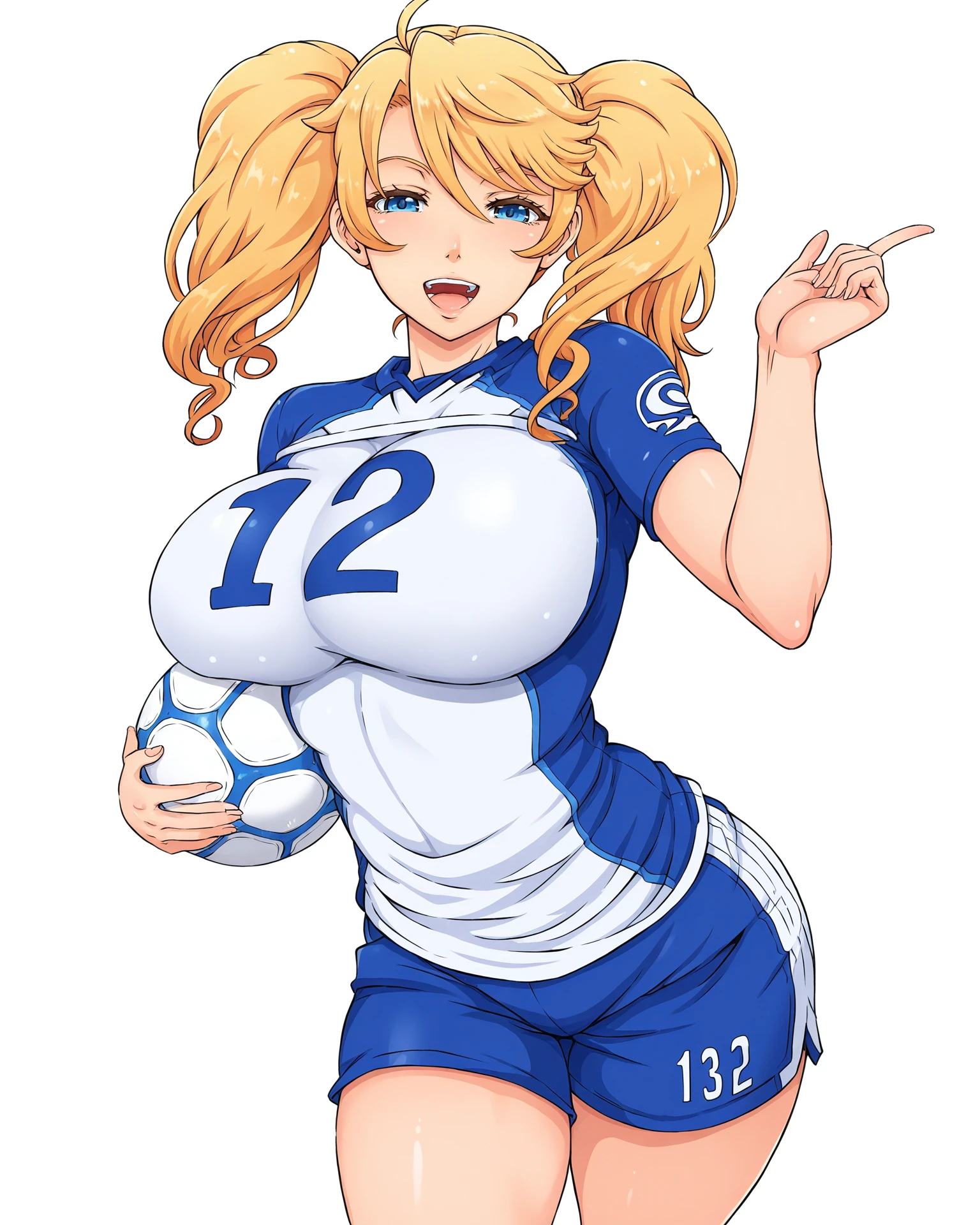 energetic girl smiling and holding a sports ball.,erohaha,hajimete no hitozuma style,1girl,,solo,sportswear,shorts,twintails,long hair,open mouth,looking at viewer,smile,soccer uniform,,white background,
