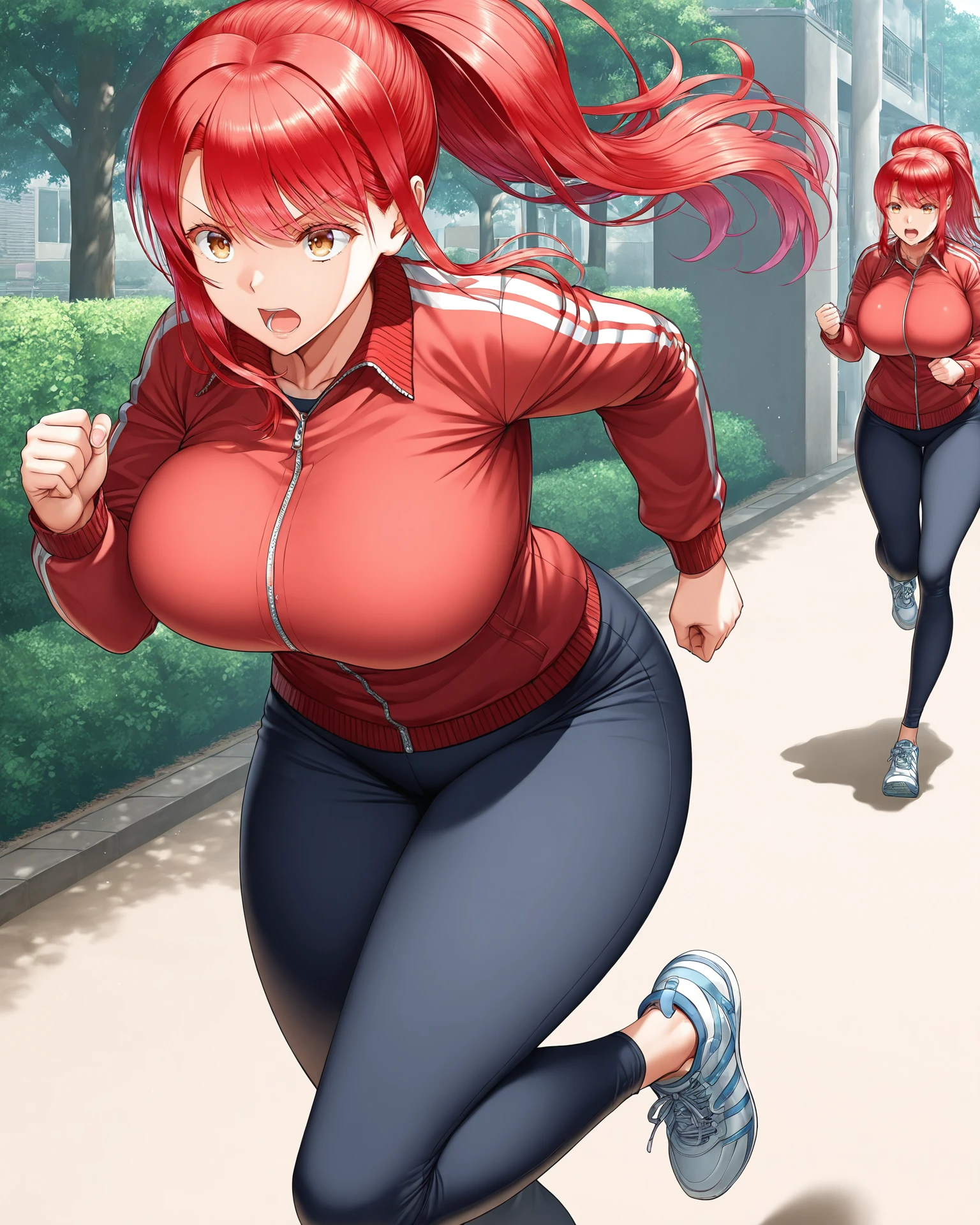 sai-sensei,hajimete no hitozuma style,red hair,,1girl,,long hair,jacket,sneakers,ponytail,running,track jacket,pants,shoes,open mouth,red jacket,walking,