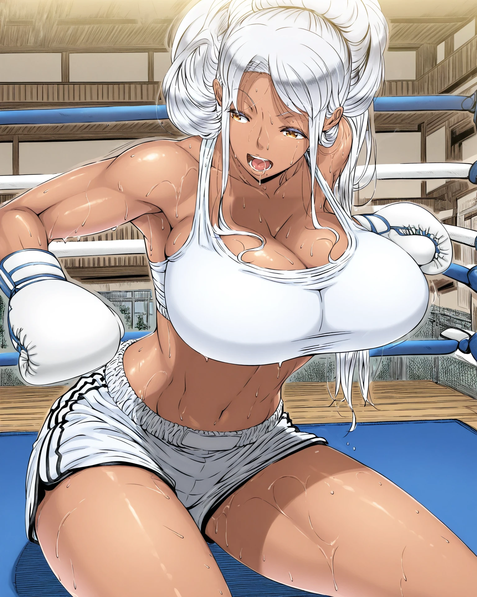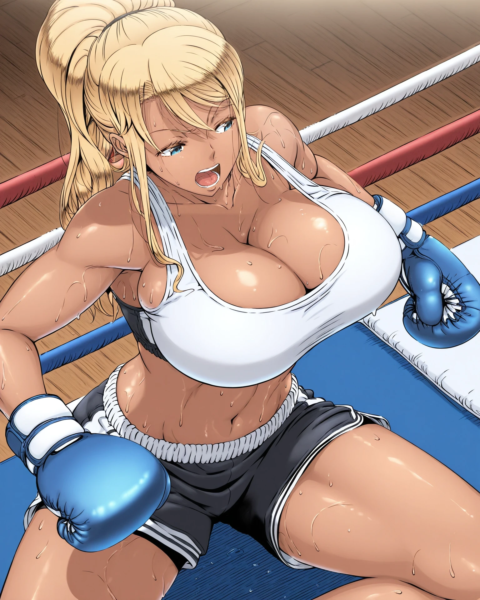 sweating woman leans against boxing ring ropes. a defeated opponent lies on the floor of the gym.,mizuha,hajimete no hitozuma style,boxing gloves,,shorts,1girl,sweat,long hair,ponytail,open mouth,navel,midriff,cleavage,
