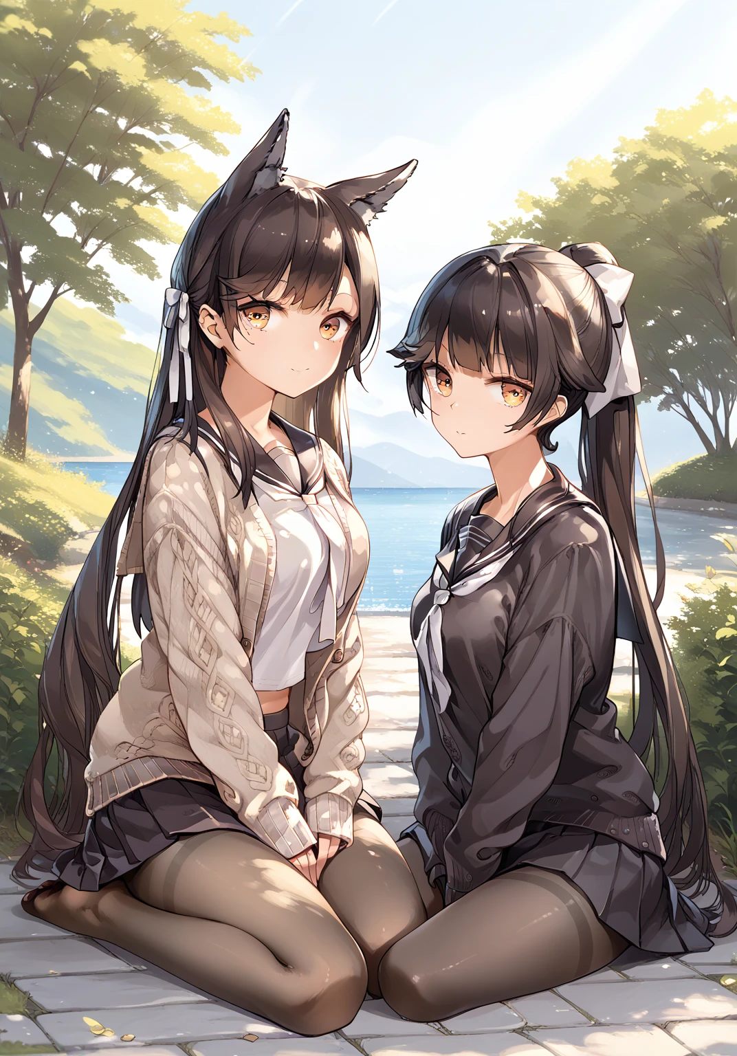 atago \(azur lane\),takao \(azur lane\),hair bow, long hair,ponytail, extra ears,2girls,