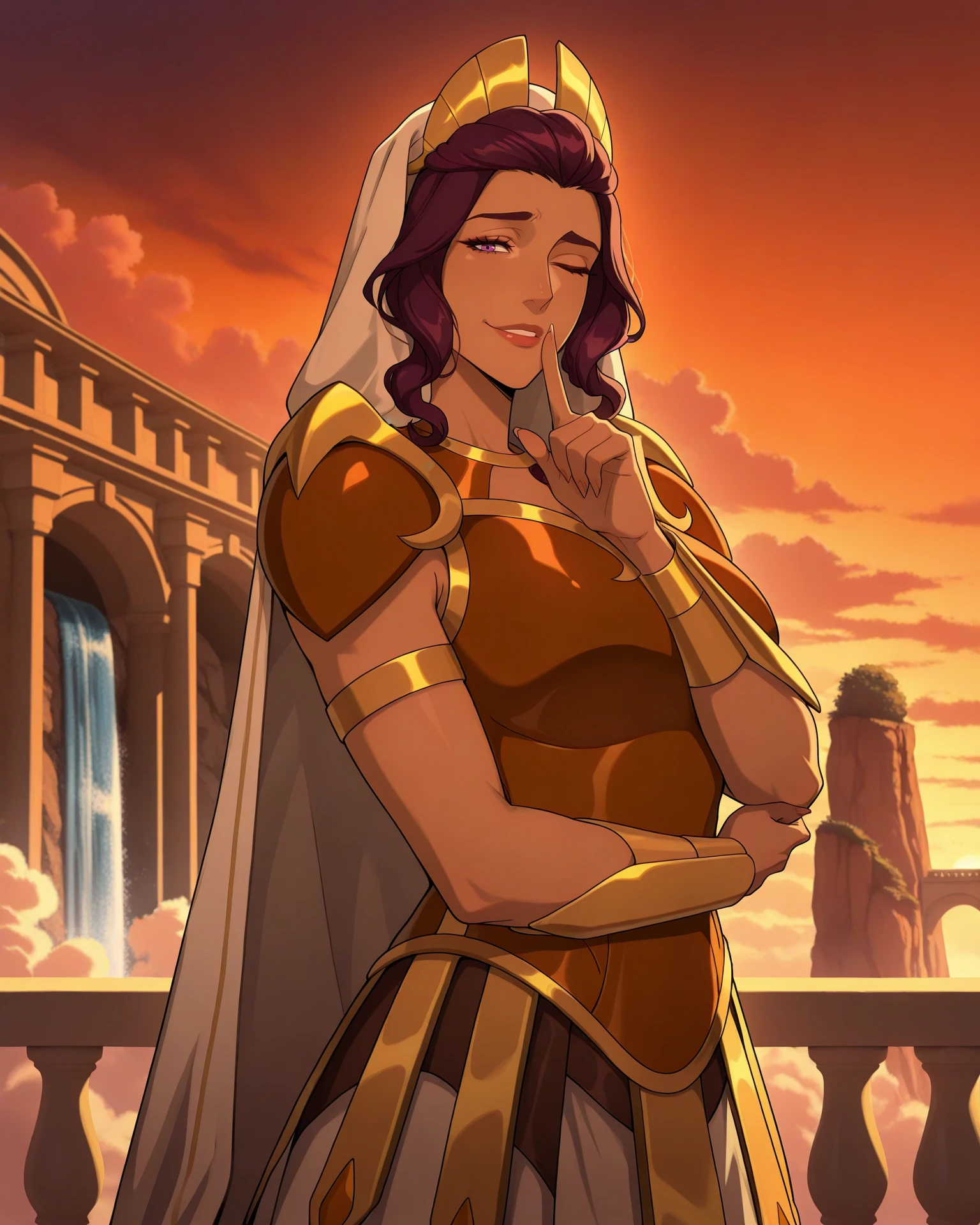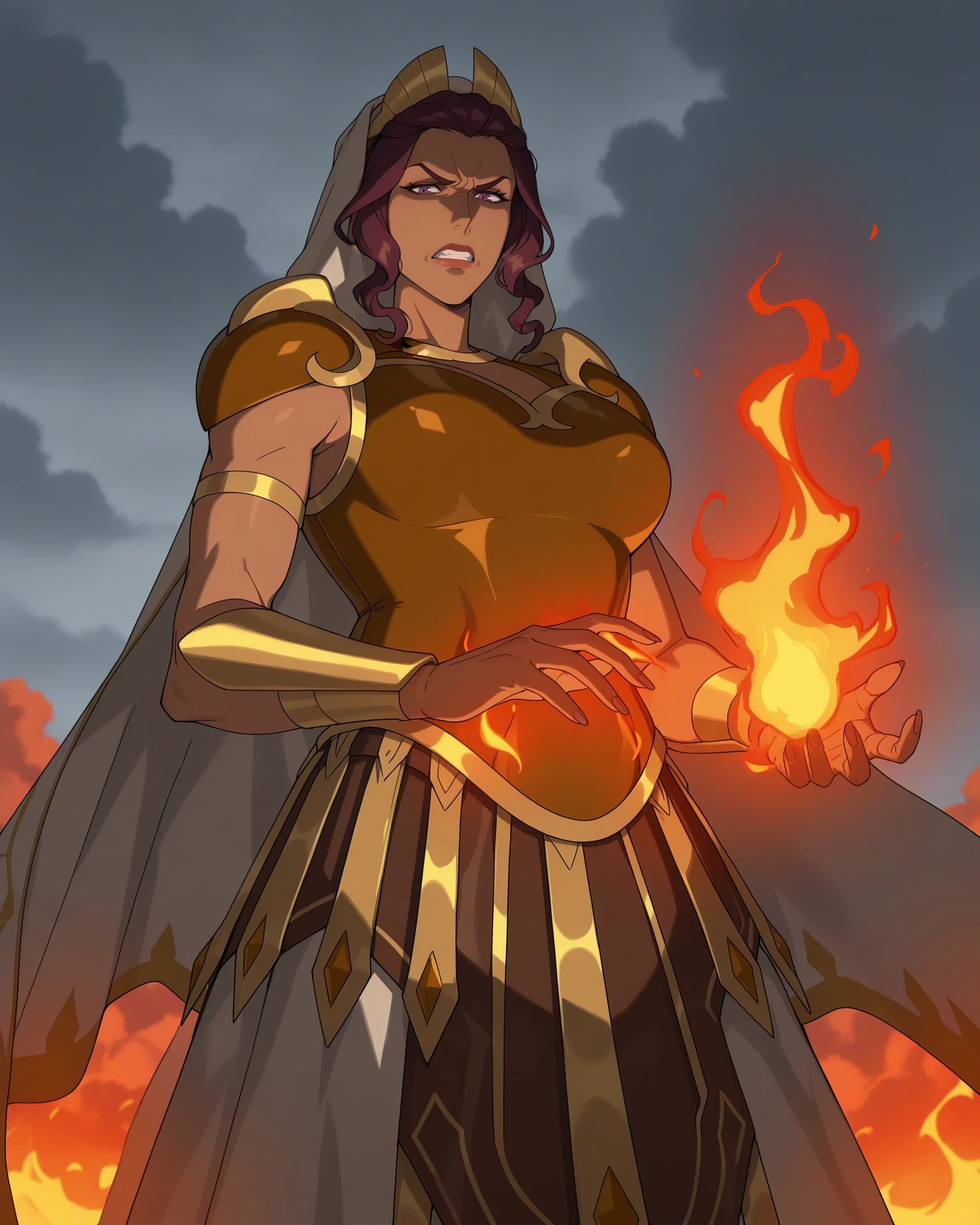curly sidelocks, brown hair, purple eyes, mature female, dark-skinned female