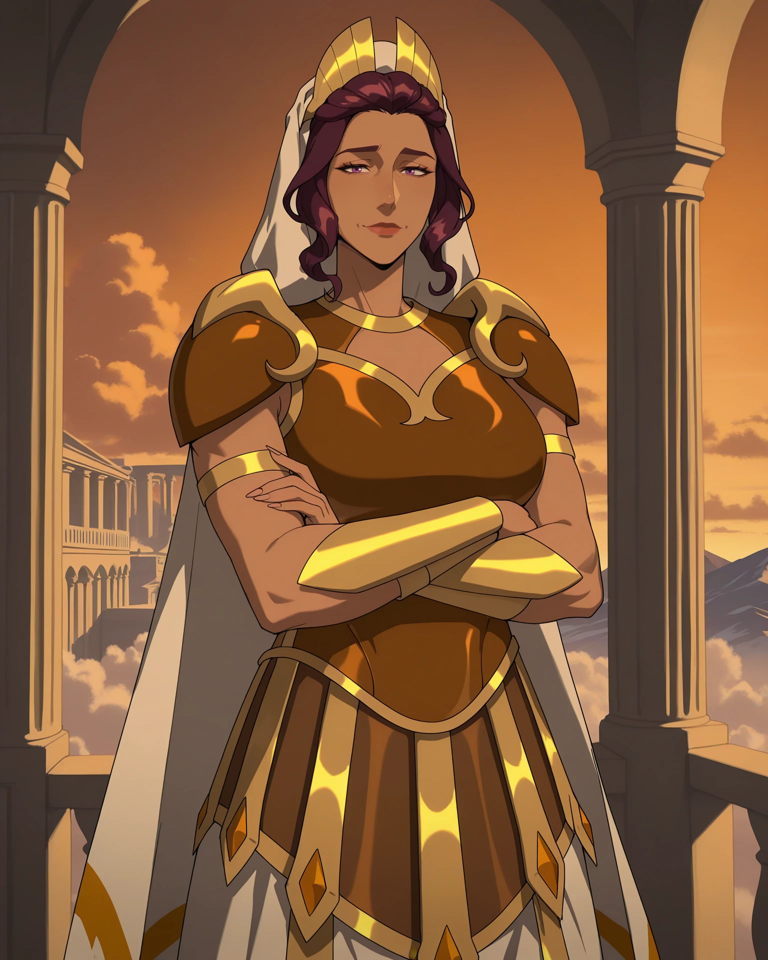 boobplate, headdress, armlet, gold armor, shoulder armor, veil, vambraces, armored dress