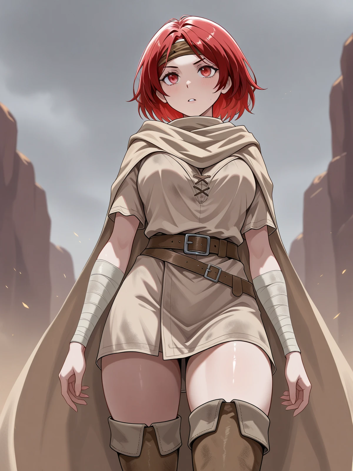 brown bandana on head, beige cape, beige tunic, belt, arm wraps, thigh boots, soiled clothes