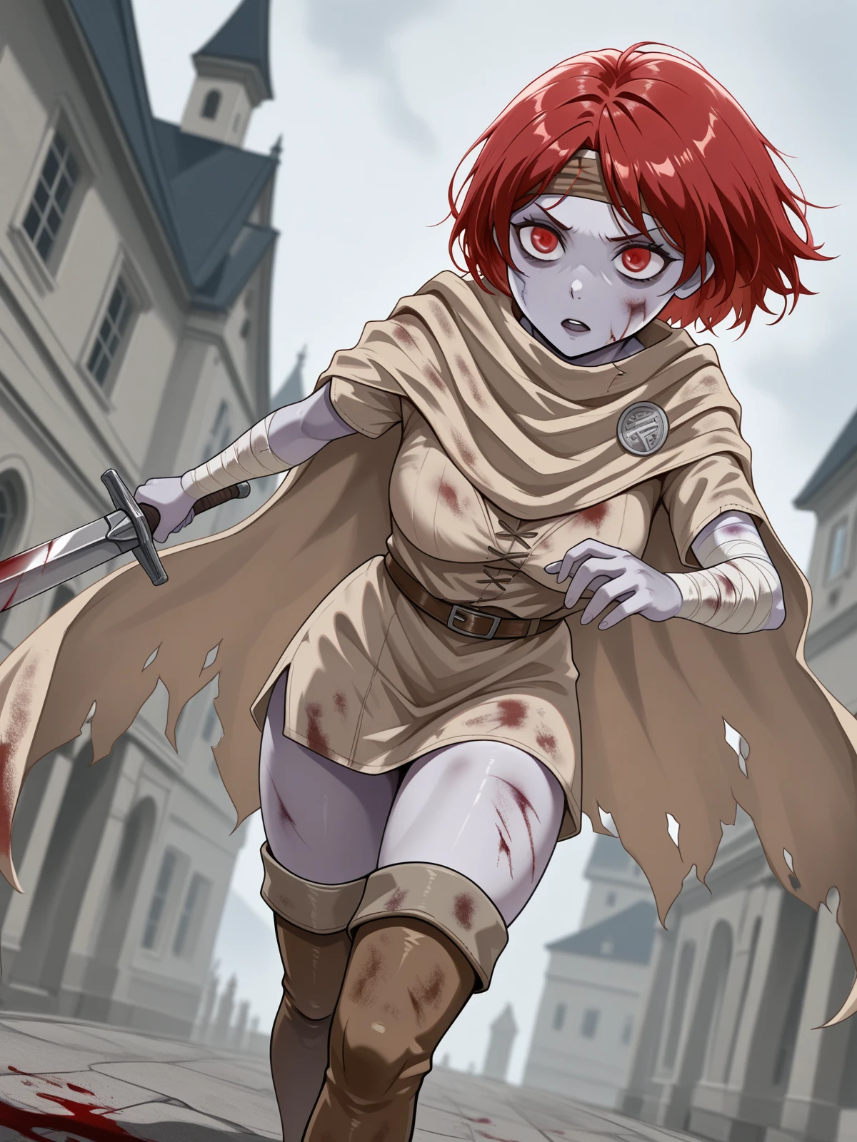EllieMGQ, 1girl, zombie girl, red hair, red eyes, blood on cheek, brown bandana on head, beige cape, beige tunic, belt, arm wraps, thigh boots, soiled clothes