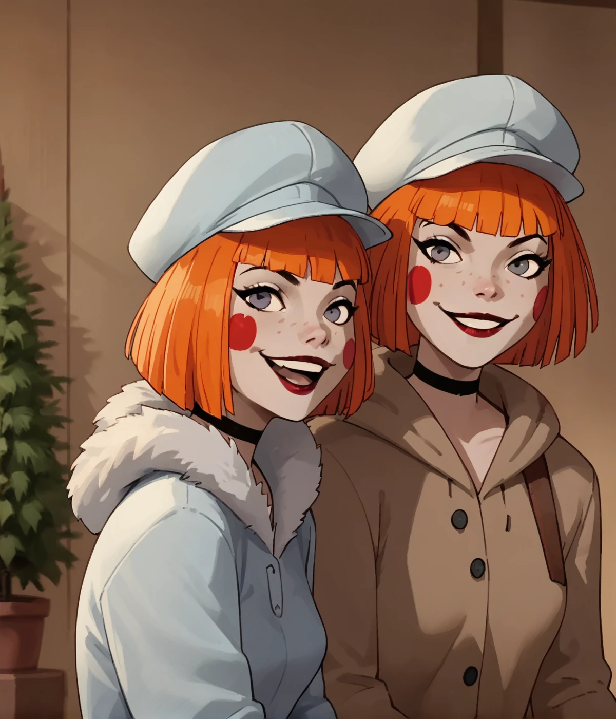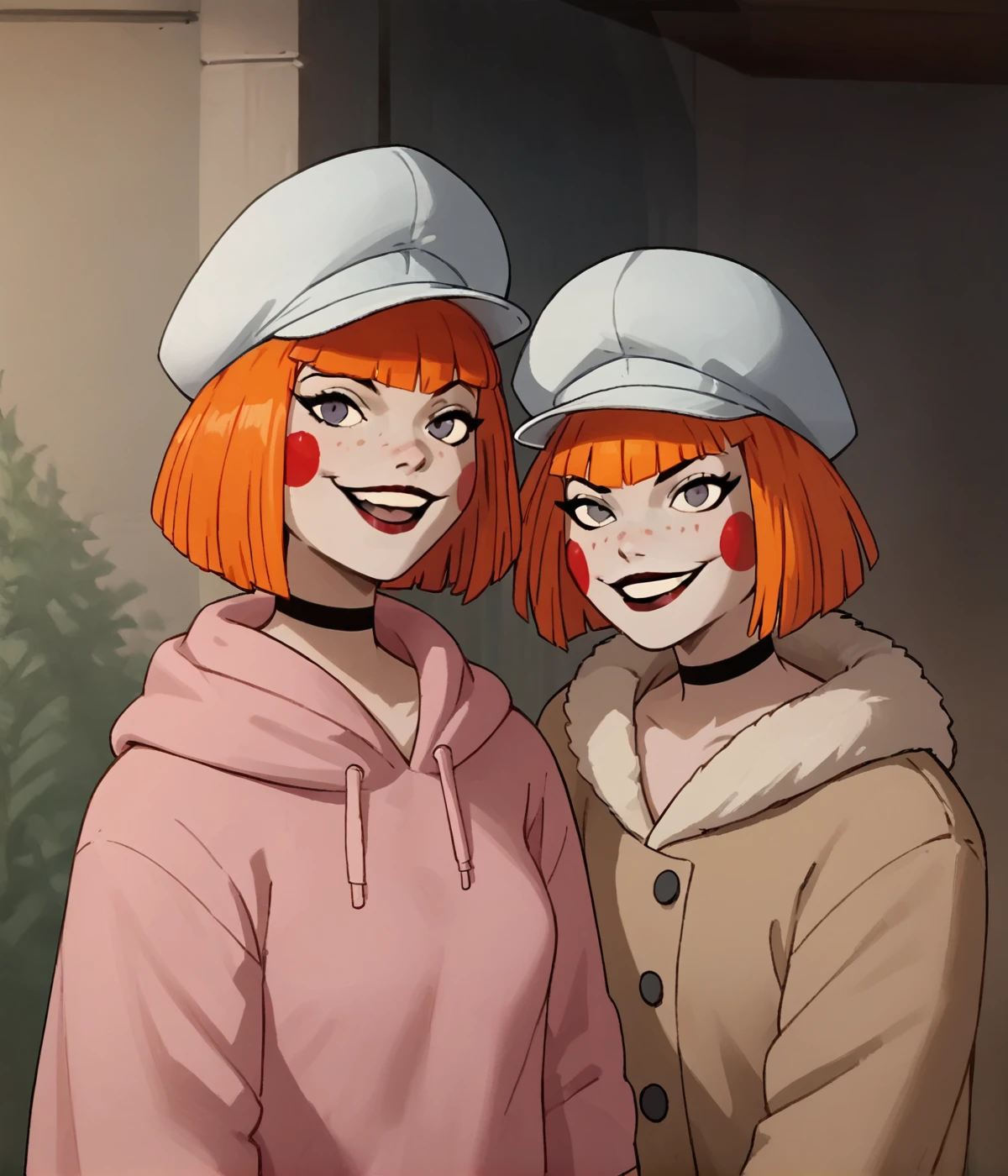 2girls, hat, choker, orange hair, open mouth, short hair, smile, de0de0