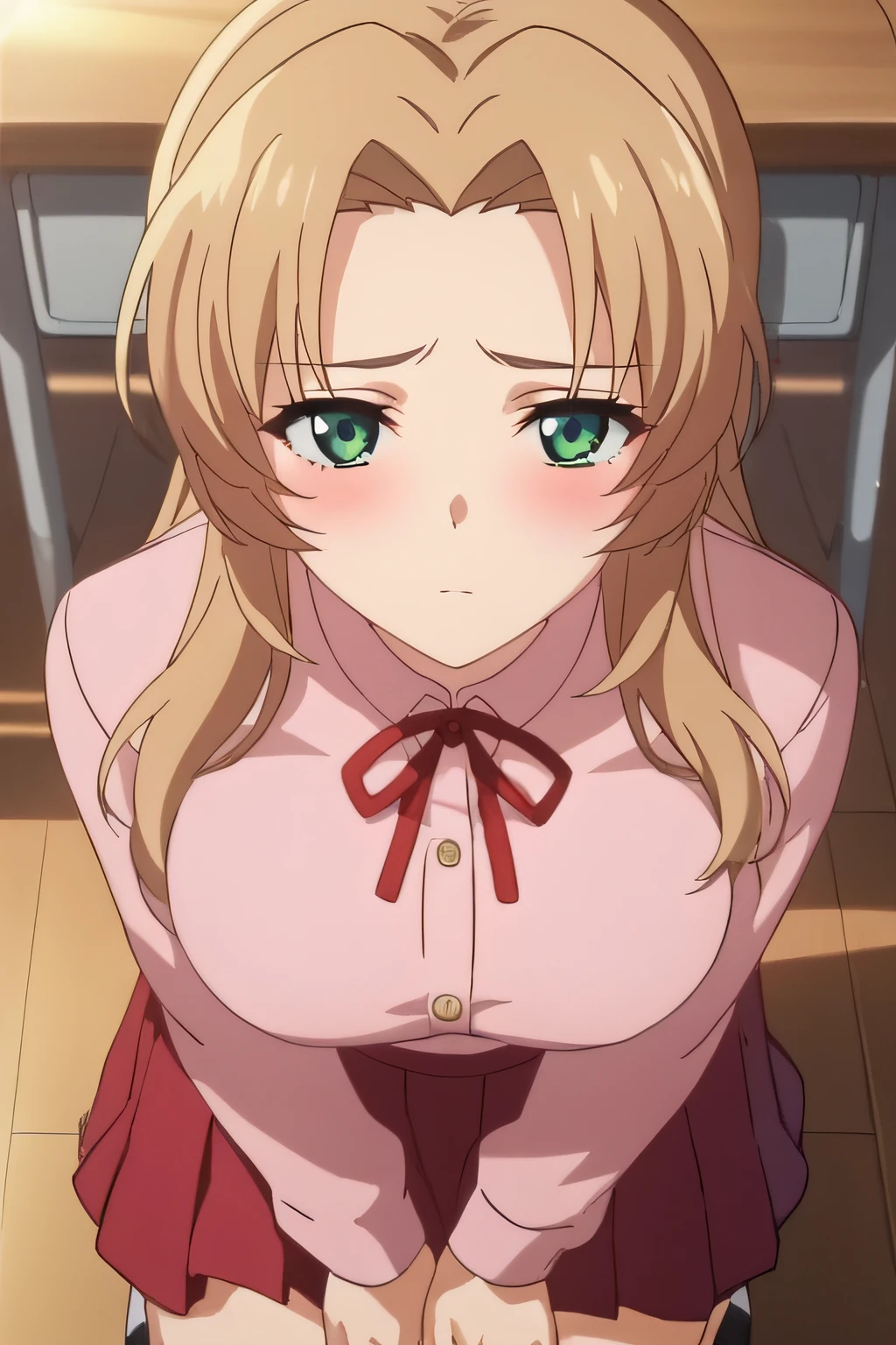 school uniform, pink shirt, long sleeves, red ribbon, large breasts, red skirt, pleated skirt