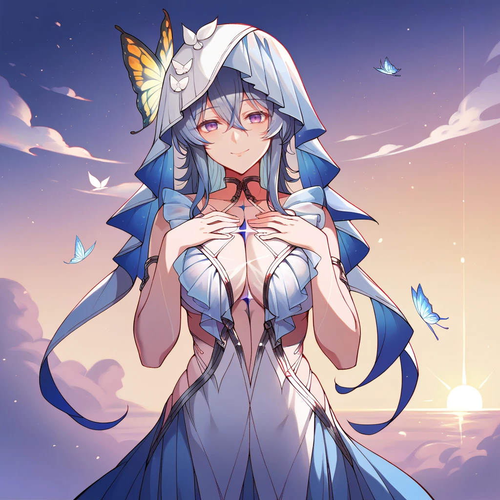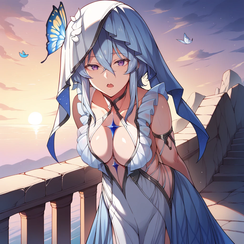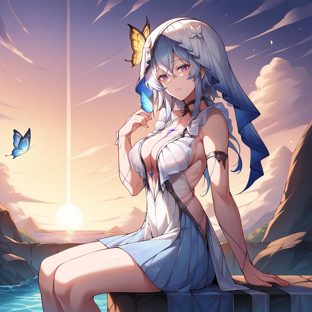 Sk_Def, two-tone veil, white veil, blue veil, between breasts, gem, white bodystocking, covered breasts, cleavage, white dress, dress, halterneck, choker, butterfly, sleeveless dress, armlet, see-through, pleated skirt, frilled skirt, blue skirt, frilled dress, criss-cross arm straps,Disclaimer: Yes I failed to recreate her footwear. I don't even know why, but high-less heels is the most stupid thing in existence. I'd rather see it burn. It was hard enough to make her breasts covered with bodystocking, so I honestly don't care anymore. Why even request a character with so many LoRAs...
