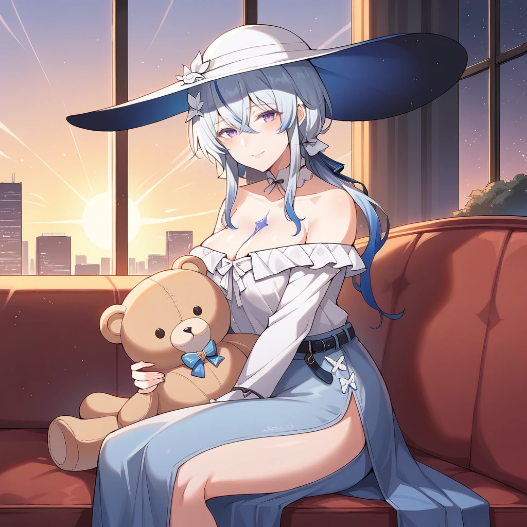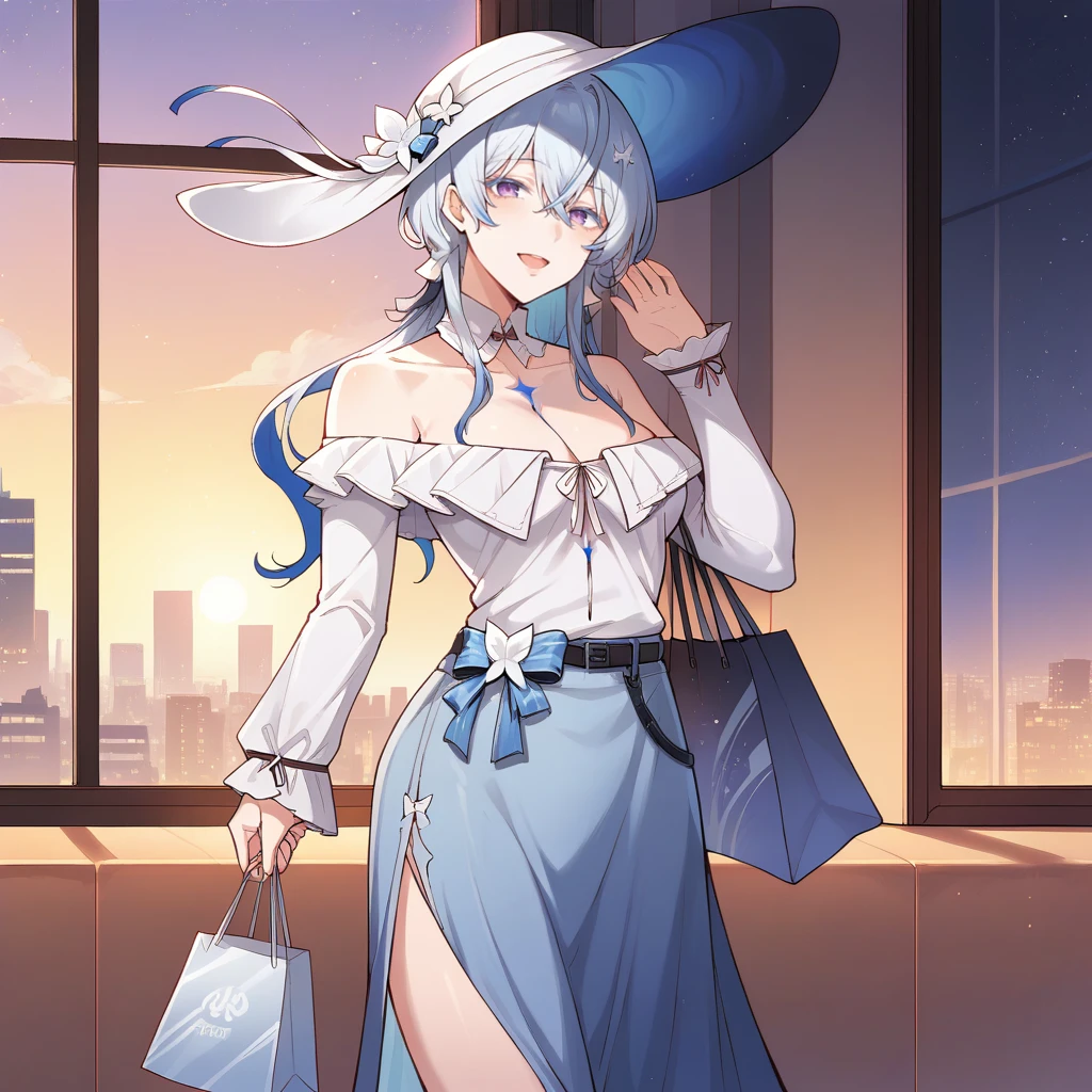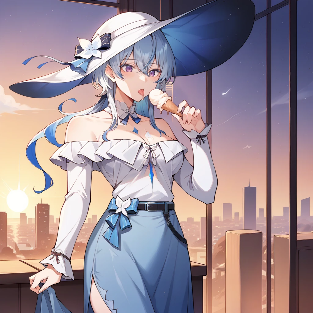 Sk_Cas, low ponytail, long skirt, side slit, light blue skirt, blue bow, detached collar, between breasts, cleavage, white ribbon, off-shoulder shirt, frilled shirt, white shirt, long sleeves, hat flower, frilled sleeves, white sleeves, black belt, alt white headwear, hat,Pajamas Outfit: (Spa Collab Outfit)