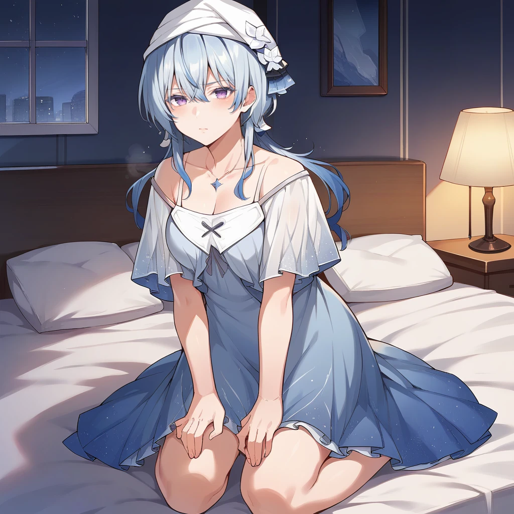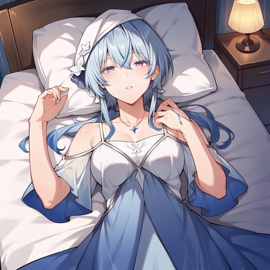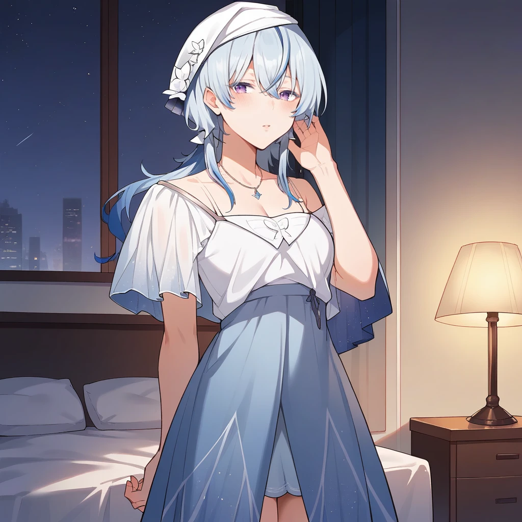 Sk_Paj, low ponytail, white headwear, necklace, white camisole under dress, blue dress, short dress, wrist scrunchie, medium sleeves, blue sleeves, wide sleeves, layered skirt,The results of your generations are dependent on the additional LoRAs, weights, and models you use, so it may not work or come out as consistent as my sample images.