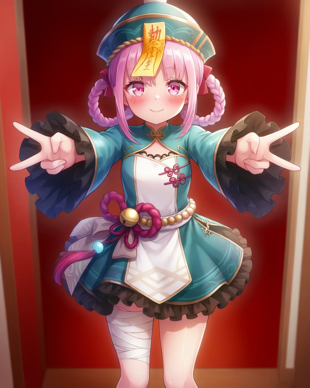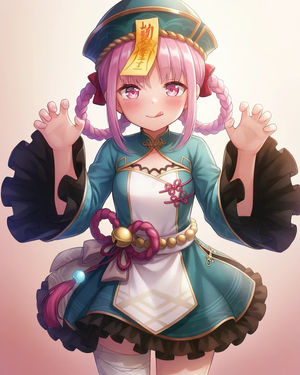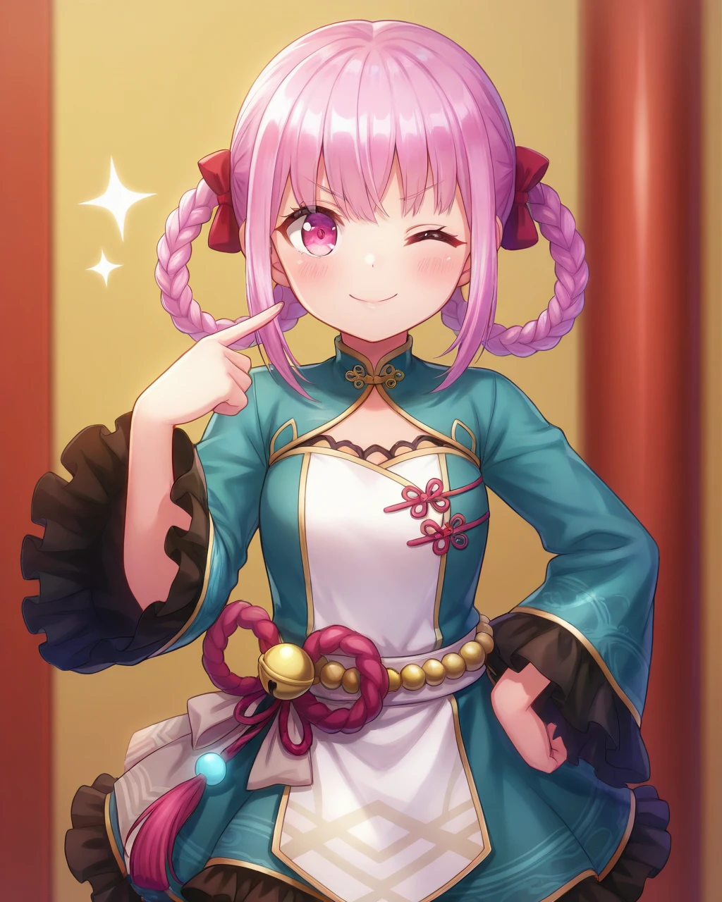 KunimiTama, KunimiTama_zob, pink hair, twin braids, hat, chinese hat, chinese clothes, china dress, green dress, wide sleeves, long sleeves, bell sleeves, frills, frilled skirt, back cutout, tassel, waist bow, rope, rope belt, decorative knot, bare legs, shoes, black shoes, ankle bow, shoes with bow,