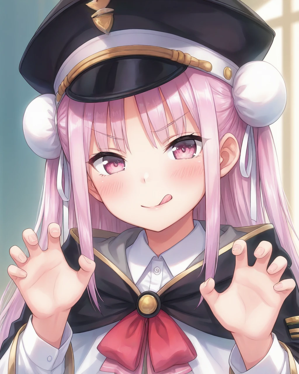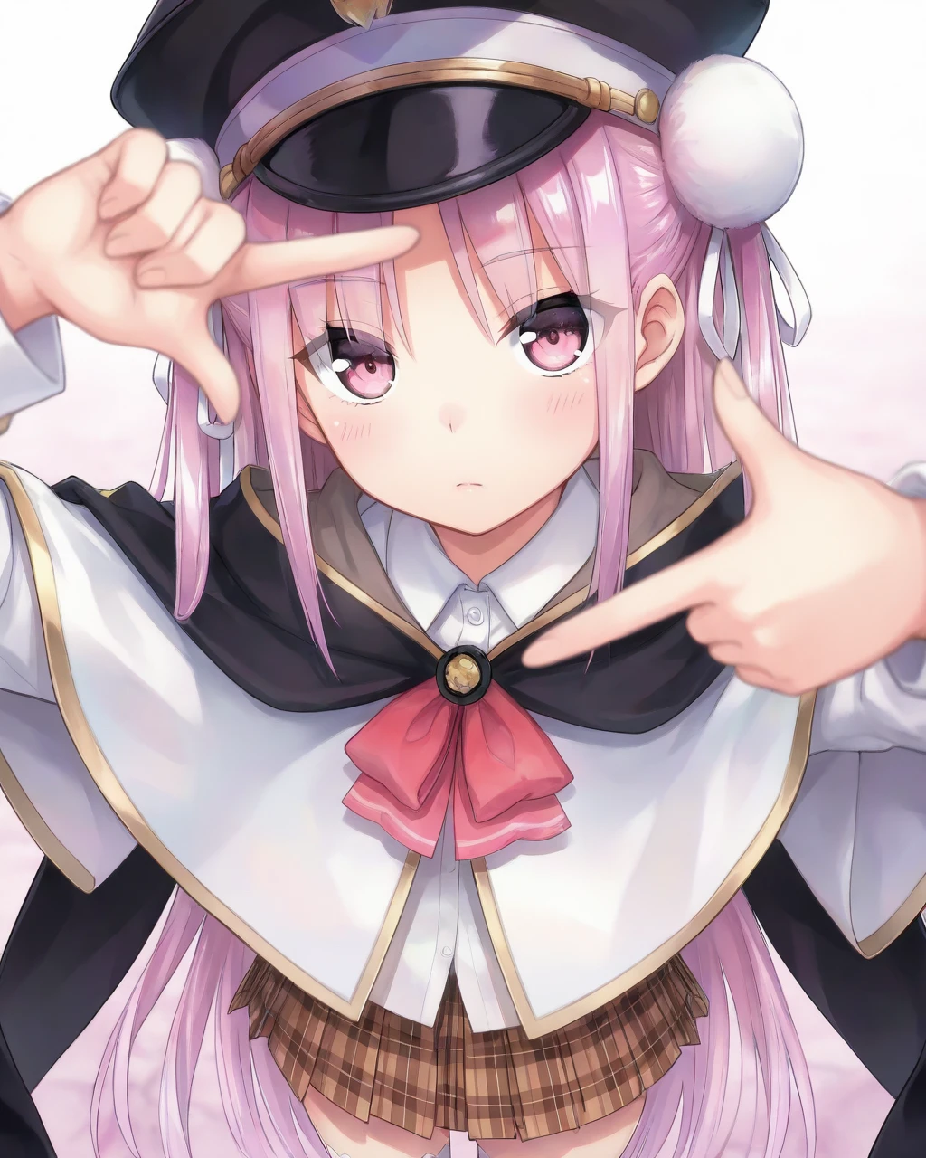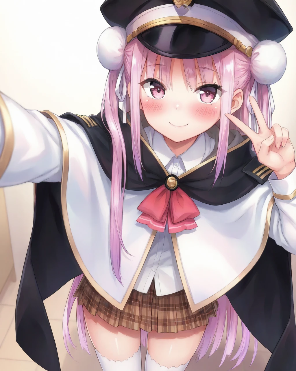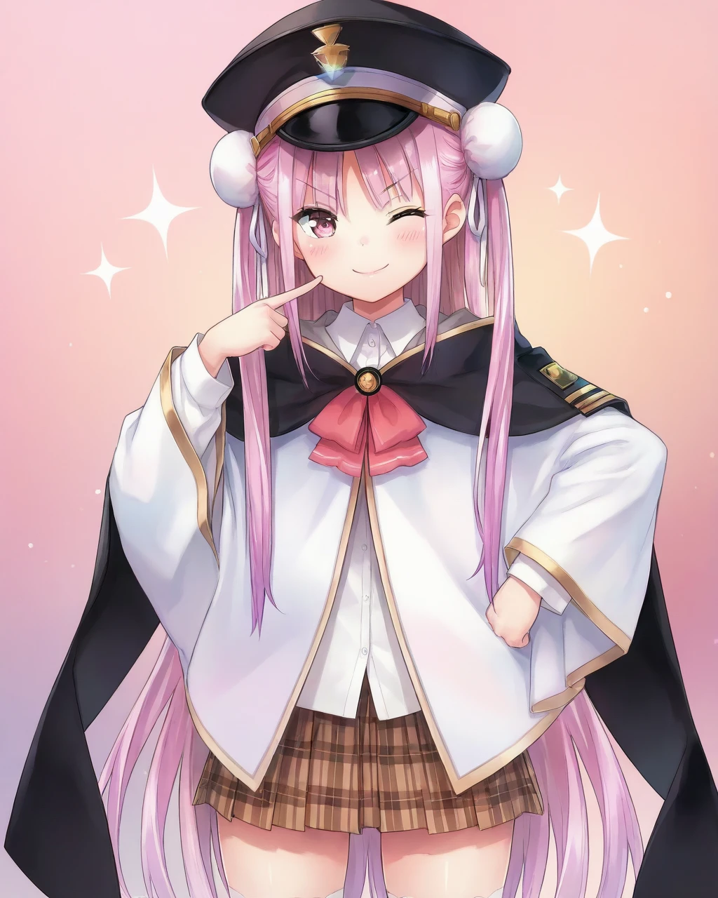 KunimiTama, KunimiTama_def, pink hair, very long hair, hair bun, double bun, white hair ribbon, two side up, black hat, military hat, white shirt, long sleeves, white capelet, black cape, brown skirt, miniskirt, plaid skirt, pleated skirt, white thighhighs, zettai ryouiki, boots, black boots,