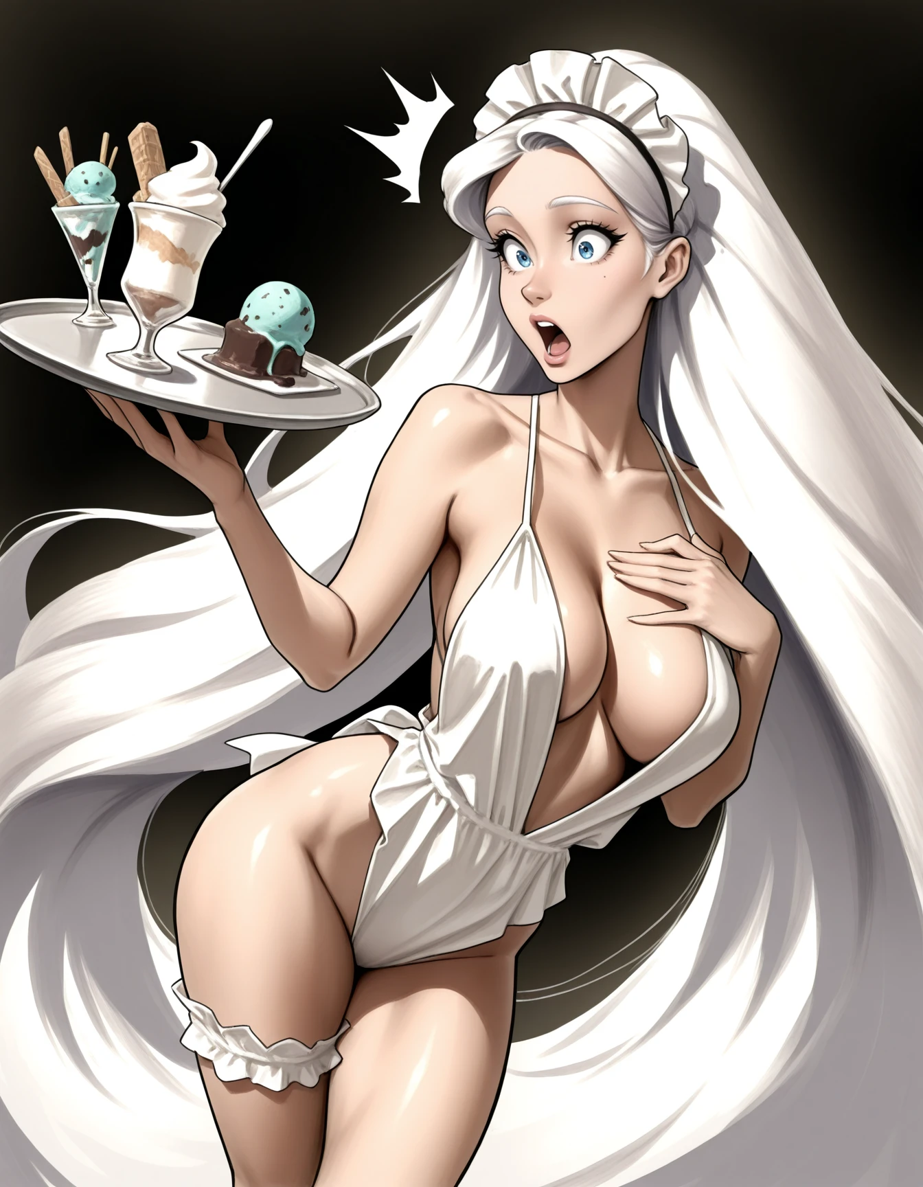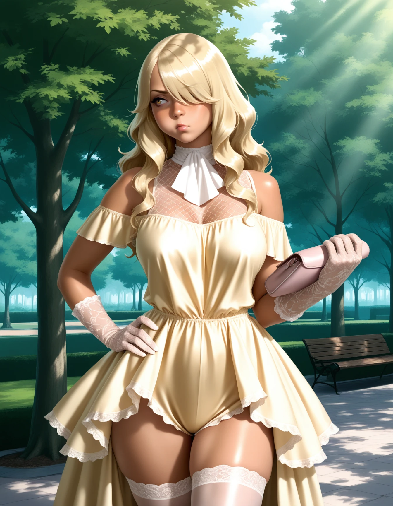 satin romper, plunging neckline, collarbone, sleeveless, highleg, thighs, frilly trim
