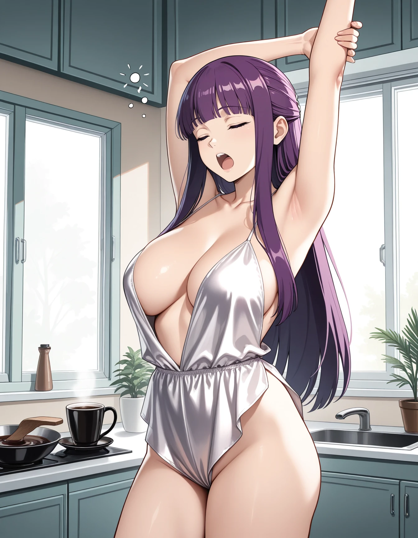 satin romper, backless outfit, criss-cross_back-straps, , sleeveless, highleg, thighs, frilly trim