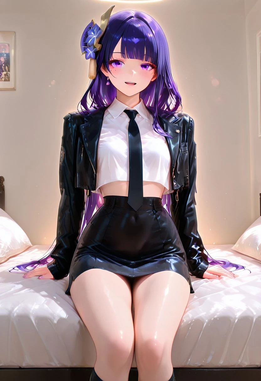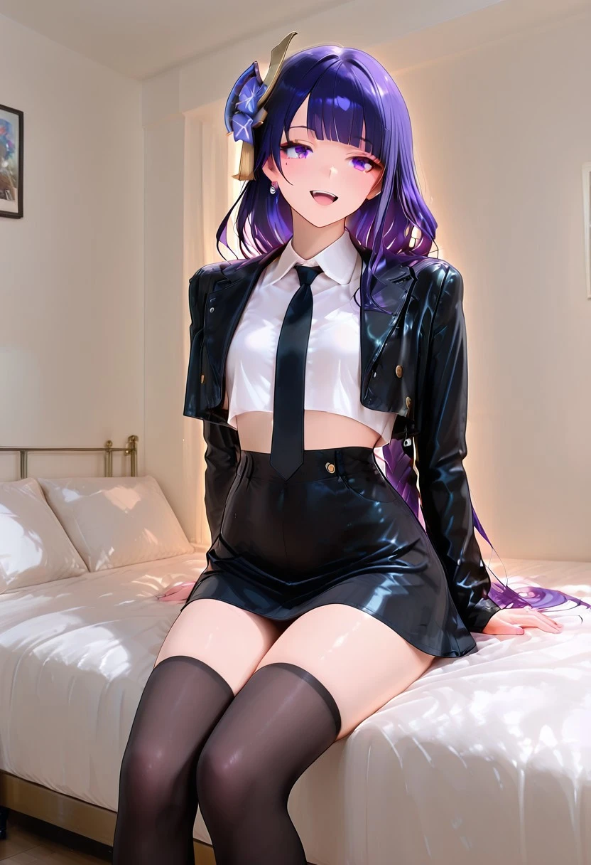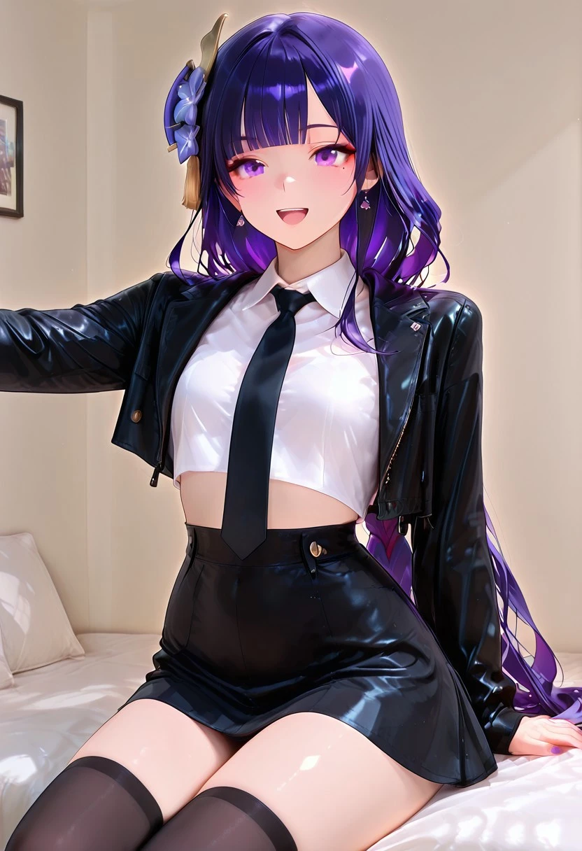 black cropped jacket, white button-up shirt, black tie, high-waisted black pleated mini skirt, black over-the-knee socks