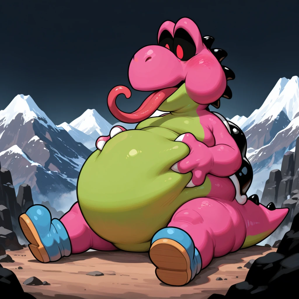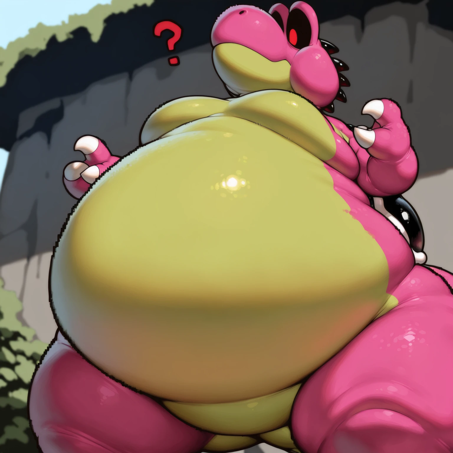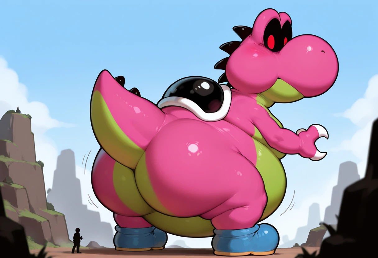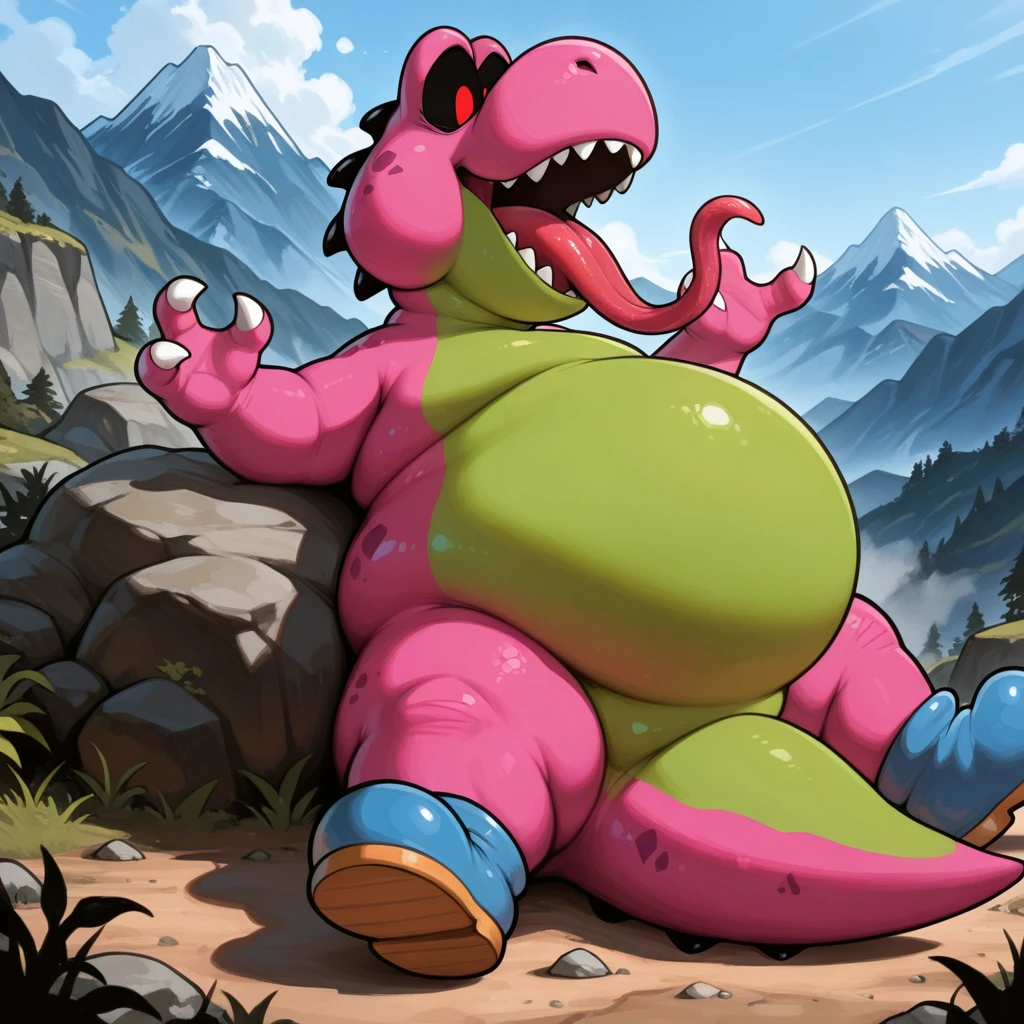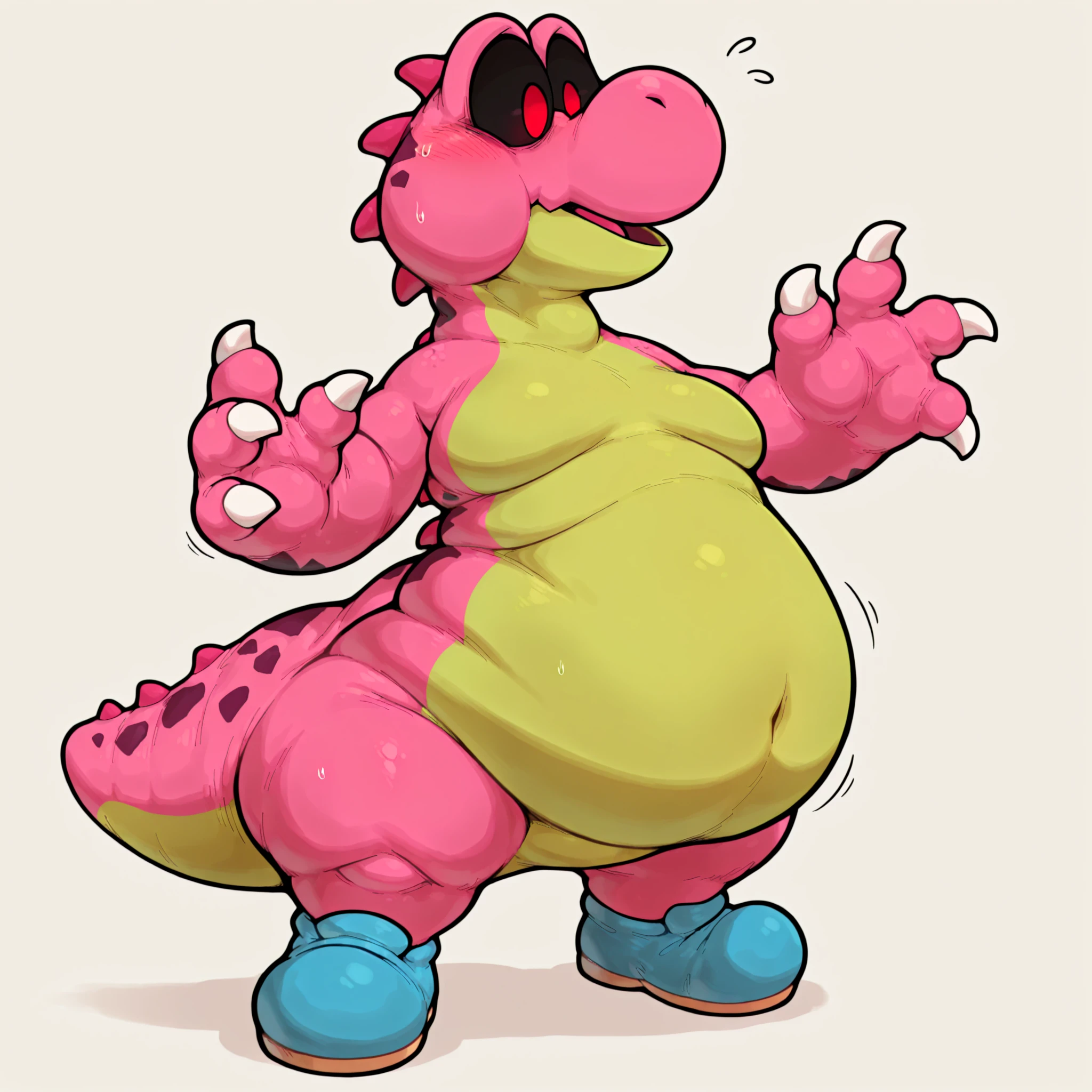 tags: dinosaur, pink skin, large snout, red eyes, black sclera, fat, clawed hand, alien, chubby face, moobs, blue shoes, black shell