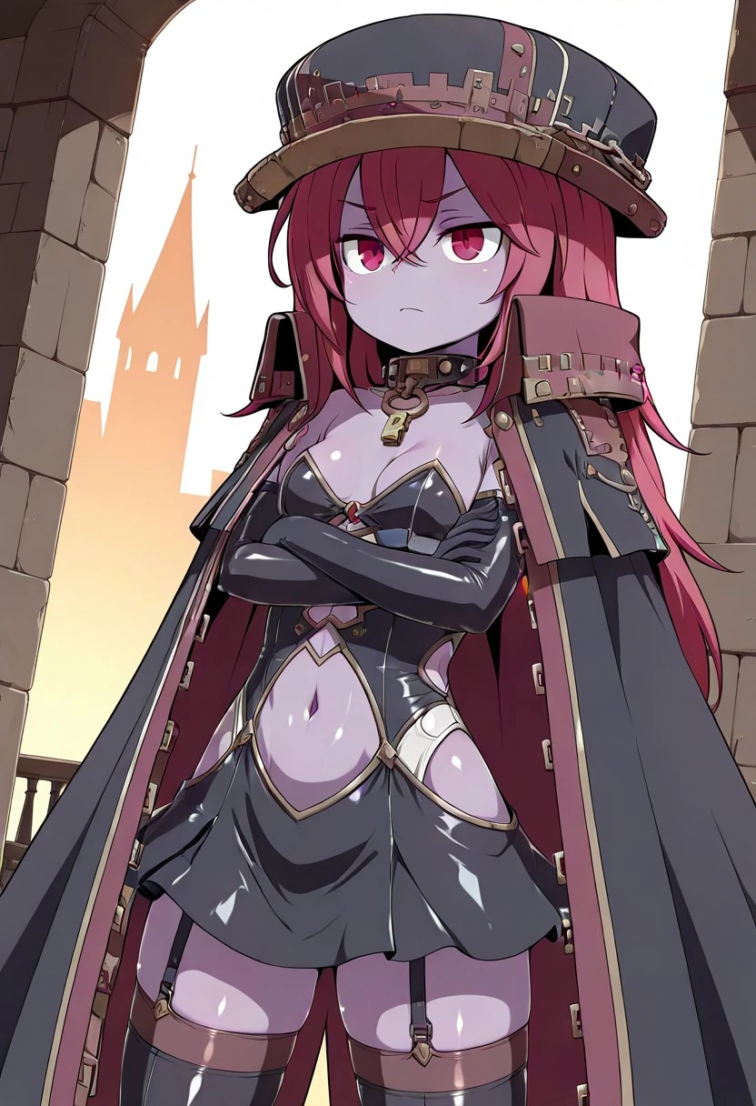 Dita_Ariest, 1girl, solo, hat, hat with chain, thighhighs, elbow gloves, gloves, red eyes, long hair, garter straps, crossed arms, colored skin, purple skin, red hair, black thighhighs, breasts, purple skin, cape, cape with a large collar, studded collar, choker, choker with key, navel, navel cutout, bare navel, bare flank, bare shoulders, black strapless dress, shiny clothes, shiny skin, white micro bikini, white underwear