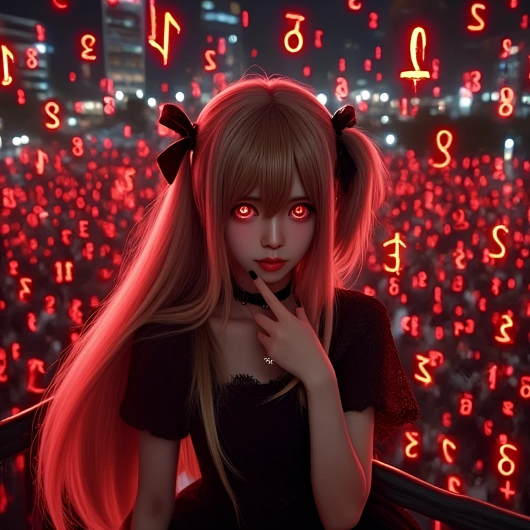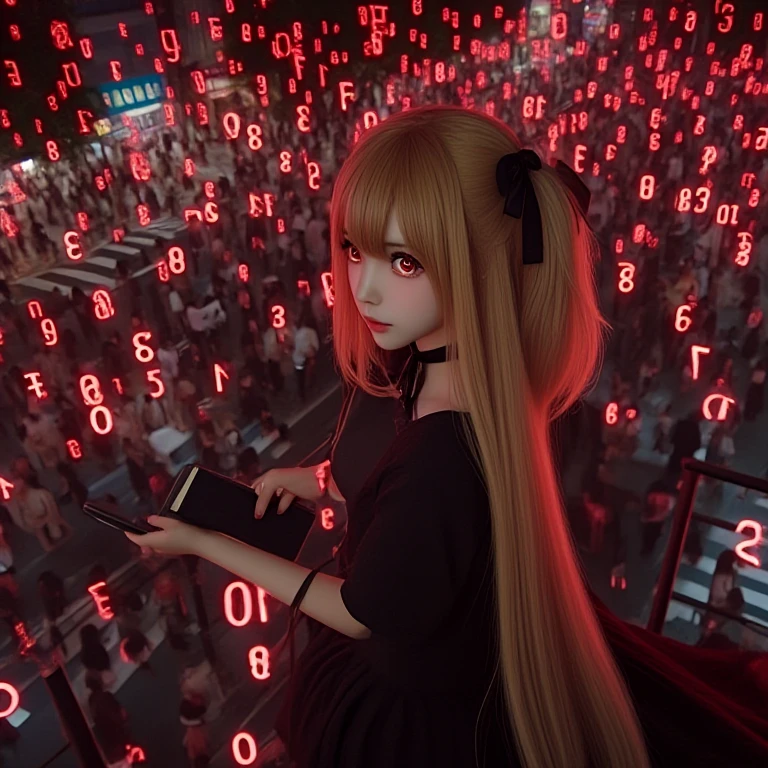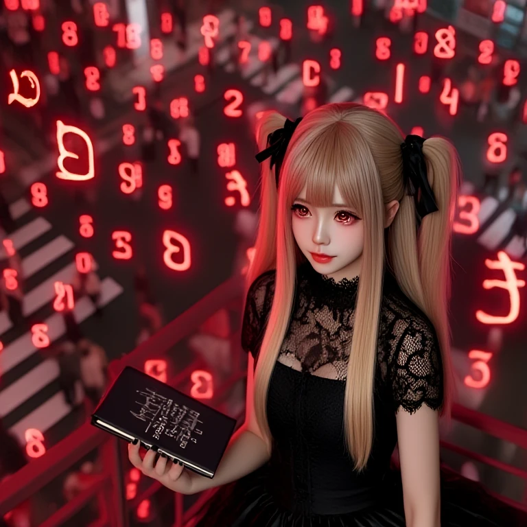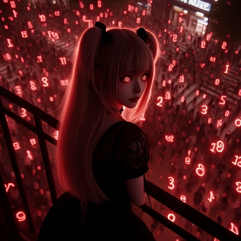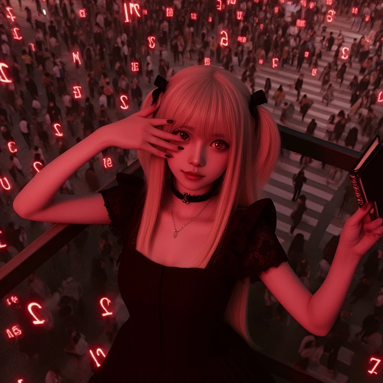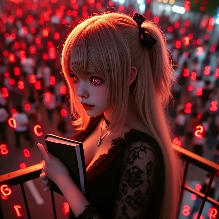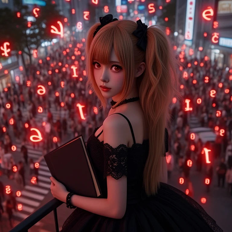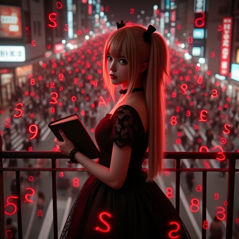 amane misa, death note, red numbers, scribble numbers, realistic, sad, tears, crying, tearing up, 1girl, idol, skinny, kawaii, japanese female, brown eyes, red eyes, shinigami eyes, gothic dress, two side up, blonde hair, very long hair, cross necklace, black nails, black choker, black ribbon, black book, short sleeves, cleavage, breasts, night, city, crowd, tokyo, railing, balcony, crosswalk, overlooking, looking back, from behind, from above, light particles, red filter,