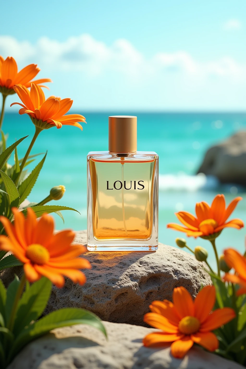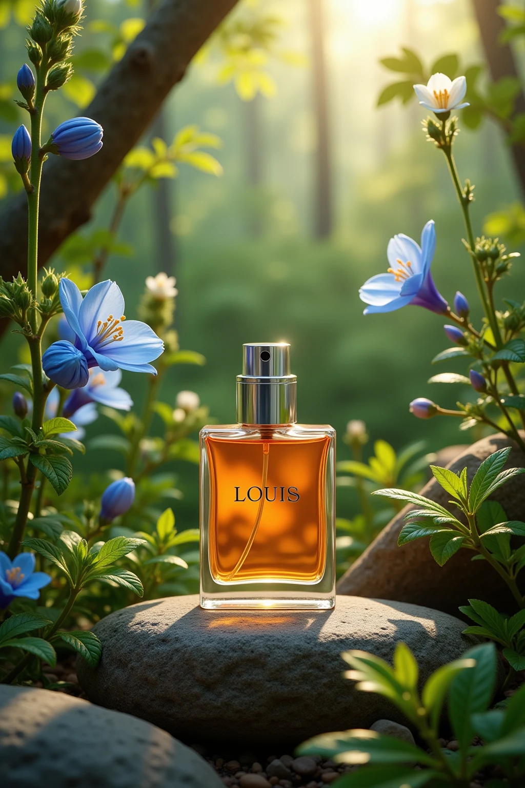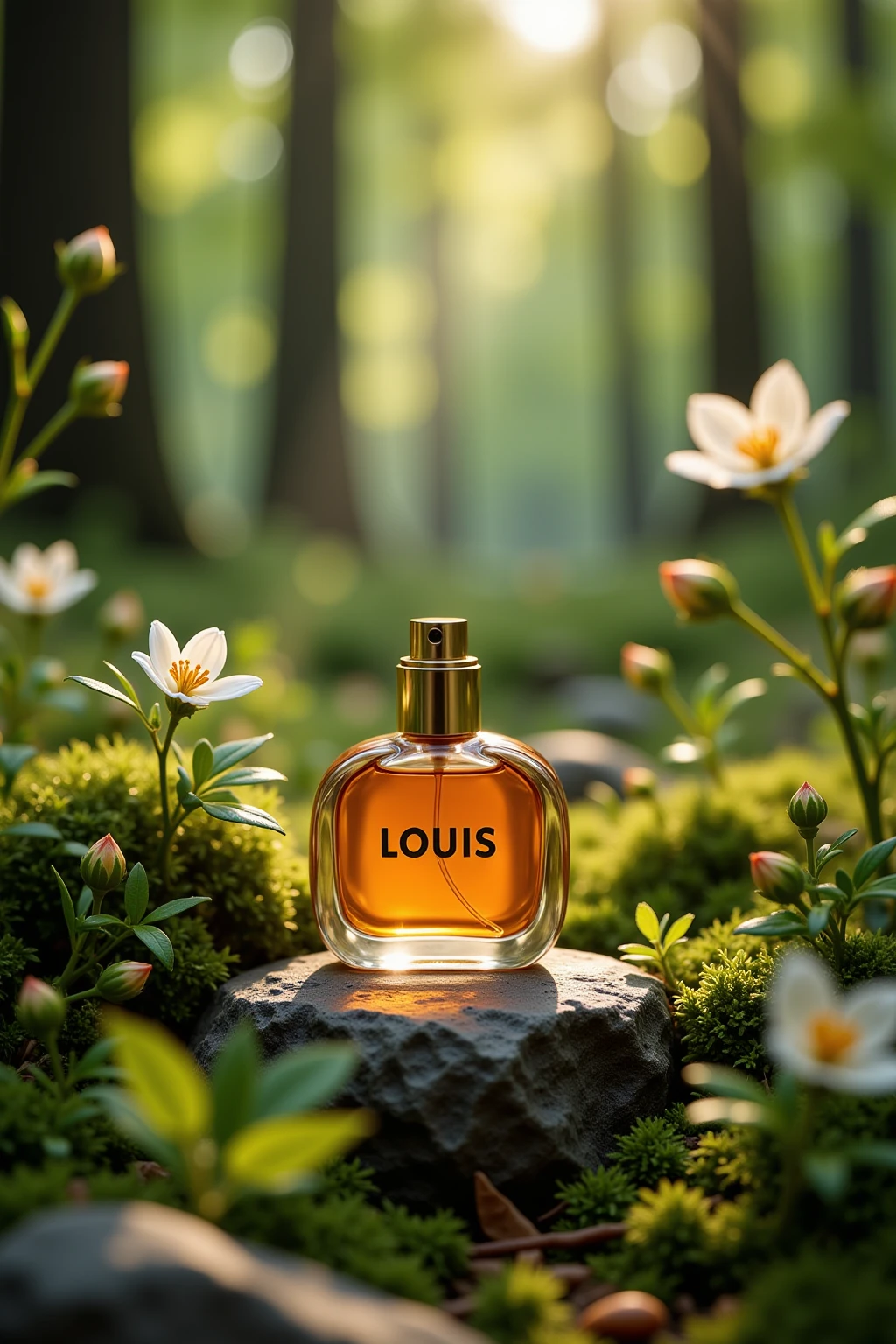 changjing, In the outdoor forest, a small bottle of perfume filled with orange liquid is surrounded by green plants around the stone, blooming flowers and buds, dotted with green branches and leaves. There is a pressure pump head on the top of the perfume bottle. The brand name "LOUIS" is written on the bottle of perfume. Natural light, high-quality masterpiece. Photography Master, 8k