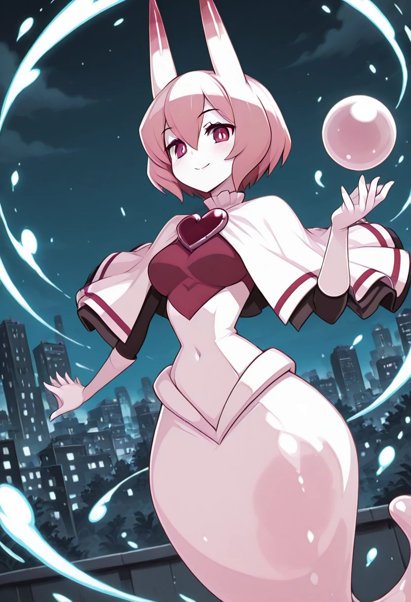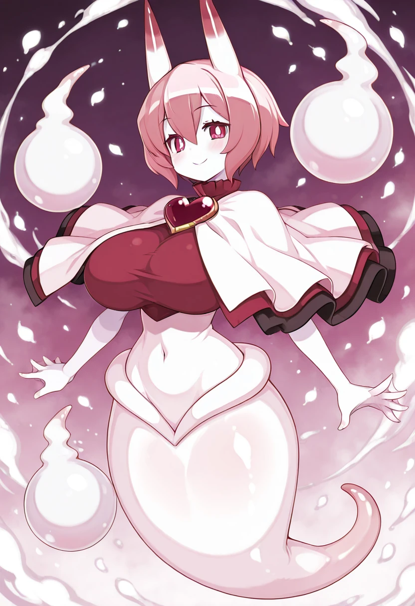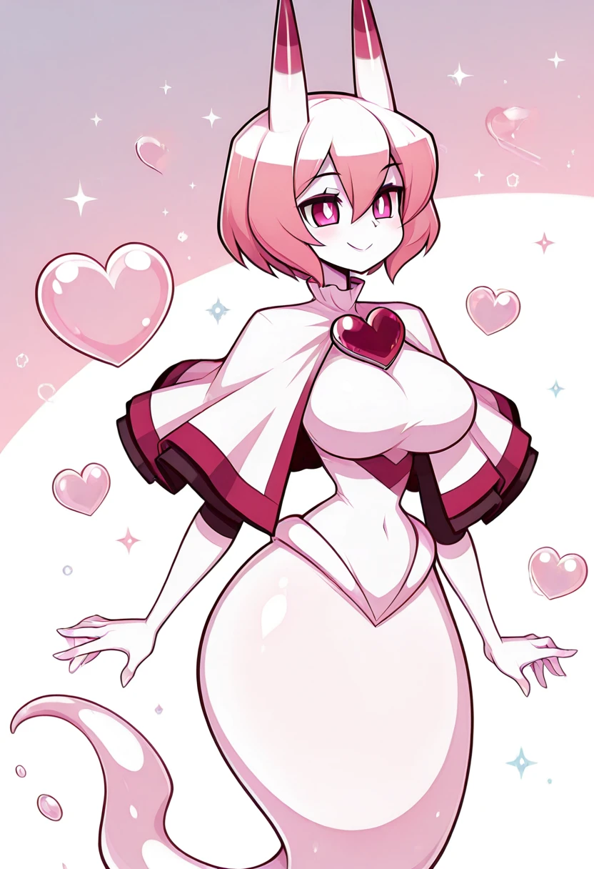 zzSeaAngel, pink eyes, pink hair, short hair, hair between eyes, horns, white skin, bright pupils, heart brooch, jewelry, pink capelet, ghost tail,