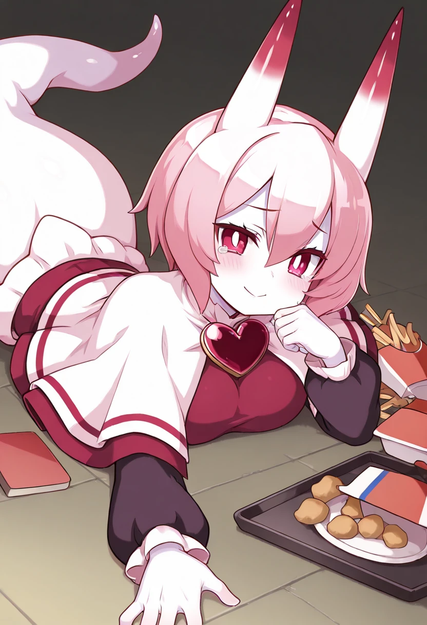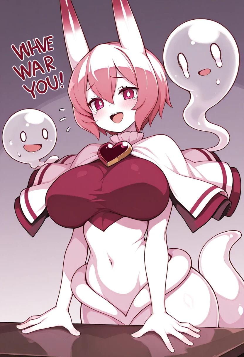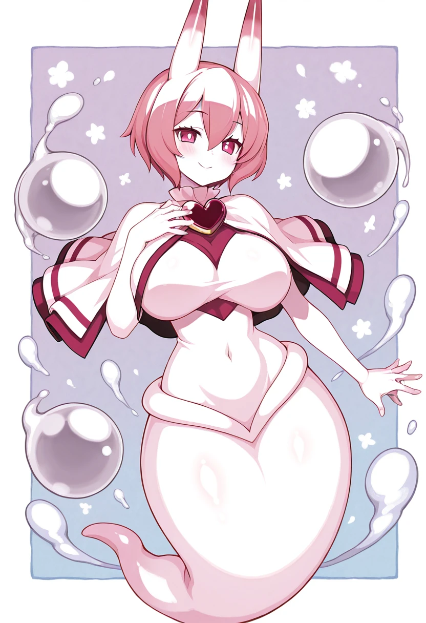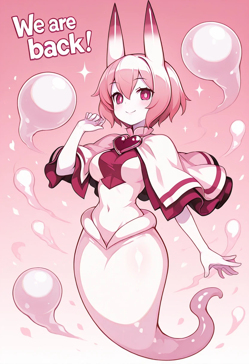 zzSeaAngel, pink eyes, pink hair, short hair, hair between eyes, horns, white skin, bright pupils, heart brooch, jewelry, pink capelet, ghost tail,