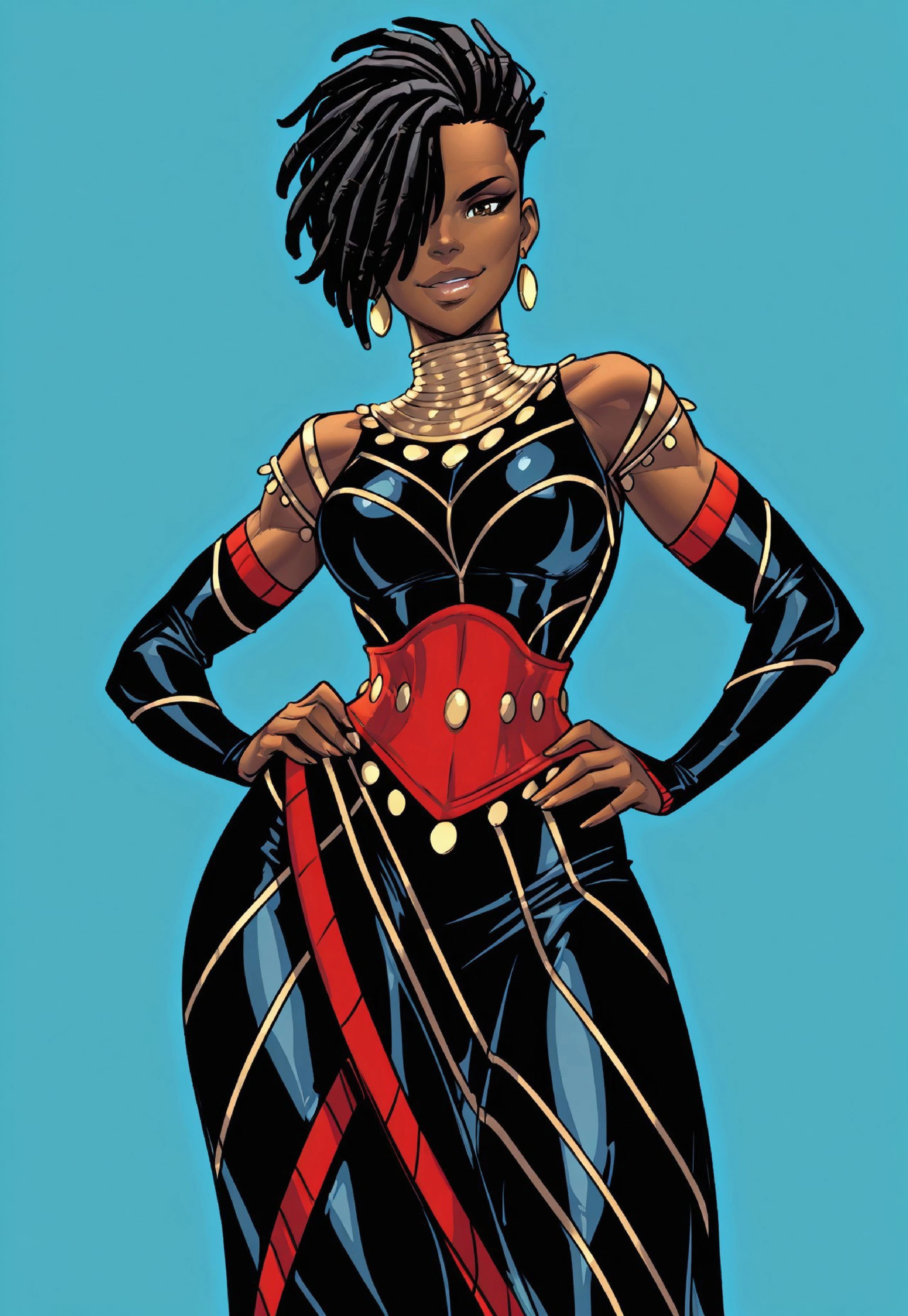 2d, 1girl, solo, Queen_Okoye, dark-skinned female, ebony female, brown eyes, black hair, dreadlocks, hair over one eye, gold earrings, African neck rings, detached sleeves, black dress, red corset, gold trim, black pants, leg slit, armored boots,