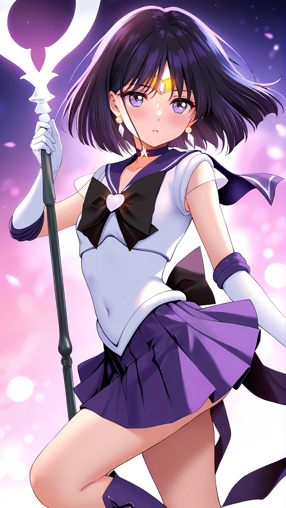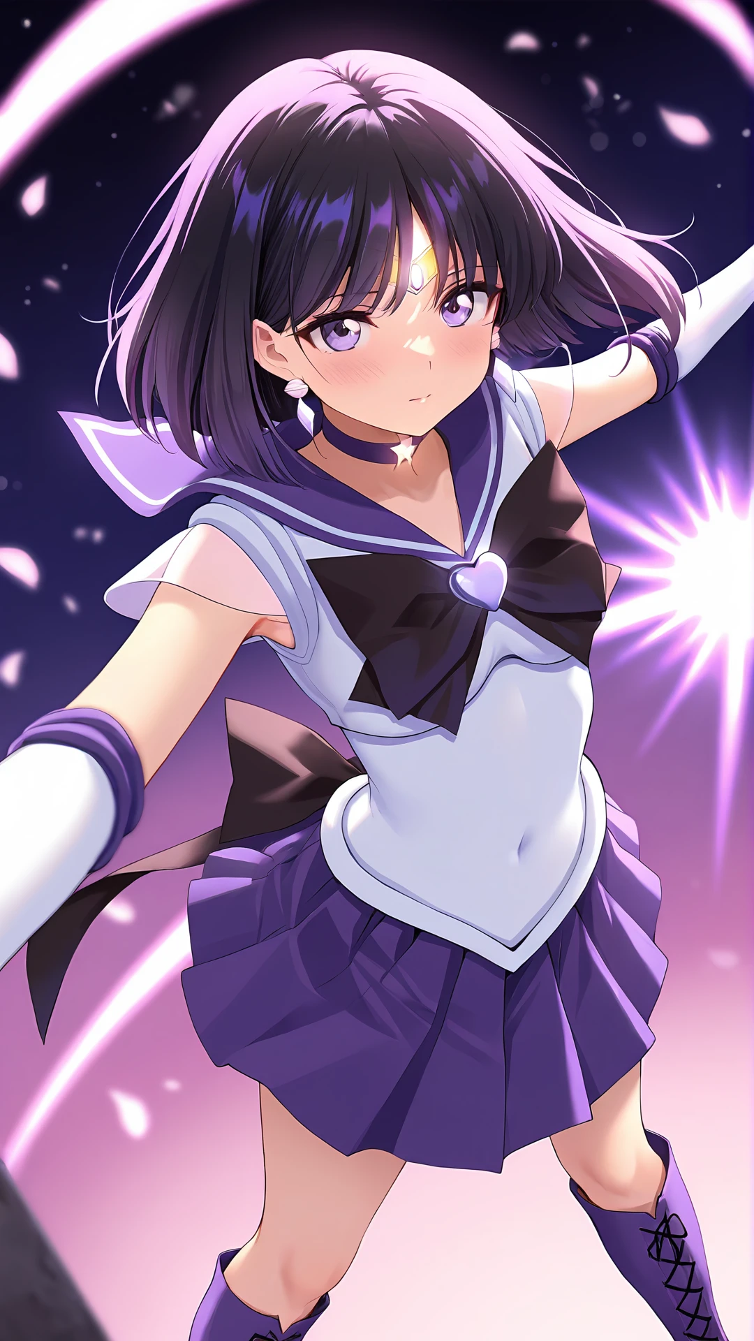 Tomoe Hotaru, sailor saturn, 1girl, magical girl, sailor senshi uniform, black hair, short hair, purple eyes, sailor collar, purple sailor collar, skirt, purple skirt, pleated skirt, gloves, white gloves, elbow gloves, choker, star choker, jewelry, earrings, bow, black bow, back bow, brooch, star brooch, tiara, boots, knee boots, lace-up boots, purple footwear