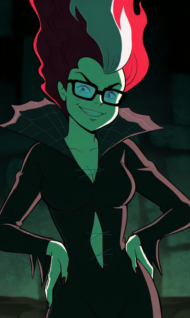 1girl, solo, frankencreepy_velma, glasses, fiery hairstyle with white highlights, long form-fitting black dress, cleavage, red painted nails